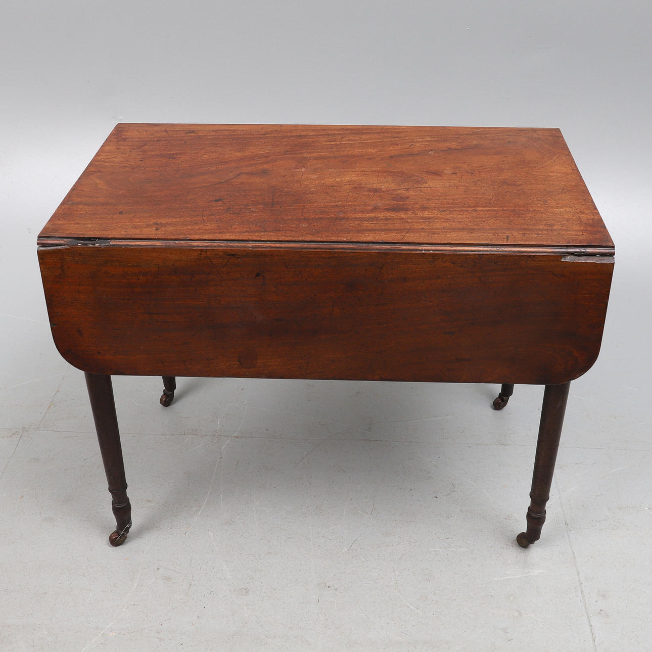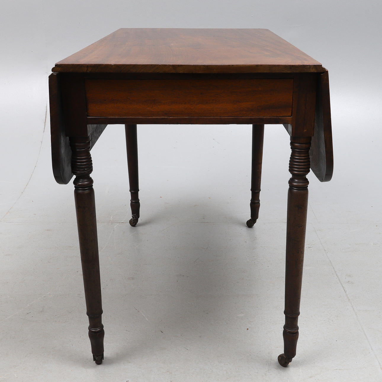 återställd, med gångjärn rundade droppblad, på ringvända ben, 91 cm bred x 50 cm djup x 72 cm hög, 99 cm x 90 cm förlängd