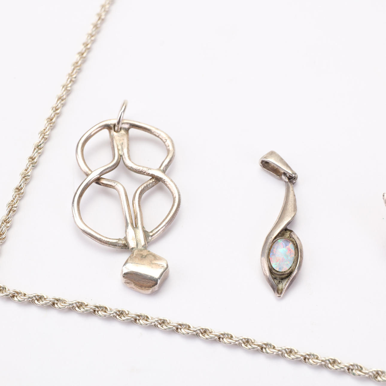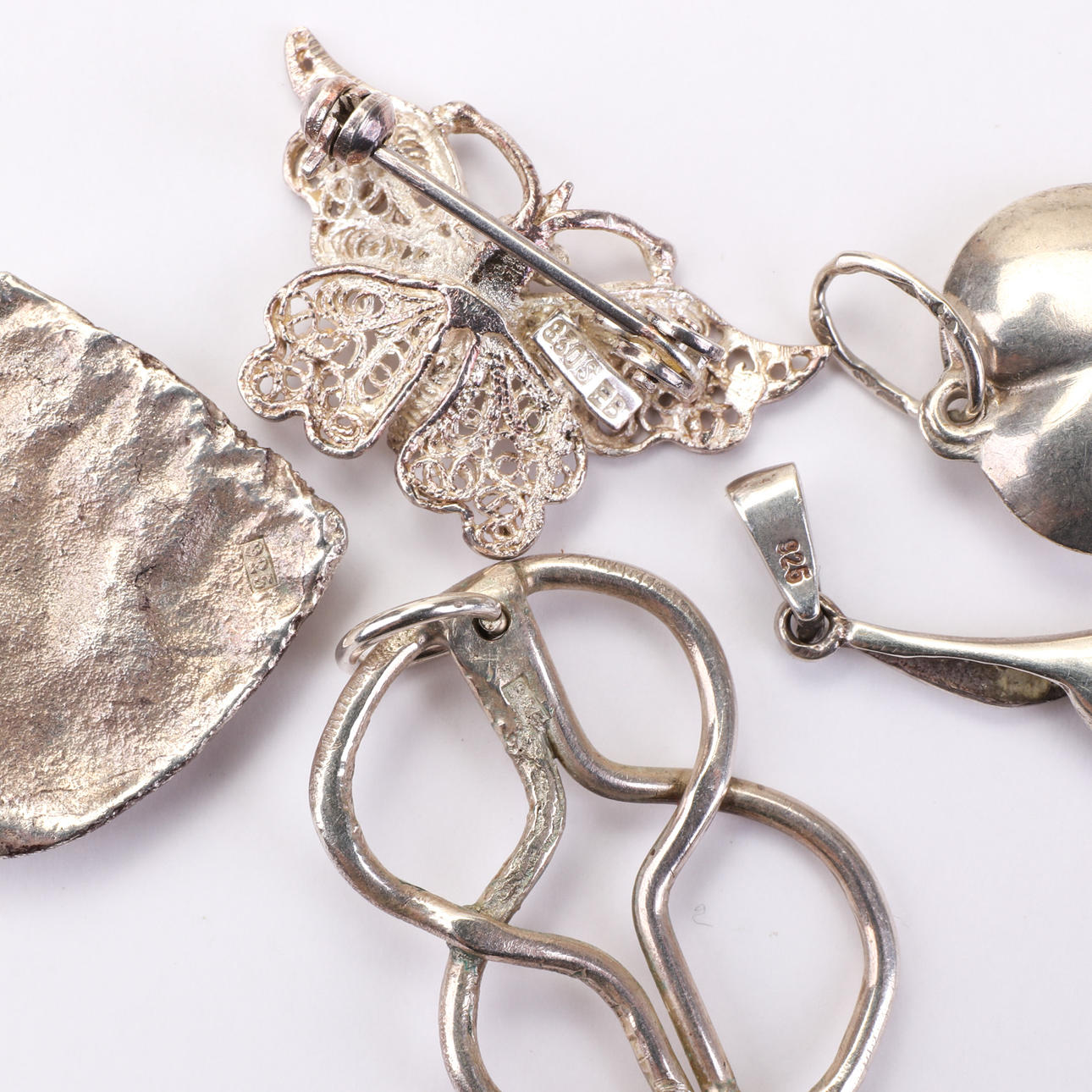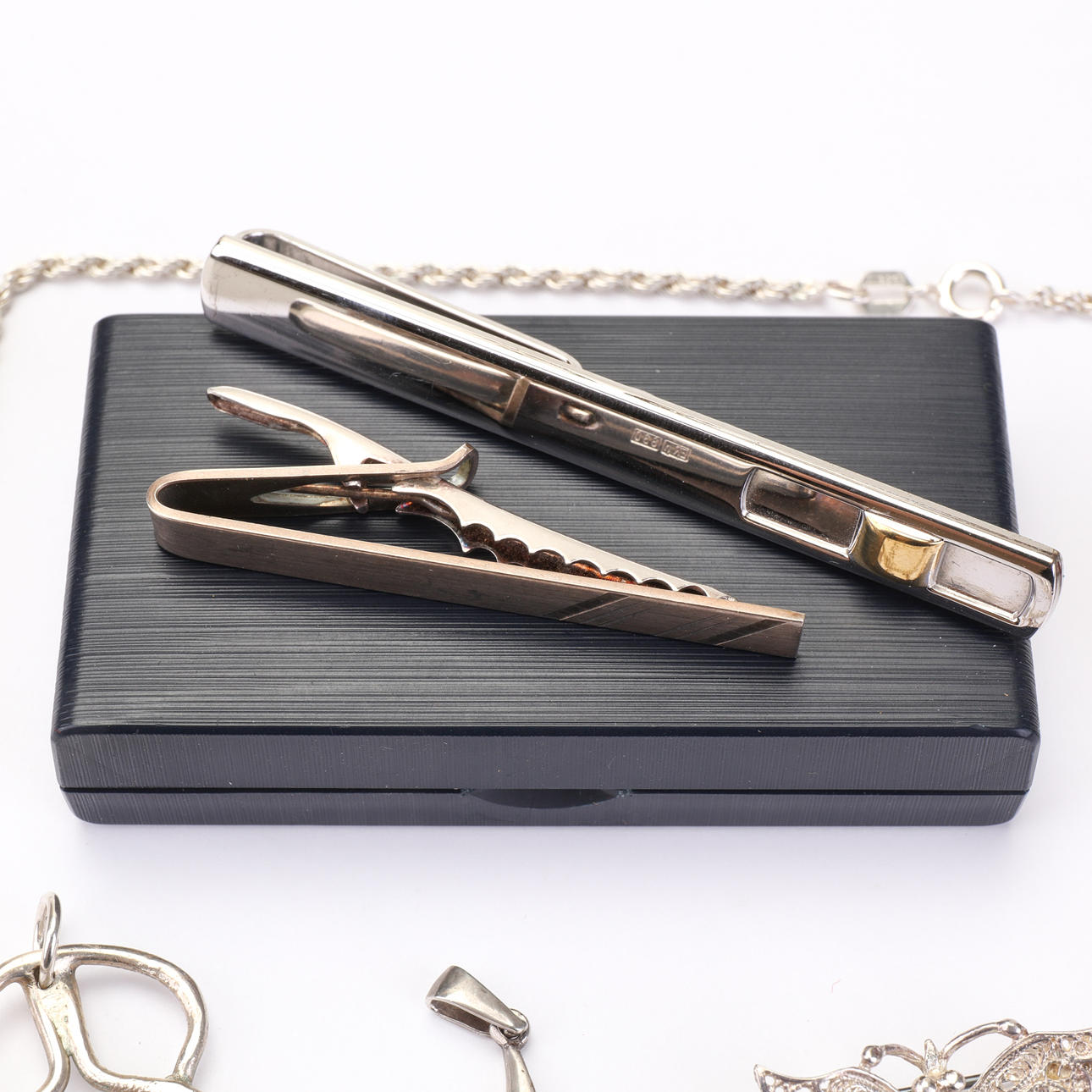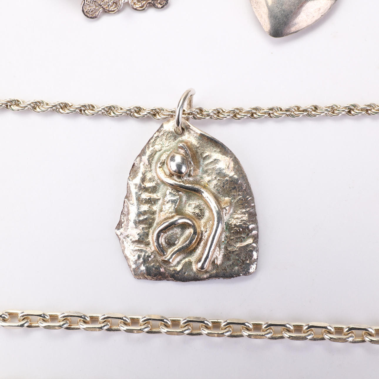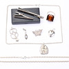 Blandade silversmycken för både herr och dam. 2 slipsnålar, ankarkedja, cordellkedja, hängsmycken, bärnstensring, opal hänge, silverhjärta, filigrand brosch.