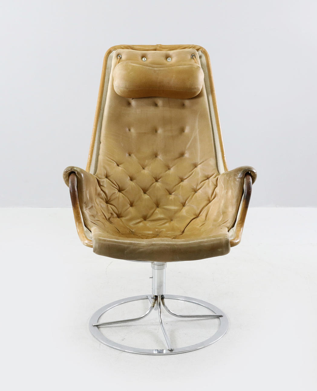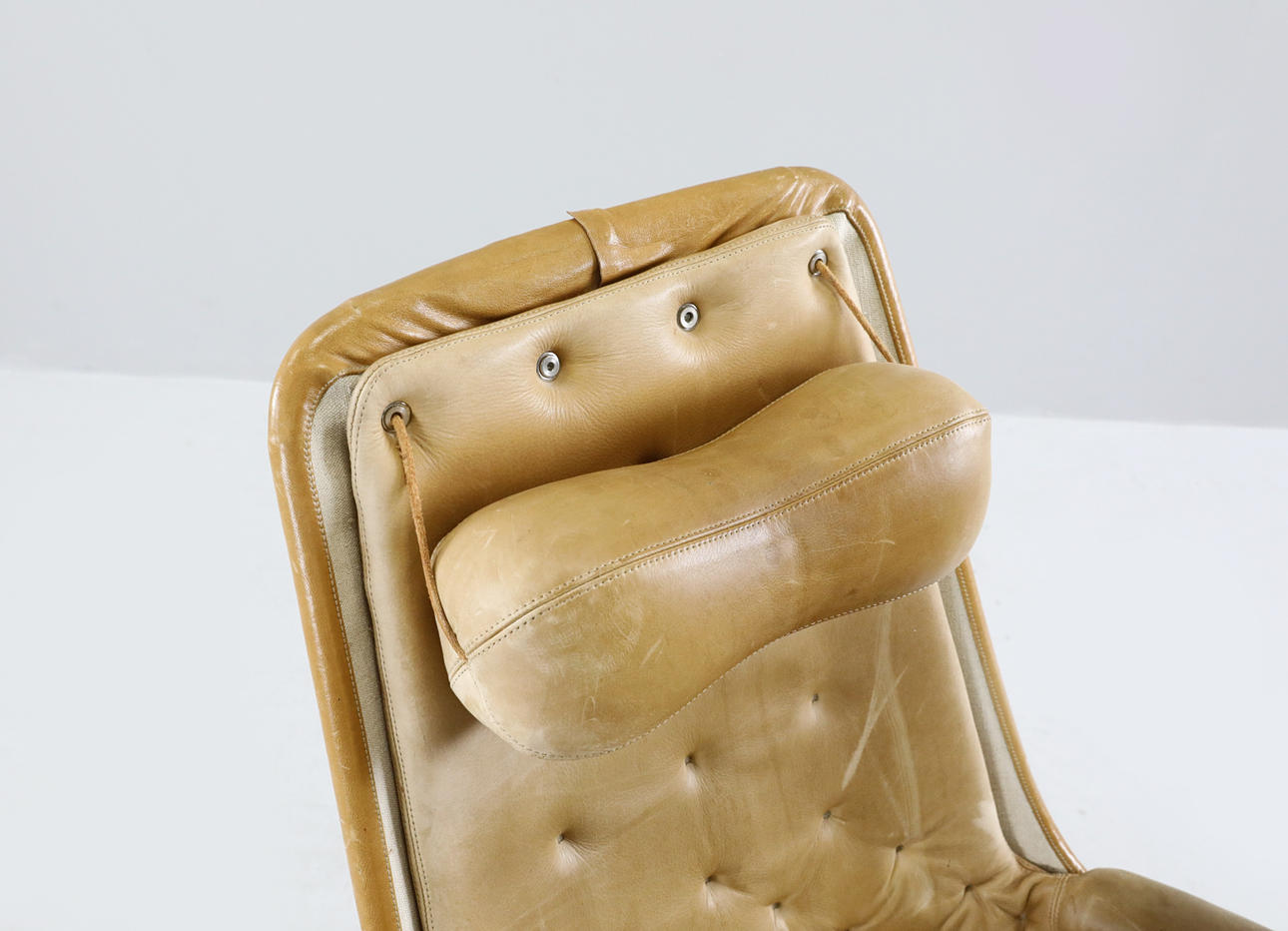 Benställning av kromad metall. Löstagbar dyna, lös nackkudde. Klädsel av läder.