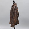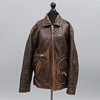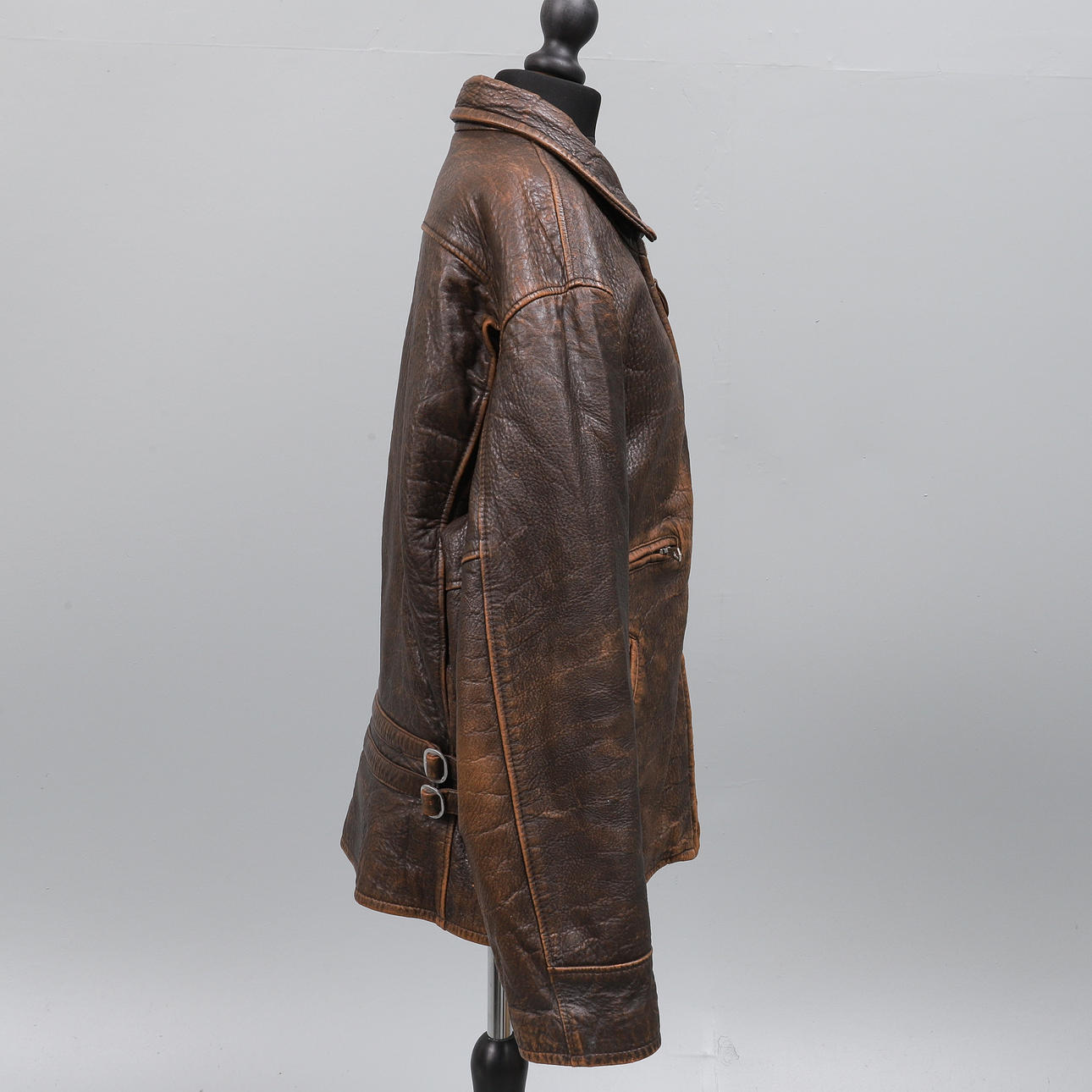 Storlek 52, målmedvetet nödställda kalvskinn, ett quiltat brunt foder med sexkantiga sömmotiv och frontal dragkedja. Två justerbara läderremmar lindas runt ryggen för fastsättning.