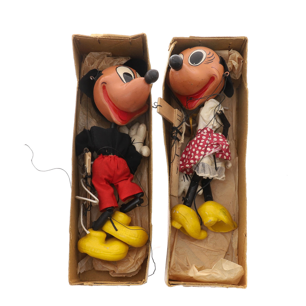 Mickie med små tårar på delar av kläderna, båda har viss missfärgning av kläder och märken på färgen. Mickies lådetikett är sönder.