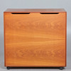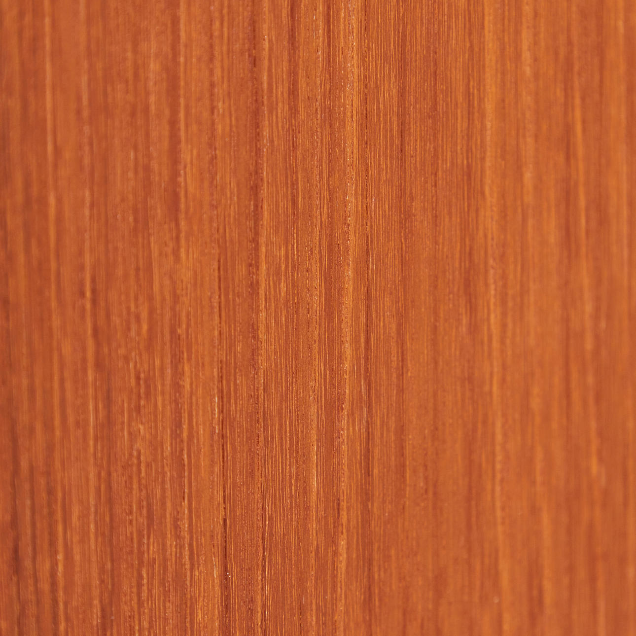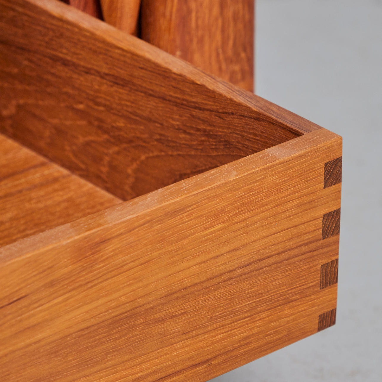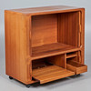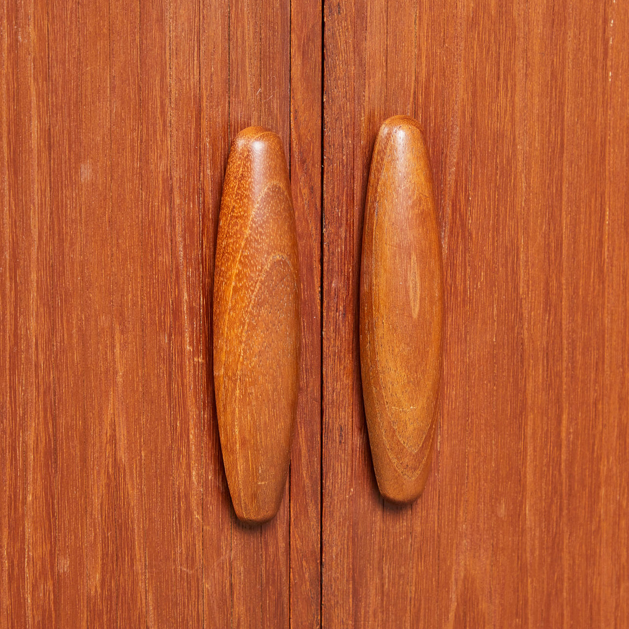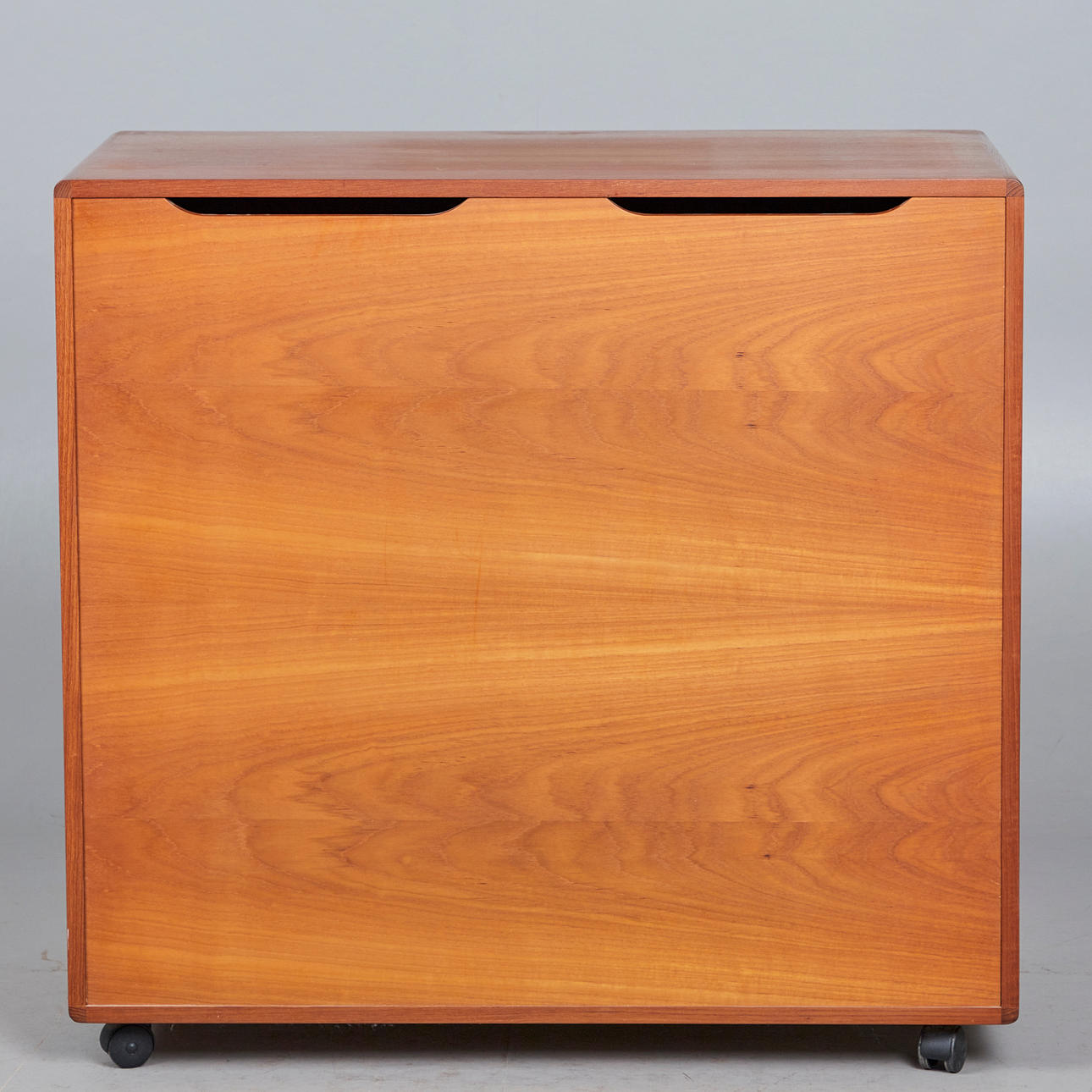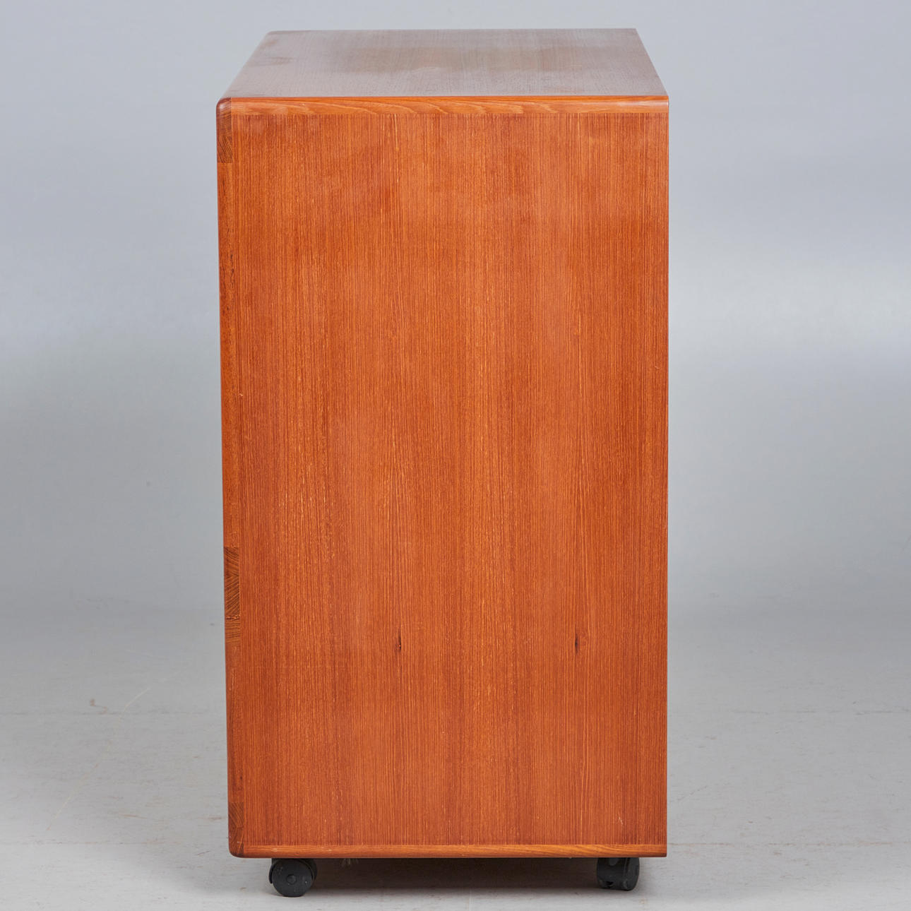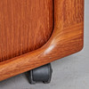 Dyrlund, garderob/highboard, teak, 1970-tal, Danmark. Teak highboard med rektangulär kropp med rundade hörn på fyra svarta plasthjul, utrustade med fyra skjutdörrar med olika hyllor, H.100cm, W.105cm, D.54cm.