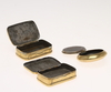 En dosa bär Oscar II monogram, en dosa Skultuna med Stockholmsmotiv, en cirklefomad med mönster.
