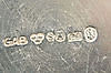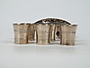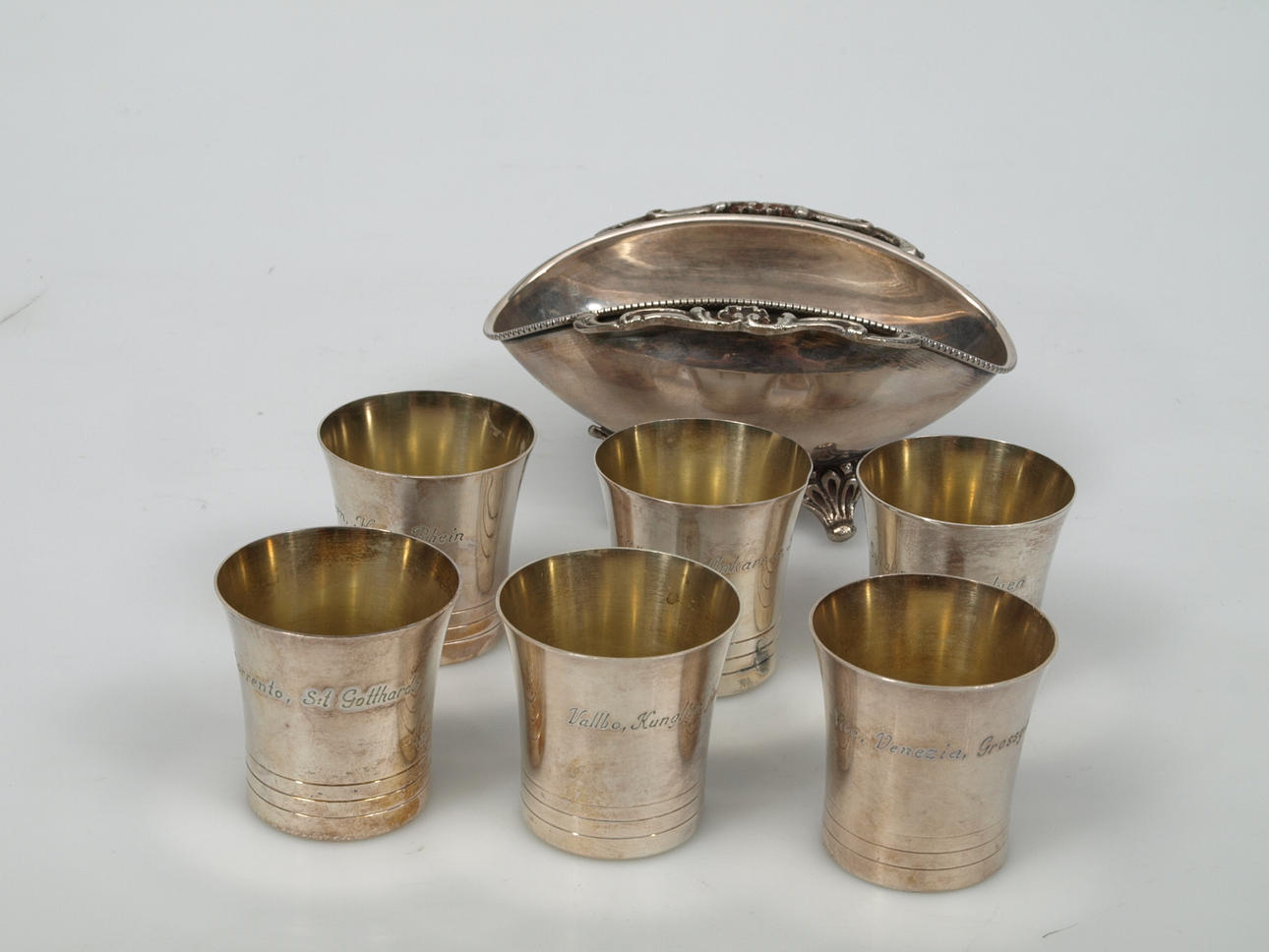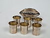 6 små bägare med gravyrer, 172,1 gram. Skål på 4 fötter, 111,7 gram.