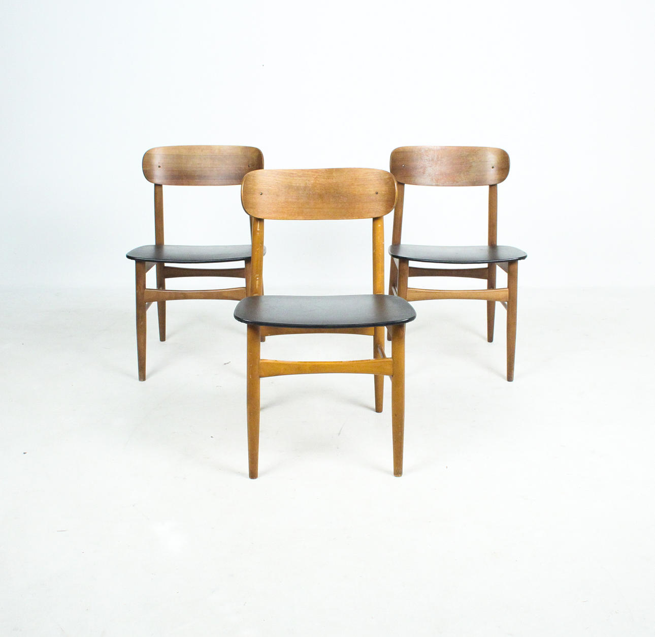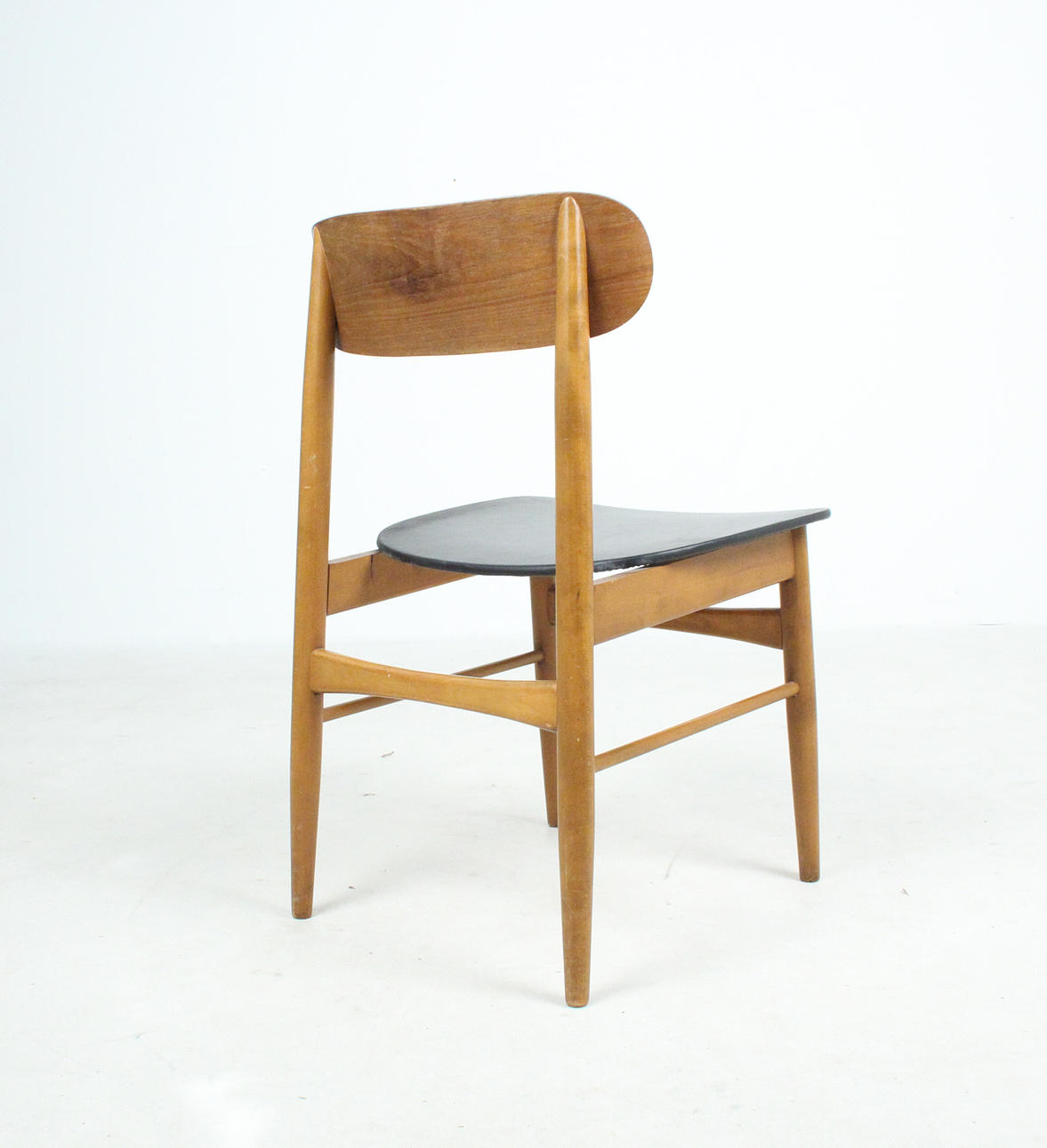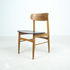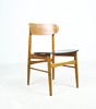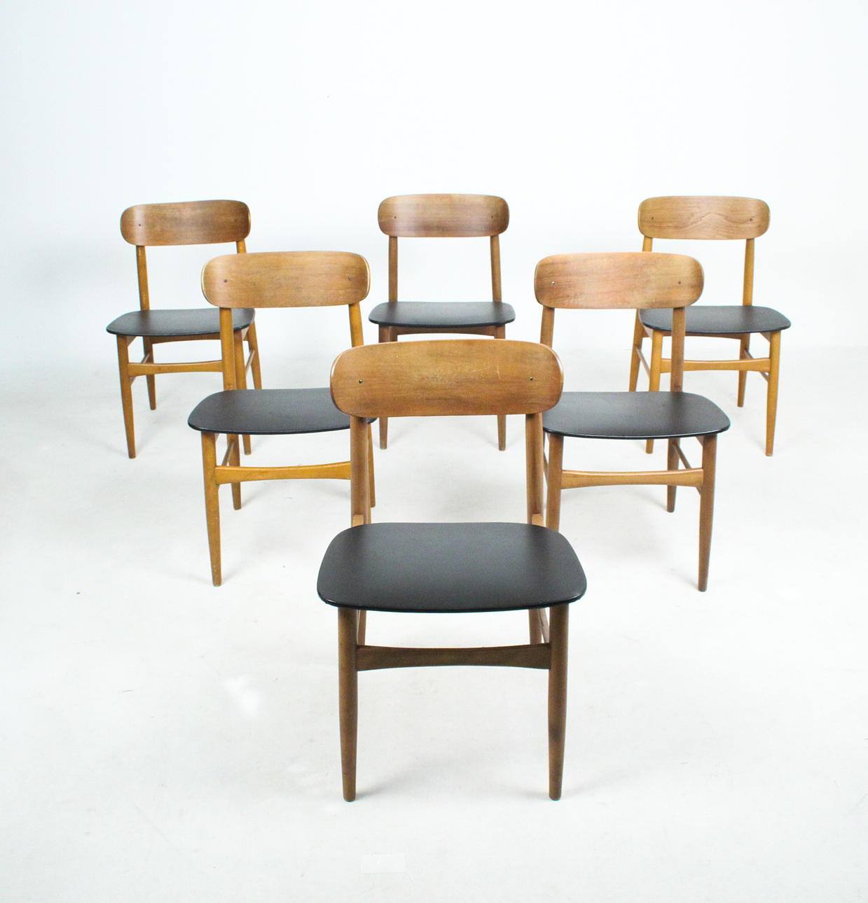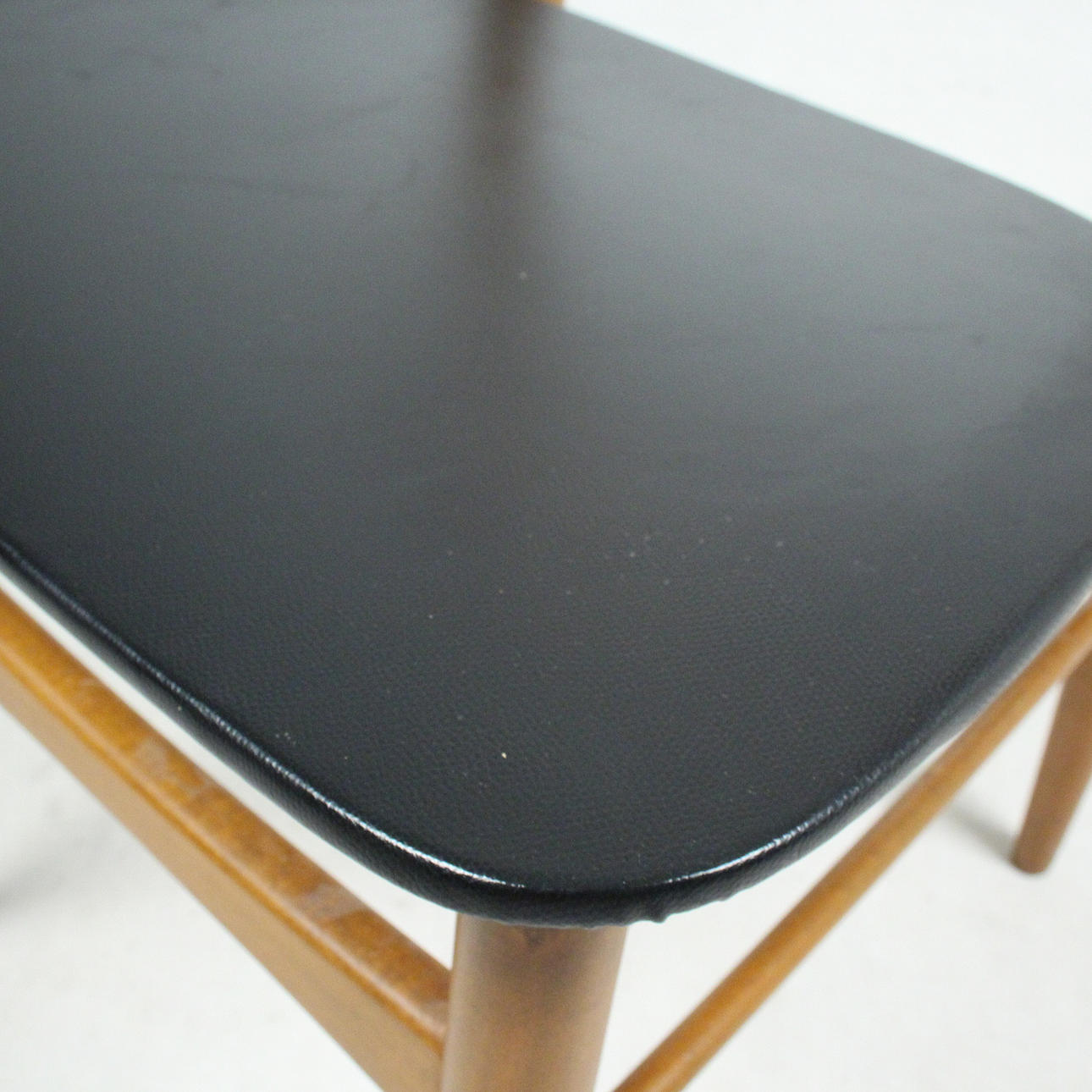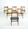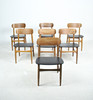 7 x 1960-talet matstolar Massivt träkonstruktion, böjda ryggstöd, säten täckta i svart konstläder.