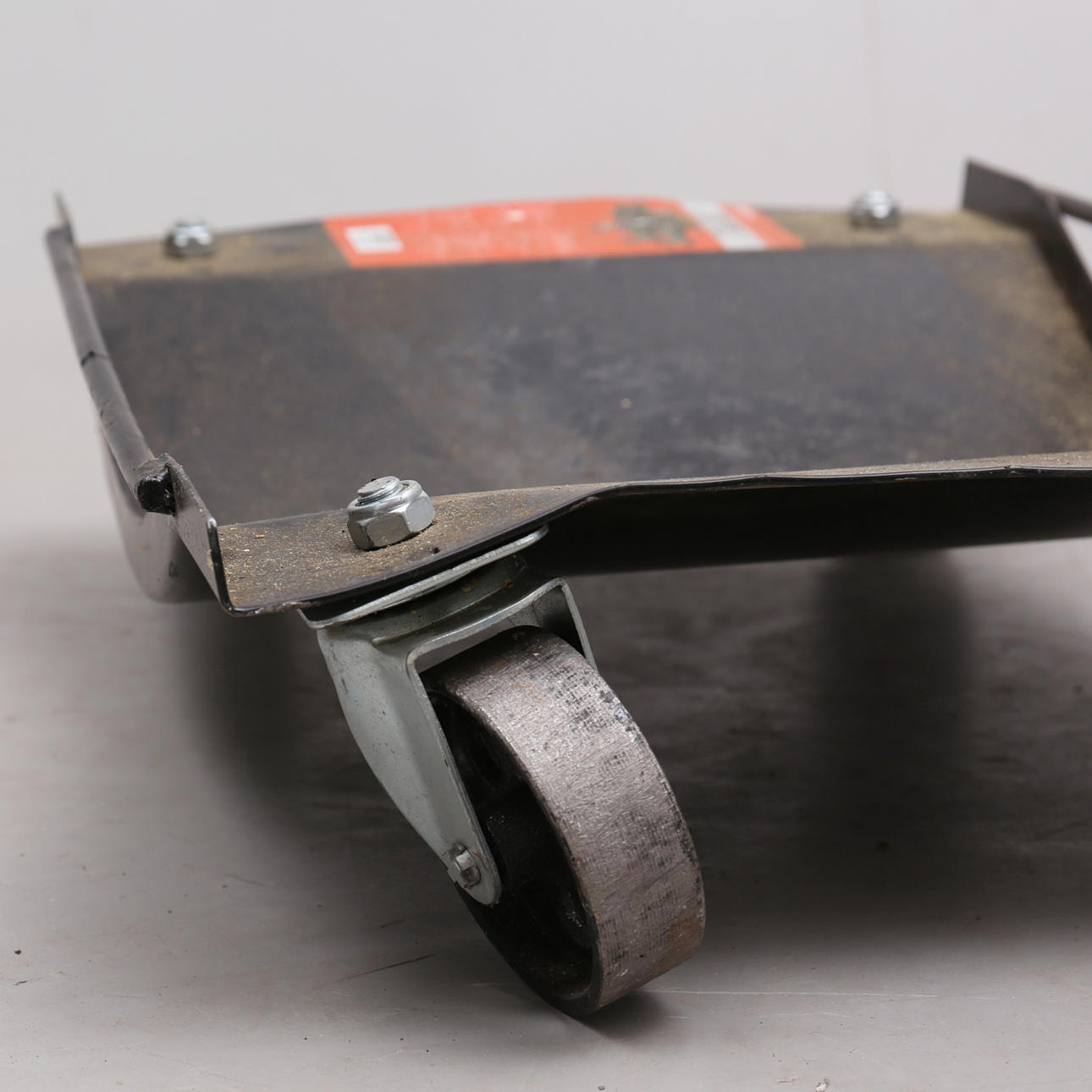 Bruksslitage. En dolly med böjd plåt samt skevt hjul. Ej funktionstestade.