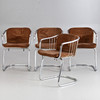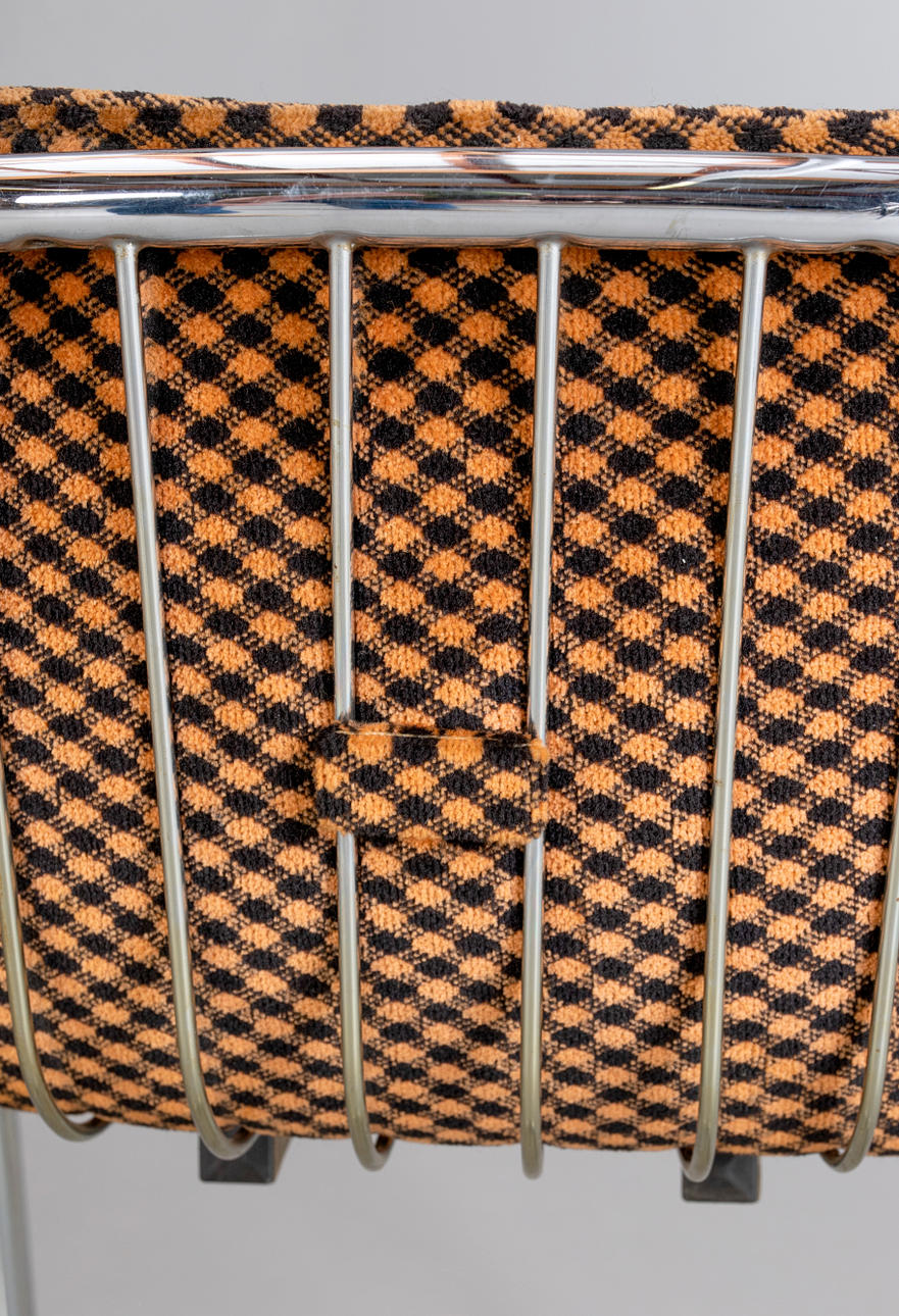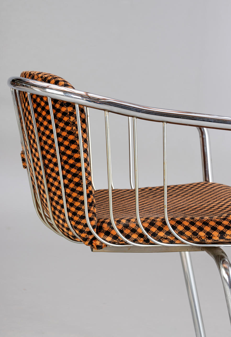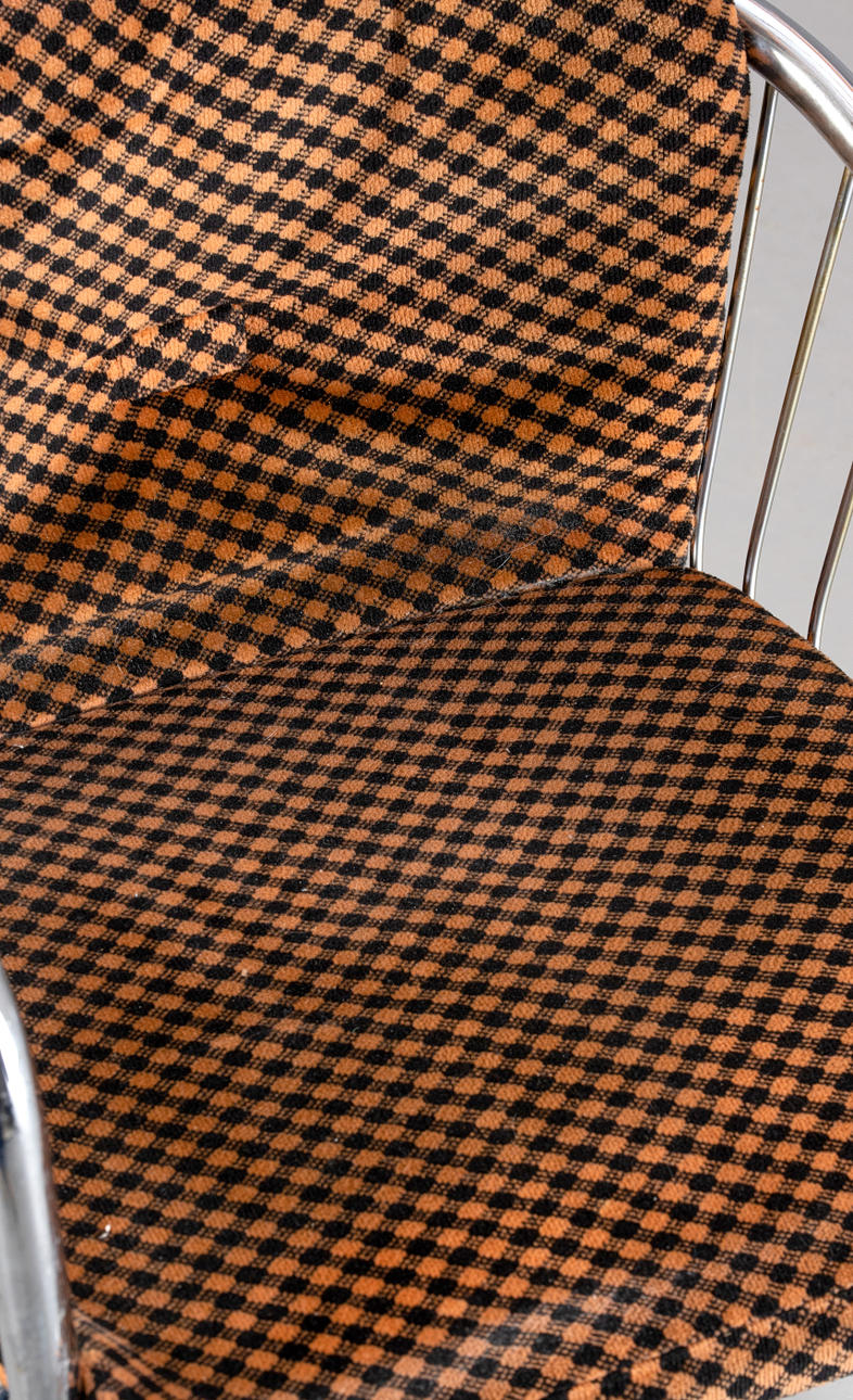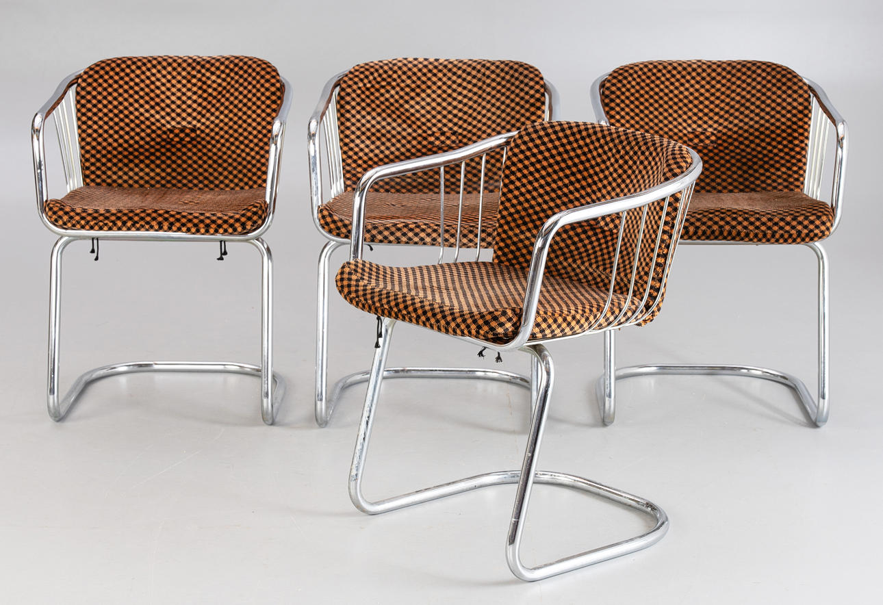 4 cantilever stolar från 1970-talet. Förkromad rörformig stålram med lösa orange-bruna rutiga sittdynor.