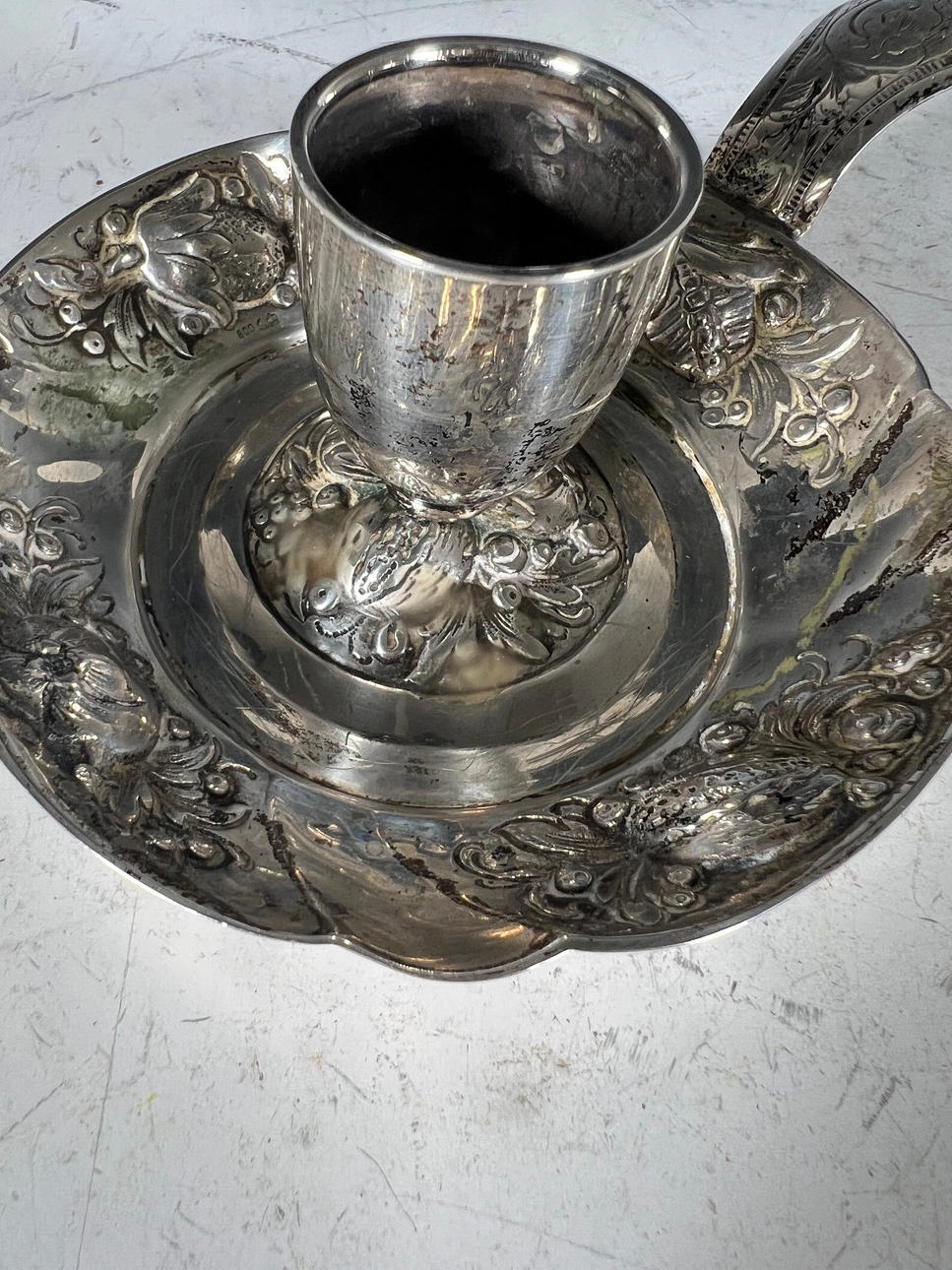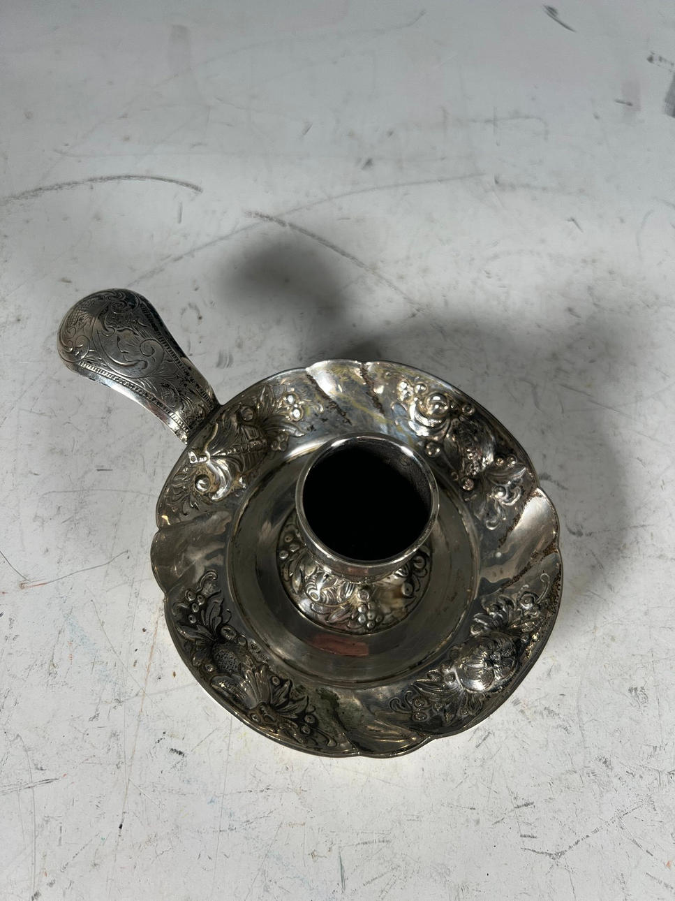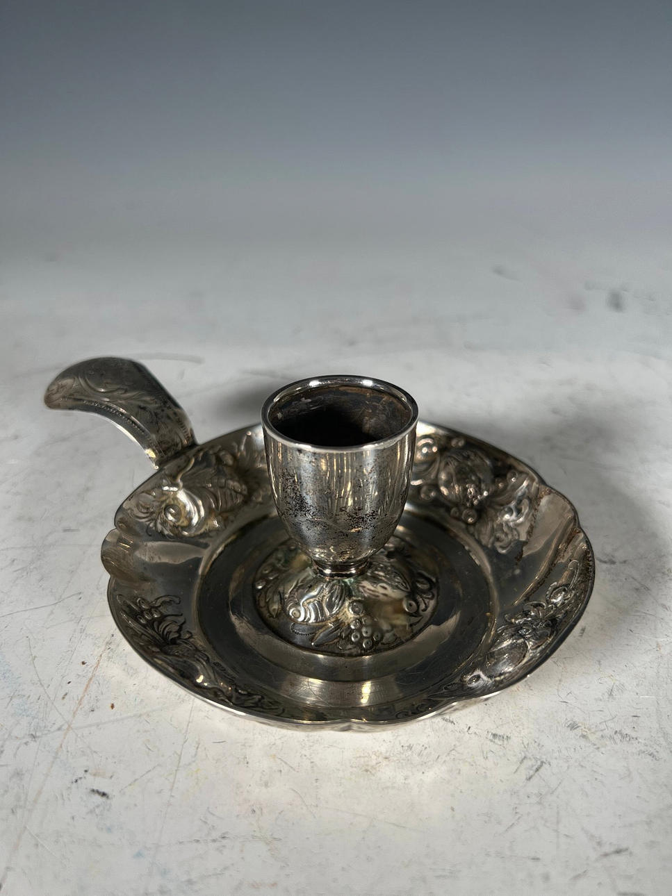Antik silver ljusstake, stämplad, 800 Med blommig inredning.