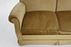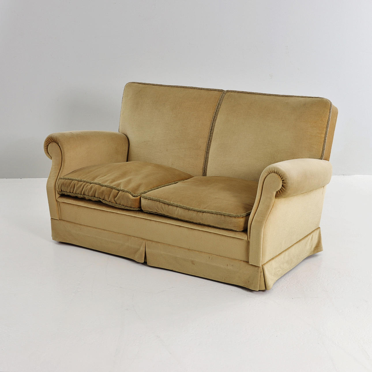 Soffa, tvåsits, helklädd i ljusgrön textil av sammetstyp. Lösa dunplymåer. Nosagfjädrar undertill. Ben i ek.