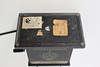 Svartlackerad plåt, trä, bakelit.