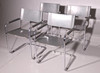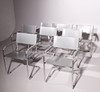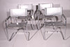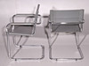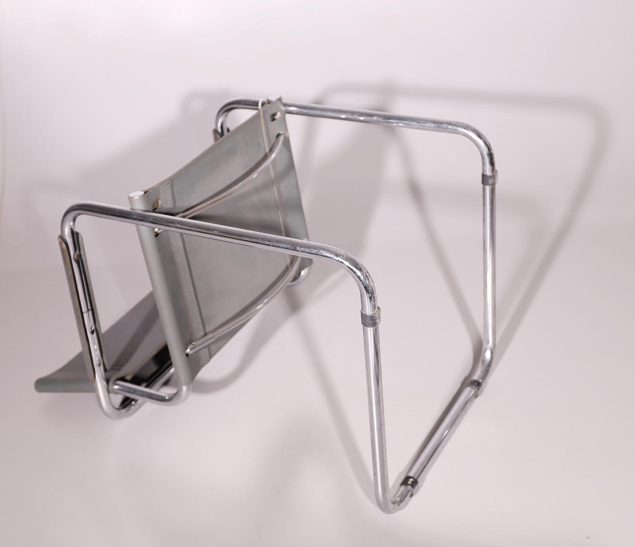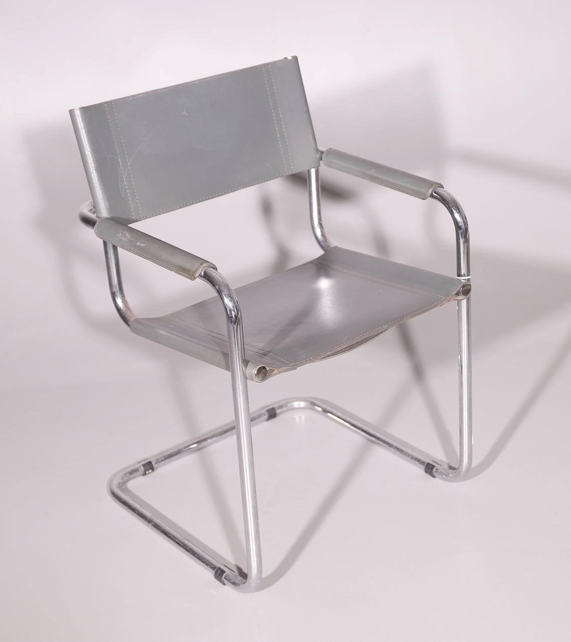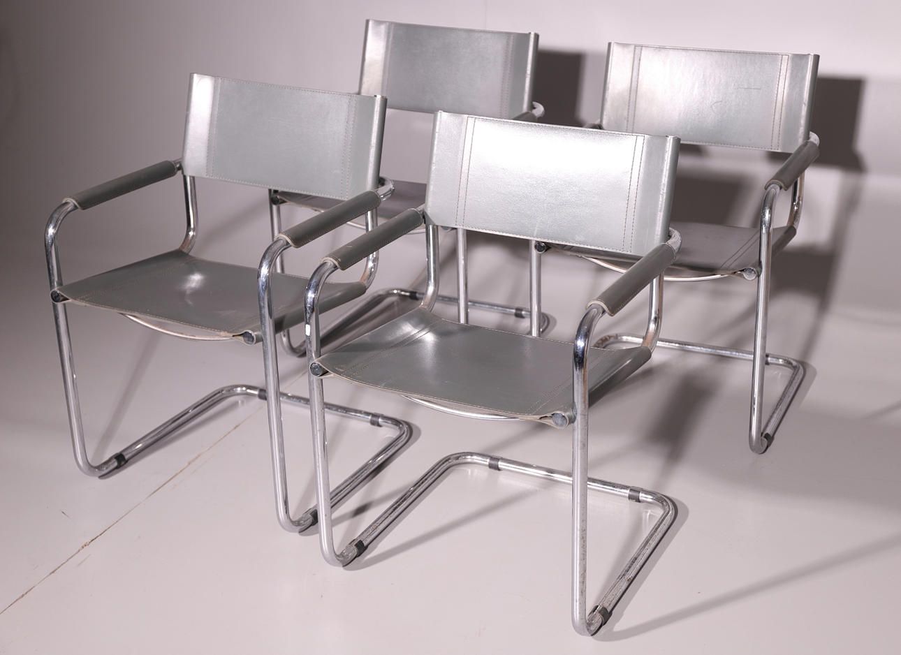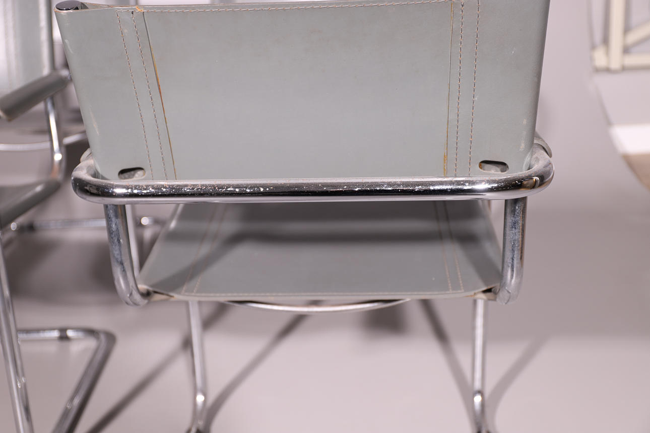 Bra skick, med tecken på användning. Förkromningen av basen visar lätt oxidation. Lädret på vissa stolar visar slitage och tecken på användning.