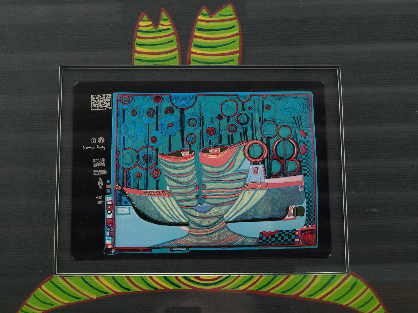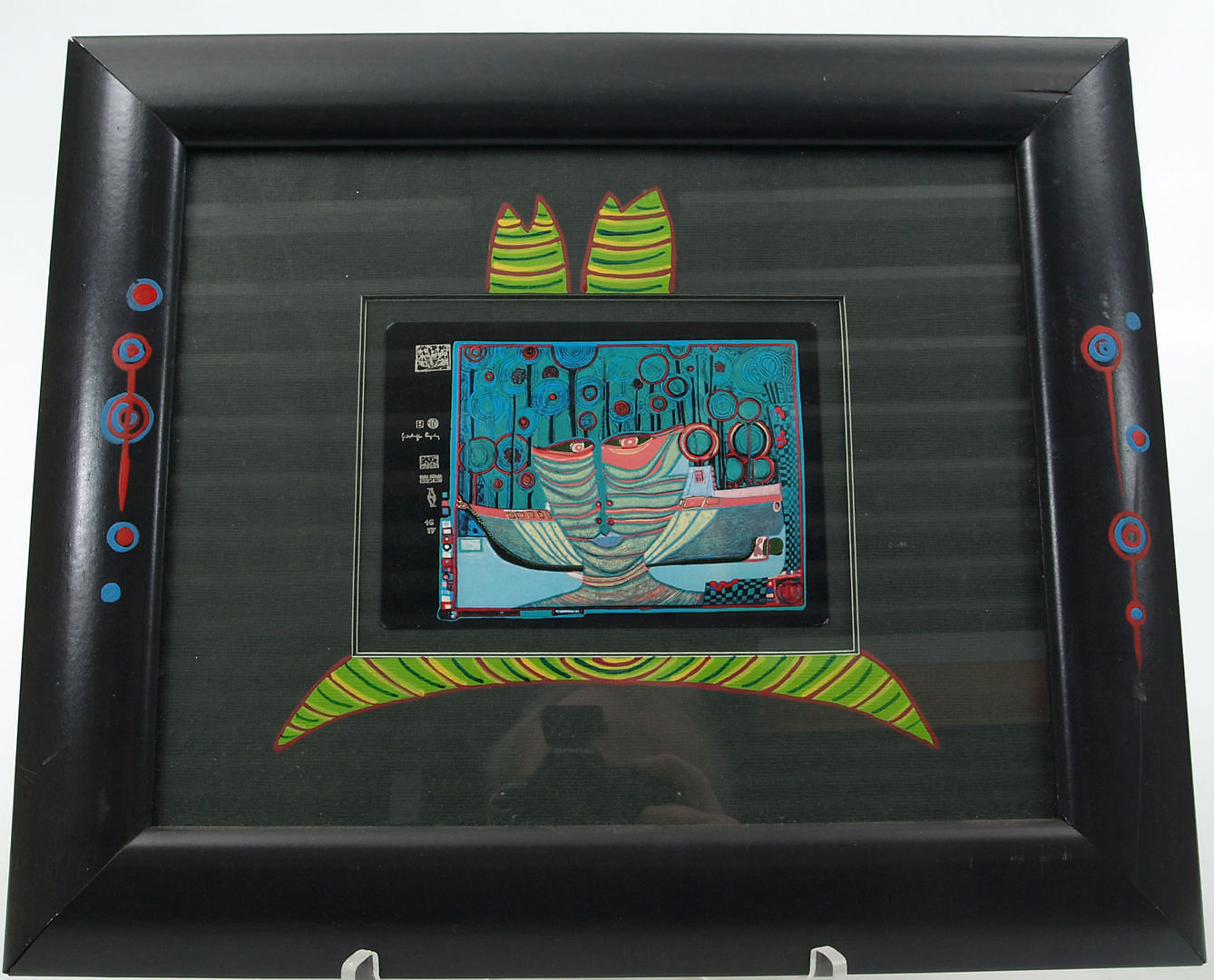 234229. FRIEDRICH HUNDERTWASSER. Offset tryck med prägling, handdekorerad ram och passpartout.