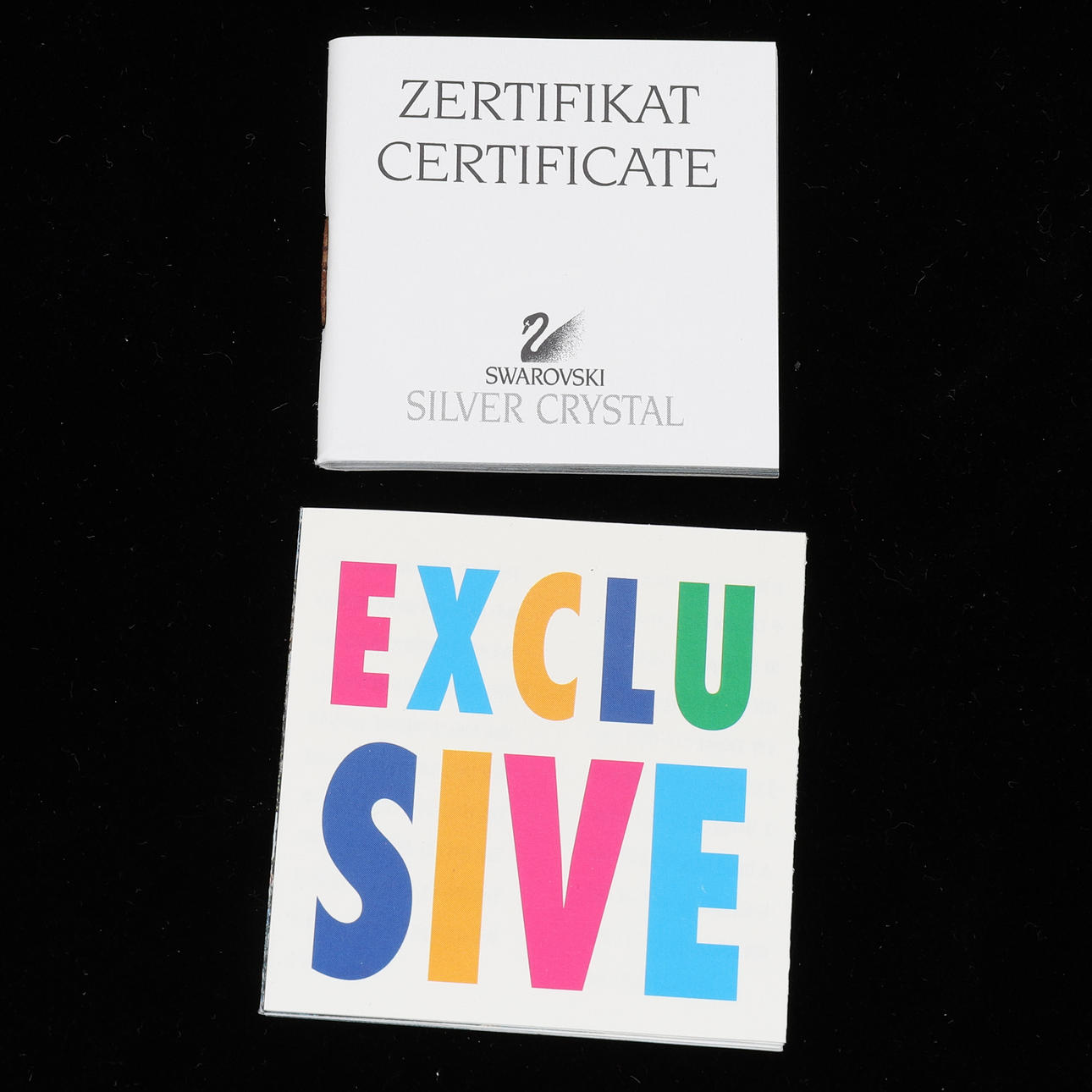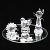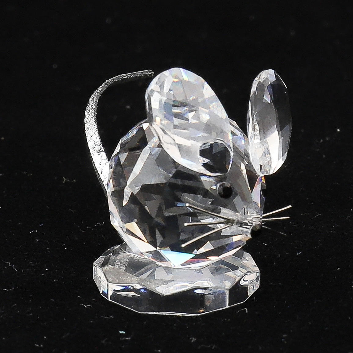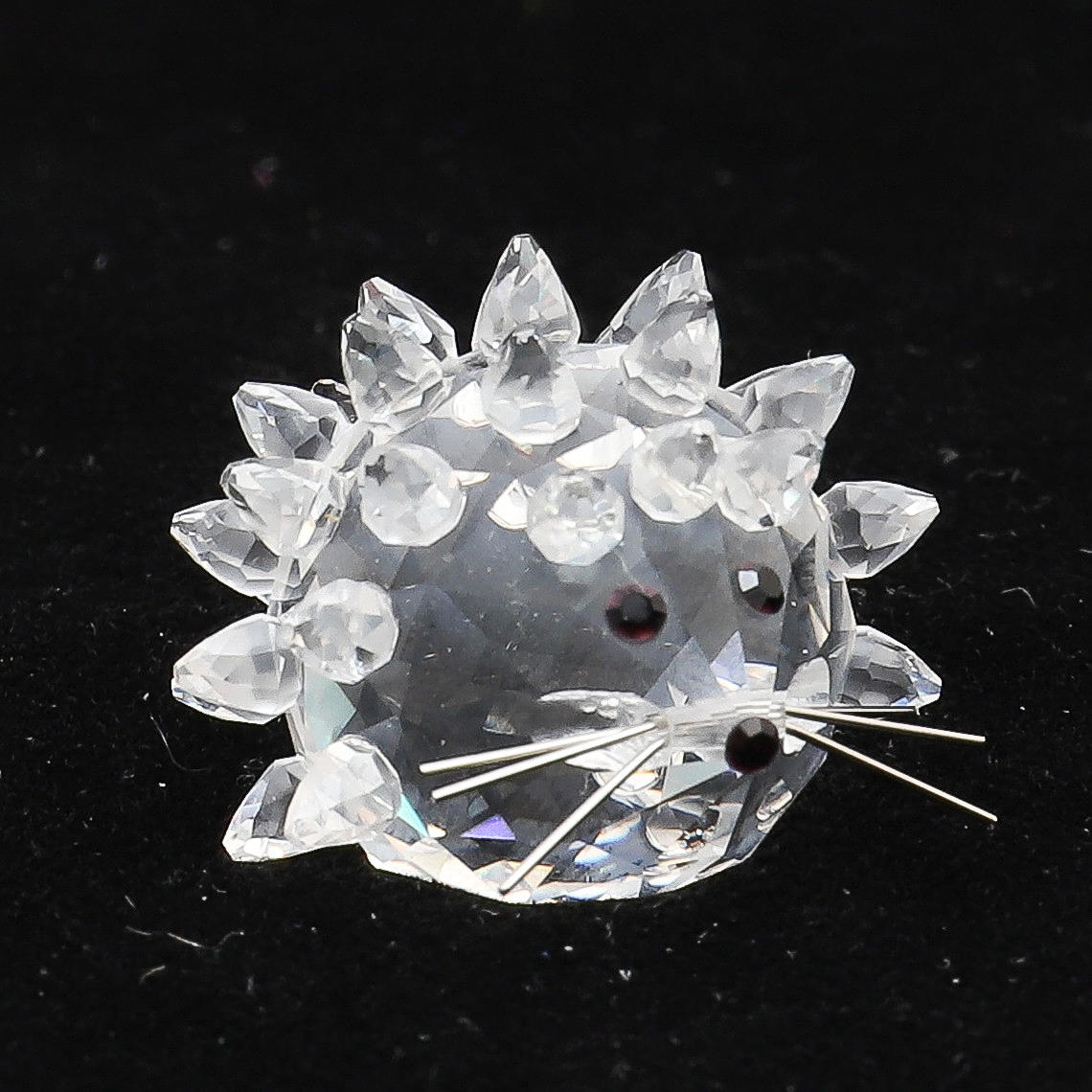 nummer 7606 100 000, allt i klar fasetterad kristall, mus med metall morrhår svarta ögon och näsa och läder svans, 3cm hög, katt med metall näsa, morrhår och svans och svarta ögon, 5cm hög och igelkott, med metall morrhår och svarta ögon, 2cm hög, för att inkludera en cirkulär speglad stativ med bilder av mus, katt och igelkott, 10 cm diameter, med certifikat, som finns i en originalförpackning.