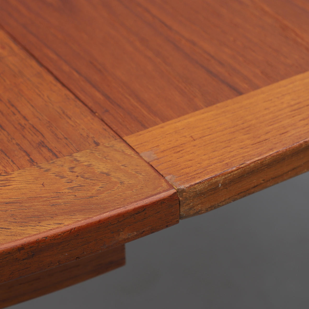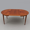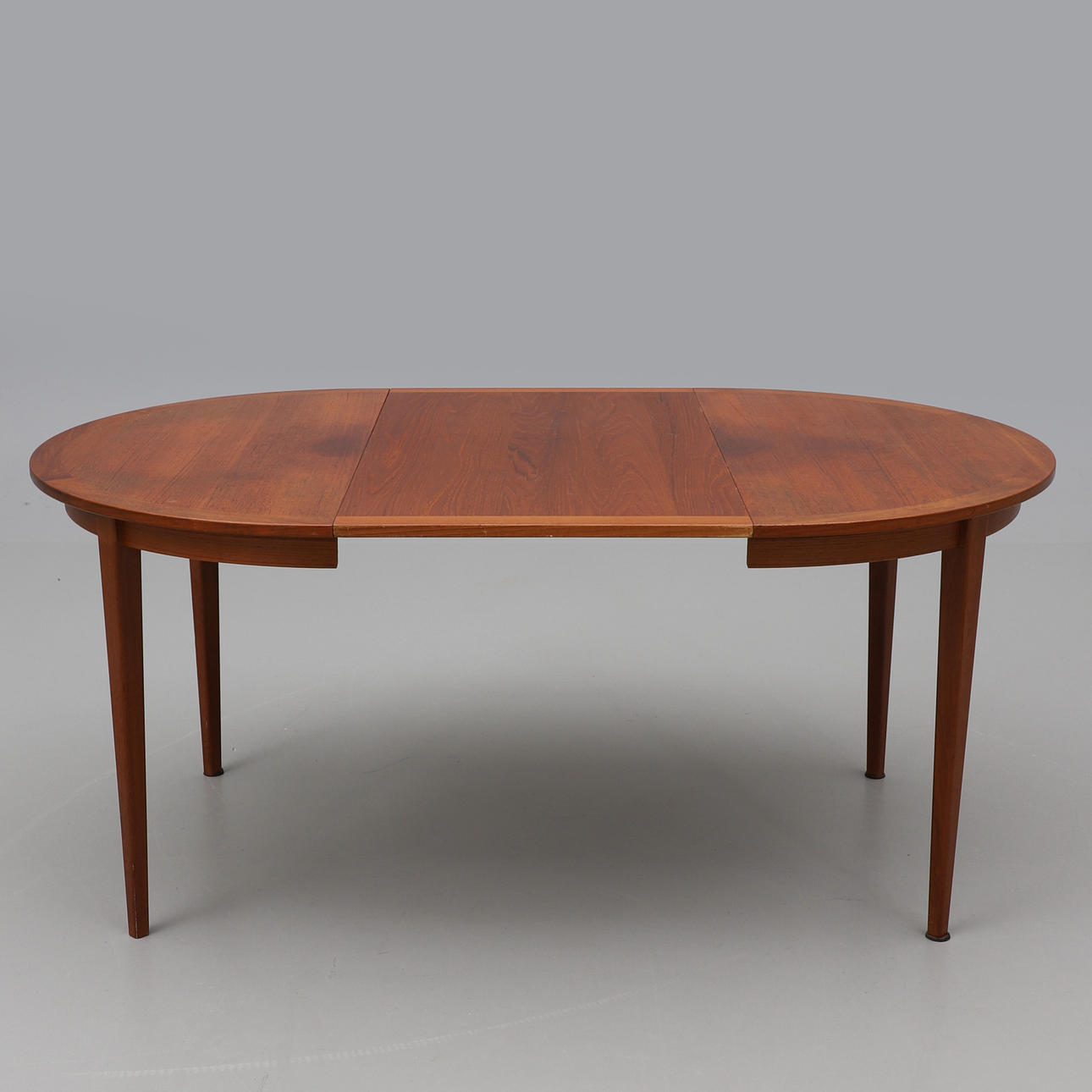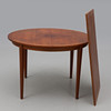 Teakfanderad, rund skiva med iläggsskiva. Diameter 110 cm. Höjd 73 cm. Iläggsskiva 59x110 cm.