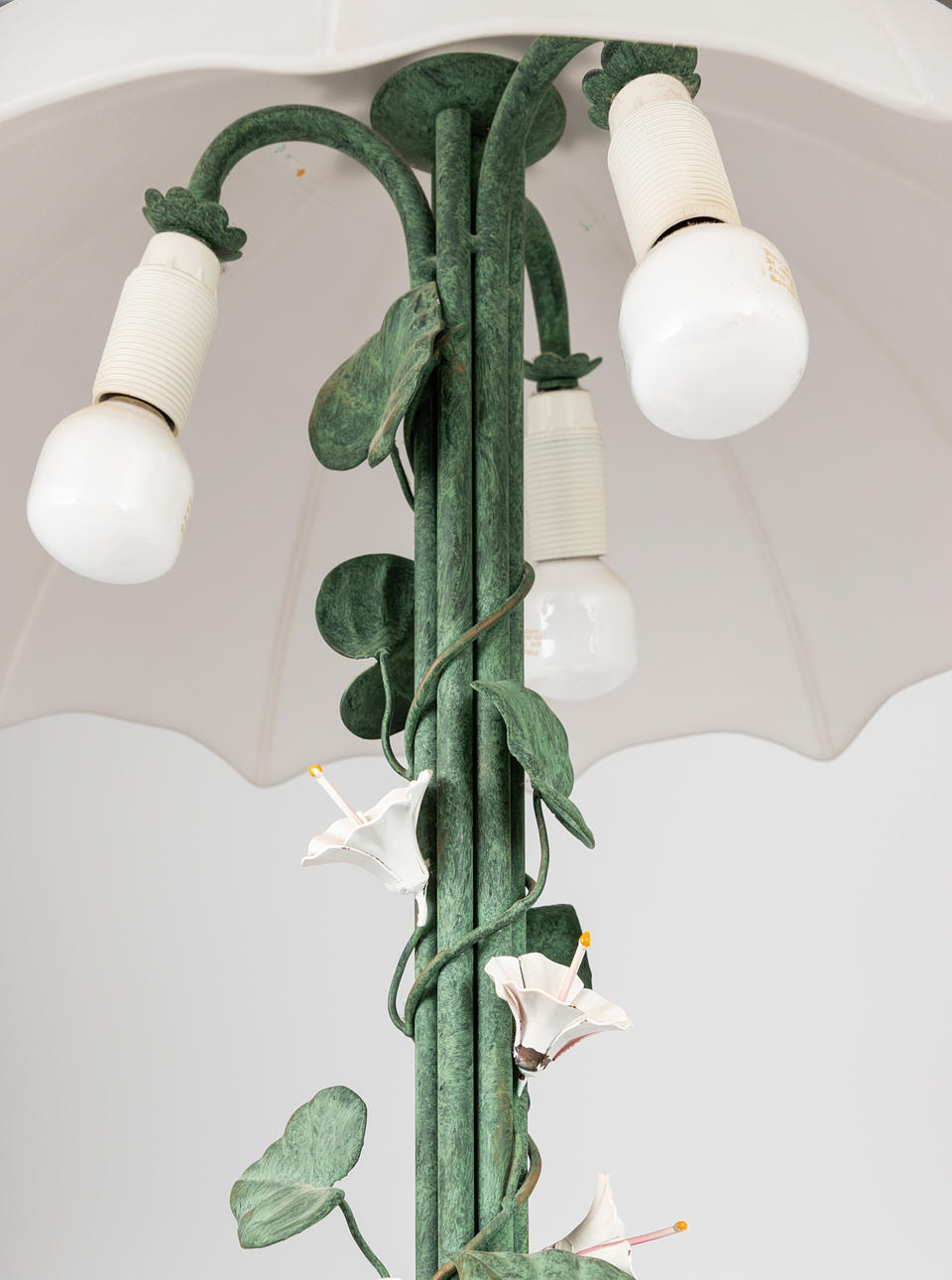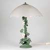 Florentinsk stil bordslampa. Lampa med tung lampsockel av metall, målad i koppargrön med patinering och prakt dekoration. Lampskärm i form av ett paraply av vitt frostat glas. 3 belysningspunkter, E14-uttag.