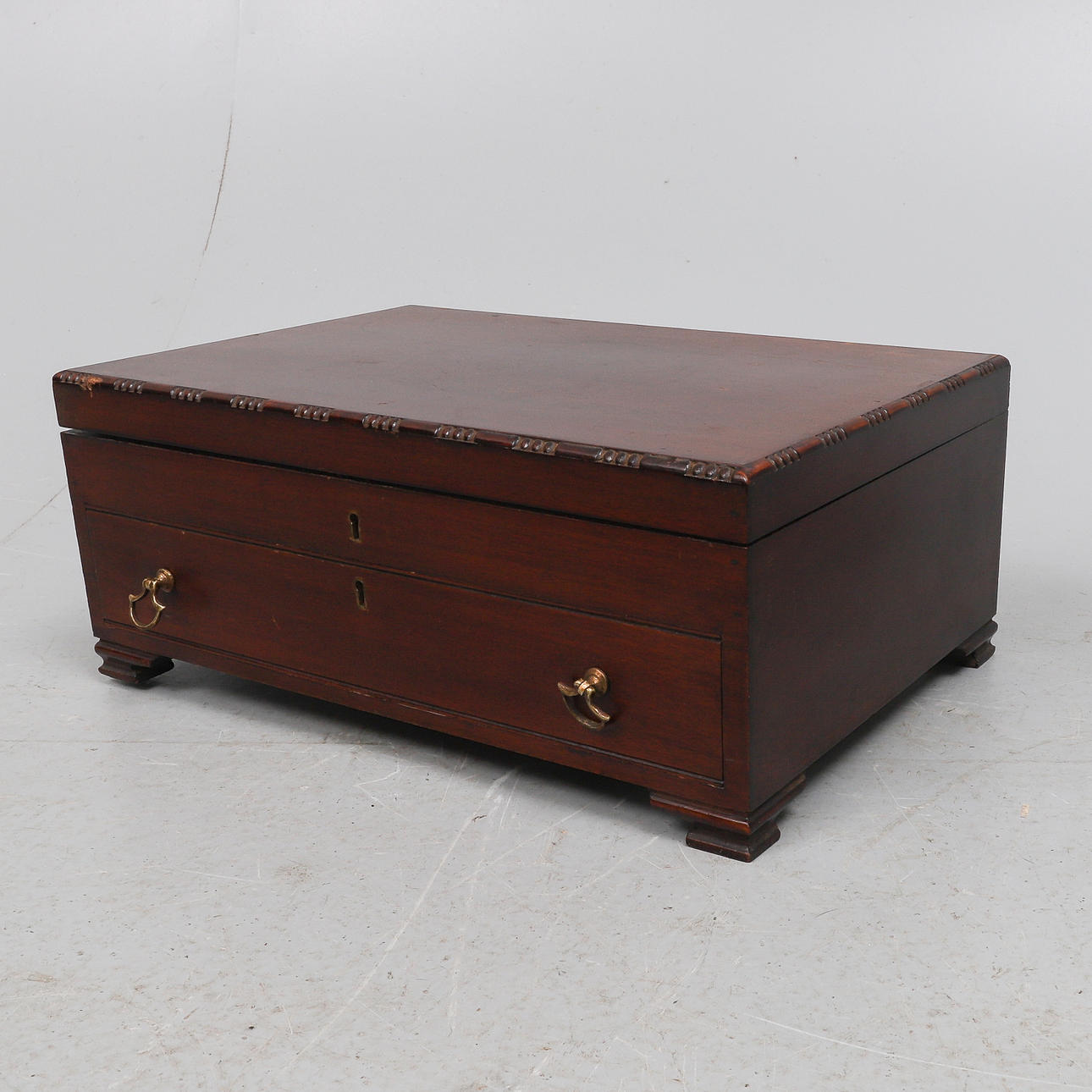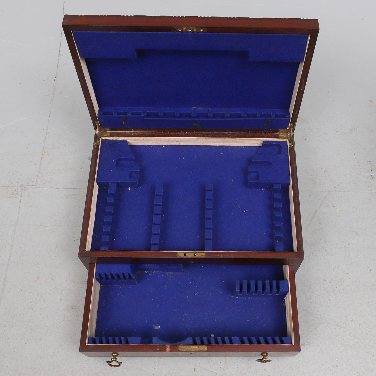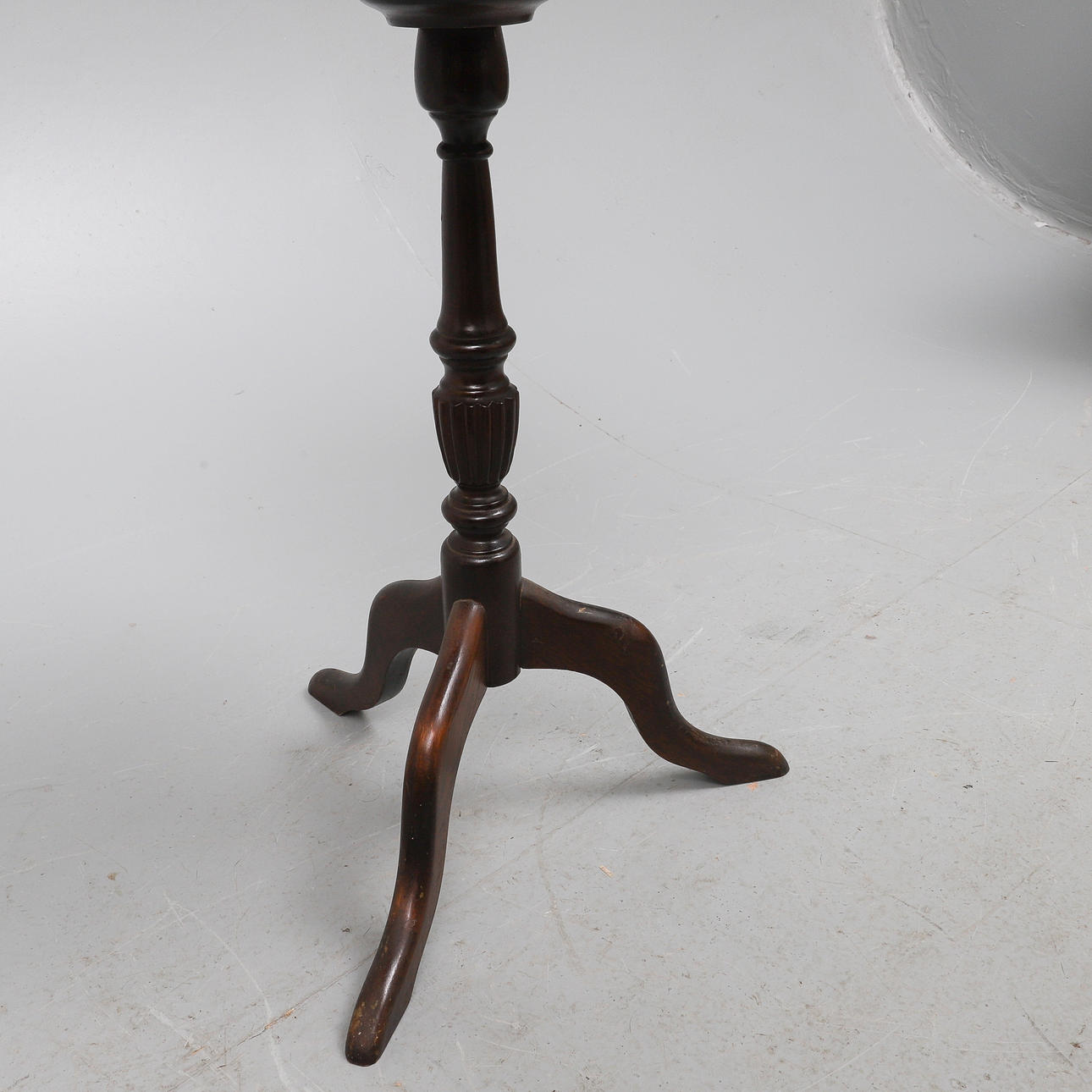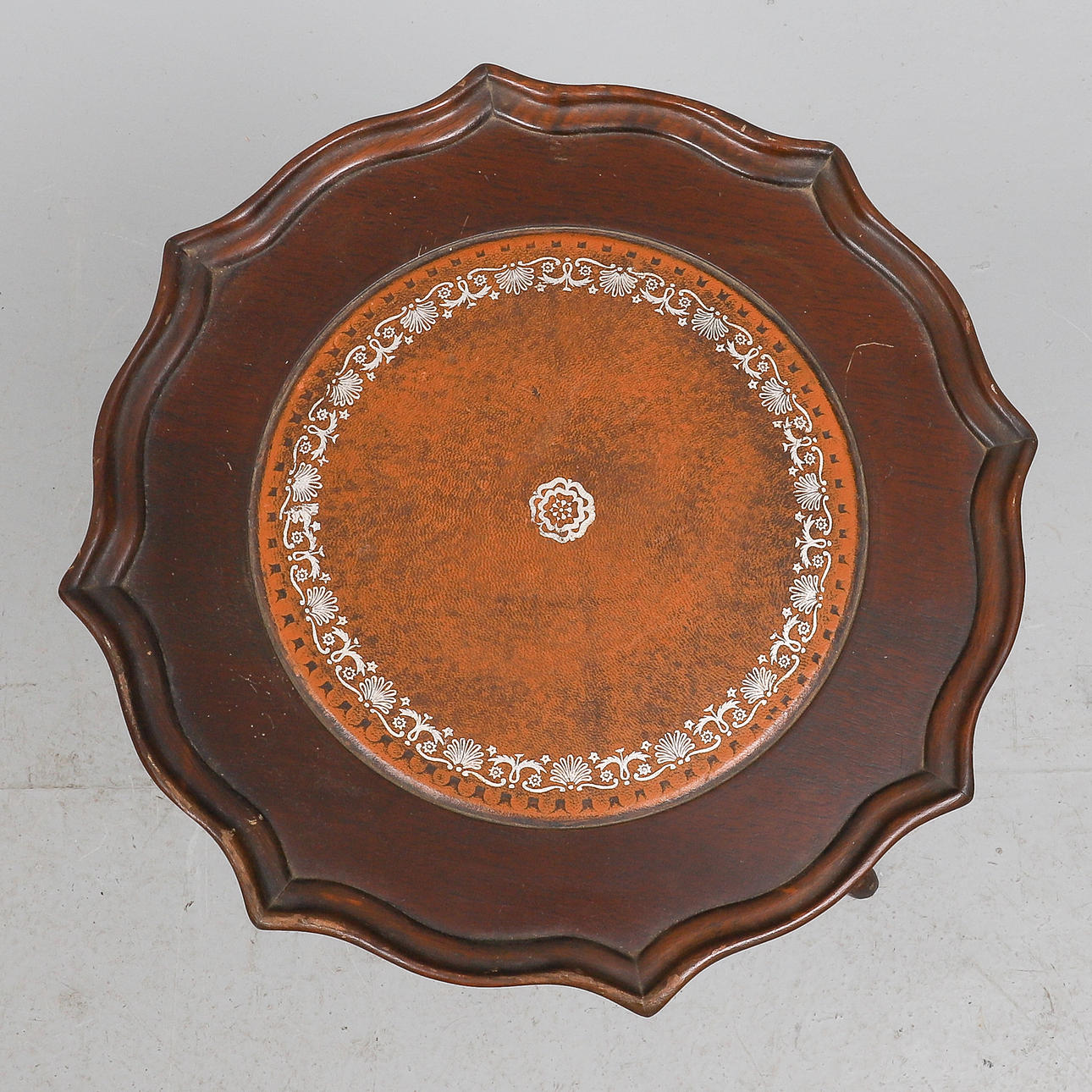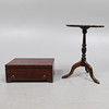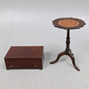 den blå baize fodrad monterad interiör med en gångjärn topp och en låda nedan, 17cm x 42cm. också en reproduktion paj skorpa kant vinbord, med en skruv infälld topp, och stativ bas (2).