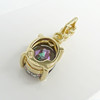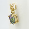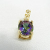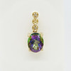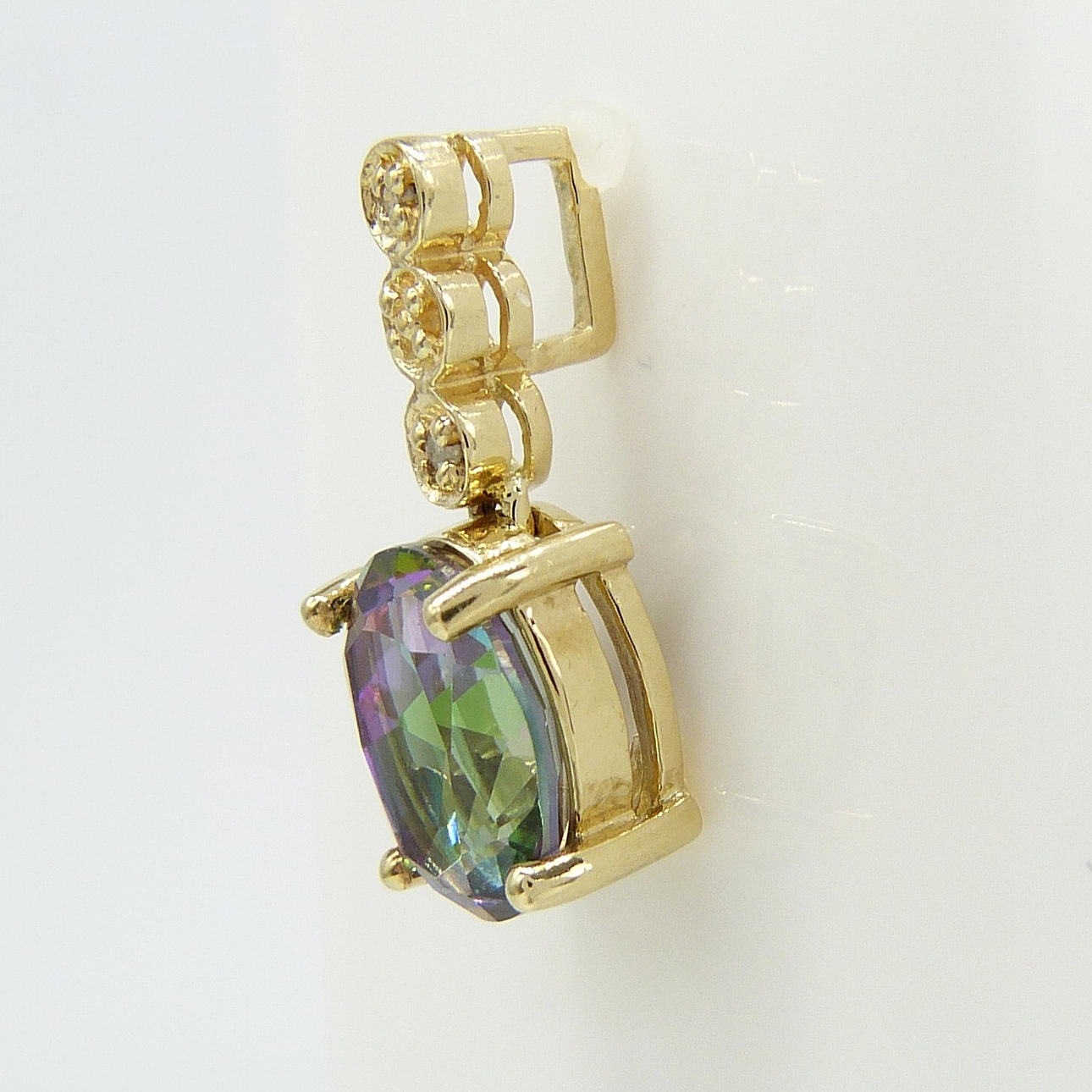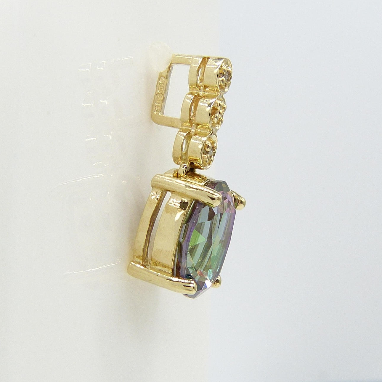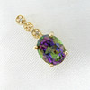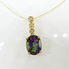 Set på detta hängsmycke är en ovalskuren mystisk topas ädelsten som visar ett spektrum av färger som lila, grönt, blått och rosa.