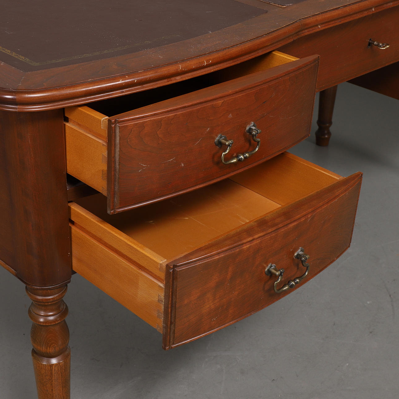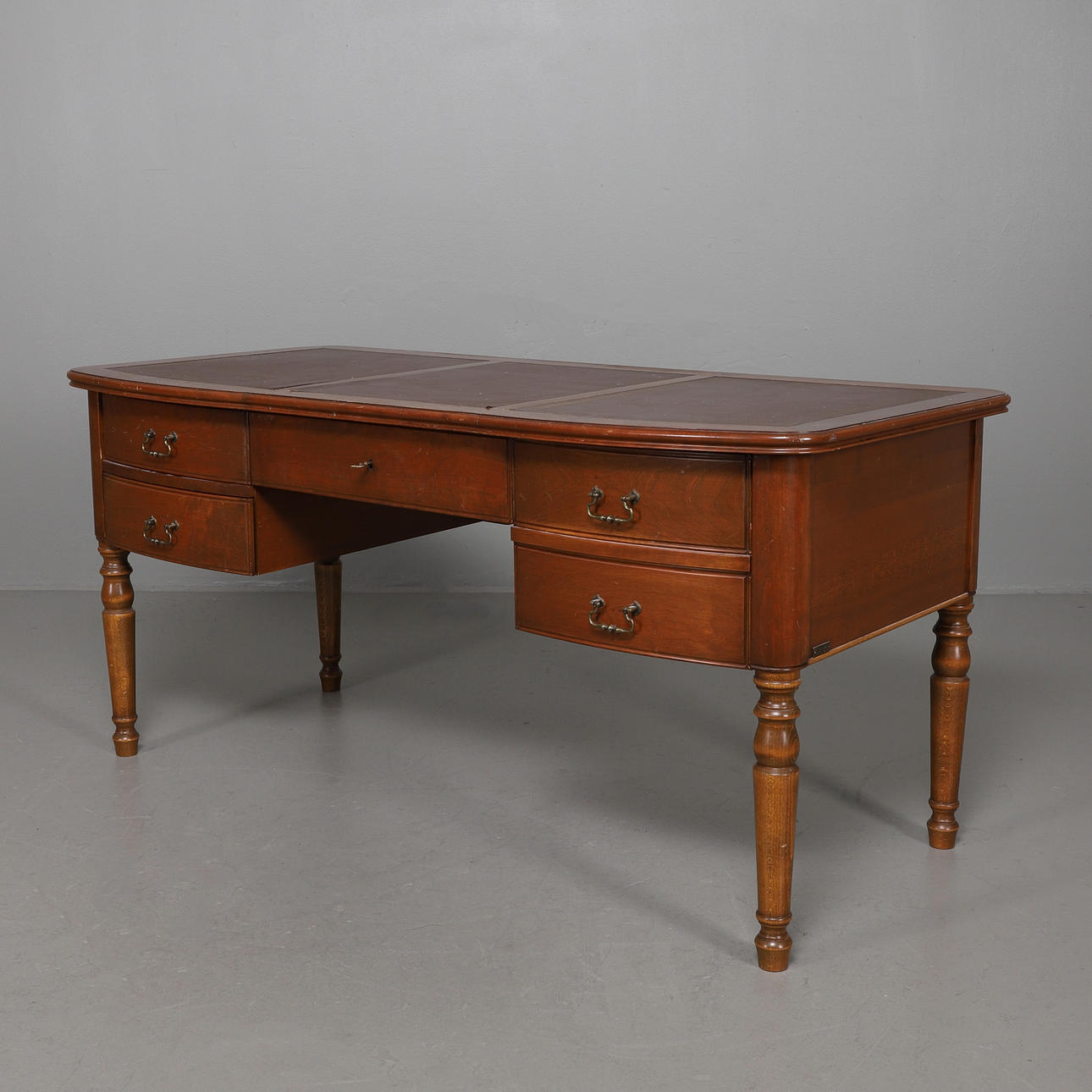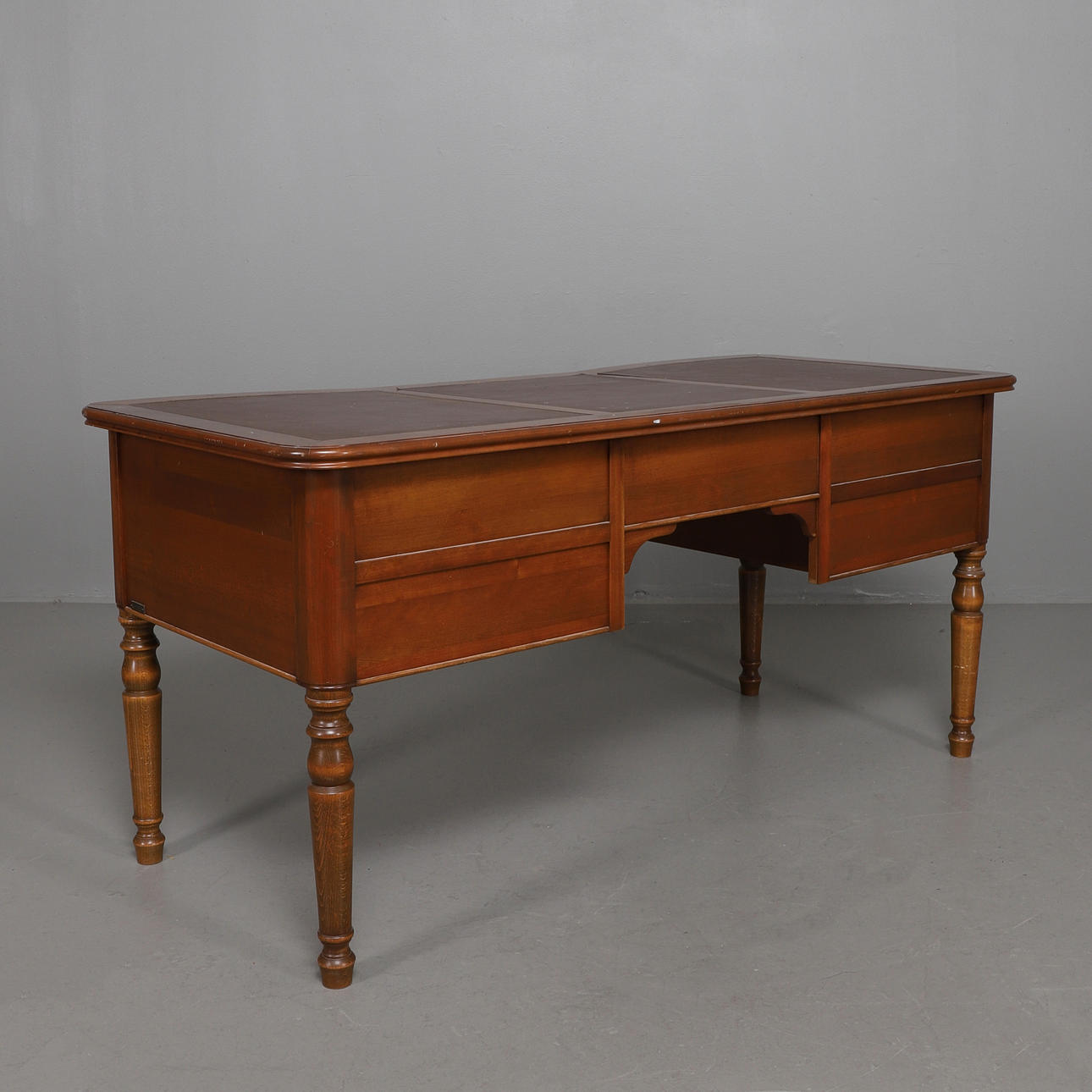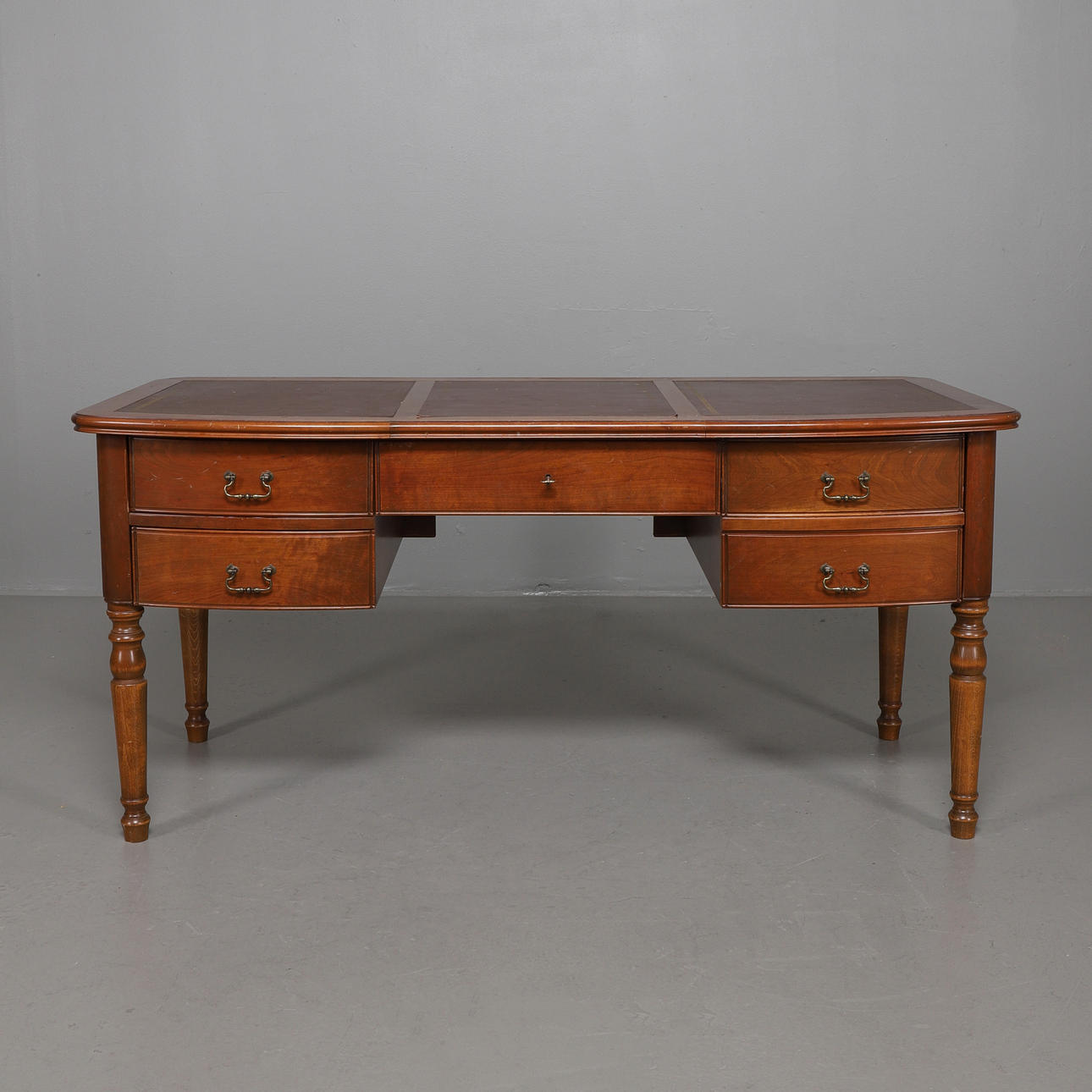Skrivbord i trä, metall och syntetiskt läder Höjd 77 cm Djup 75 cm Bredd 163 cm.