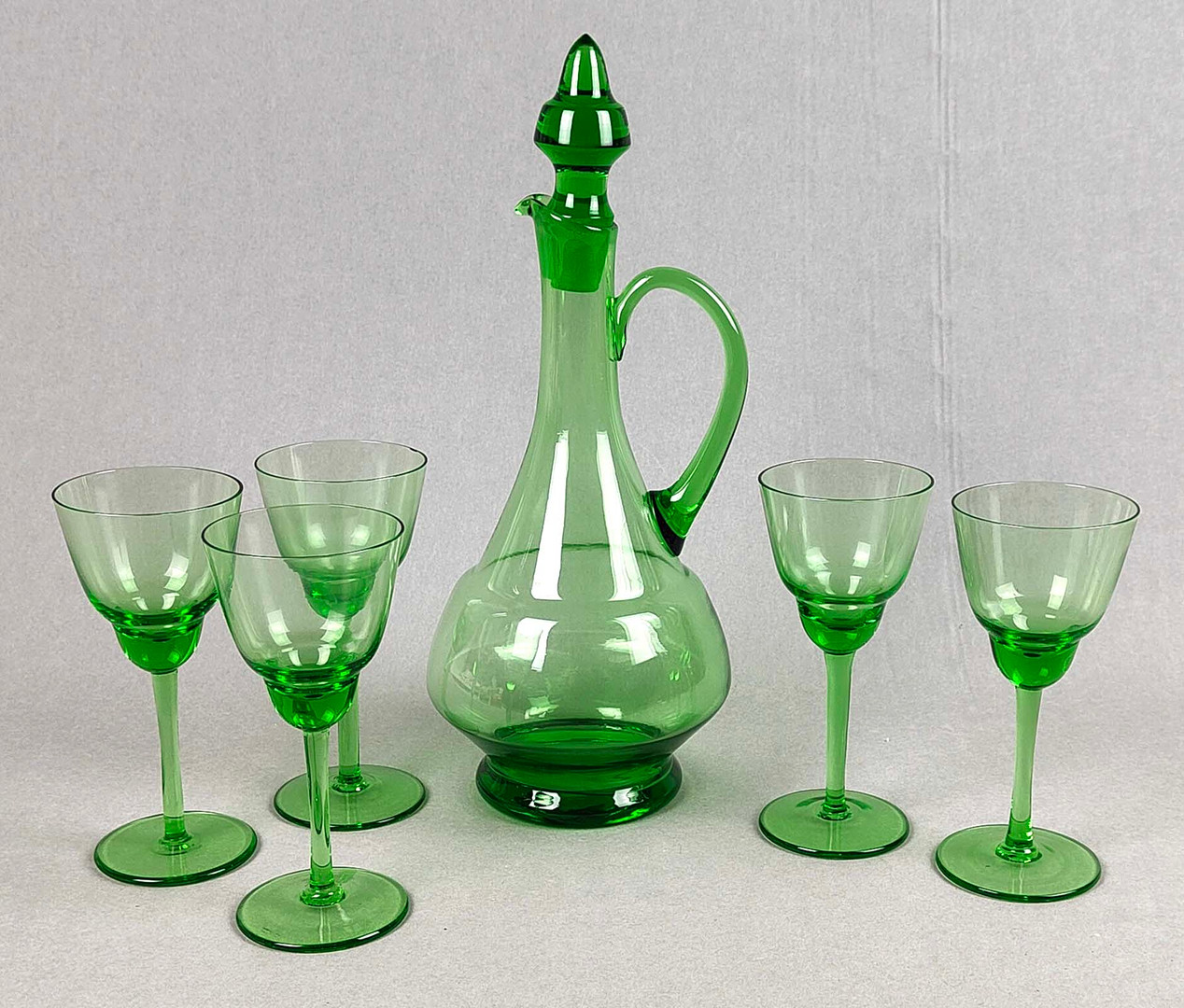 2353297. GRÖN GLASKARAFF MED VINGLAS.