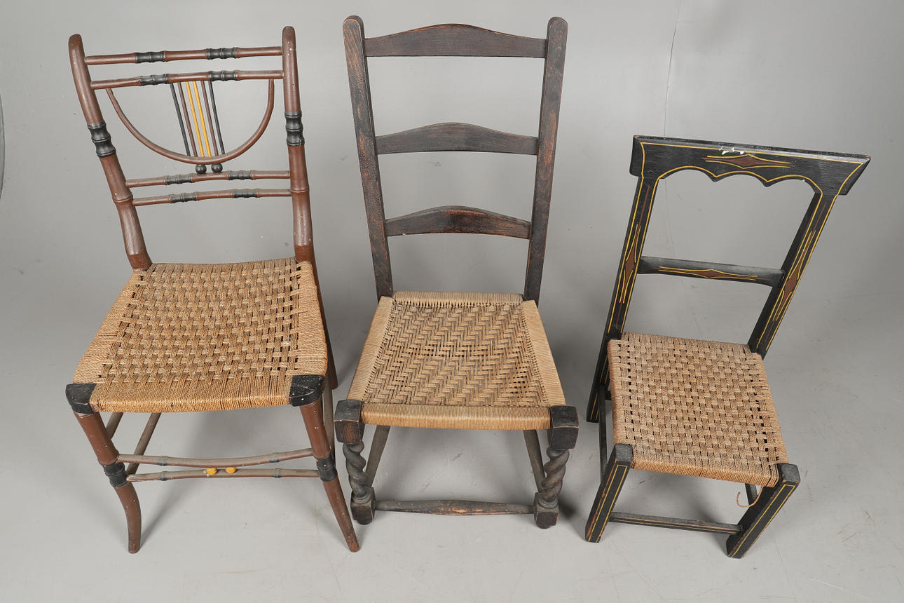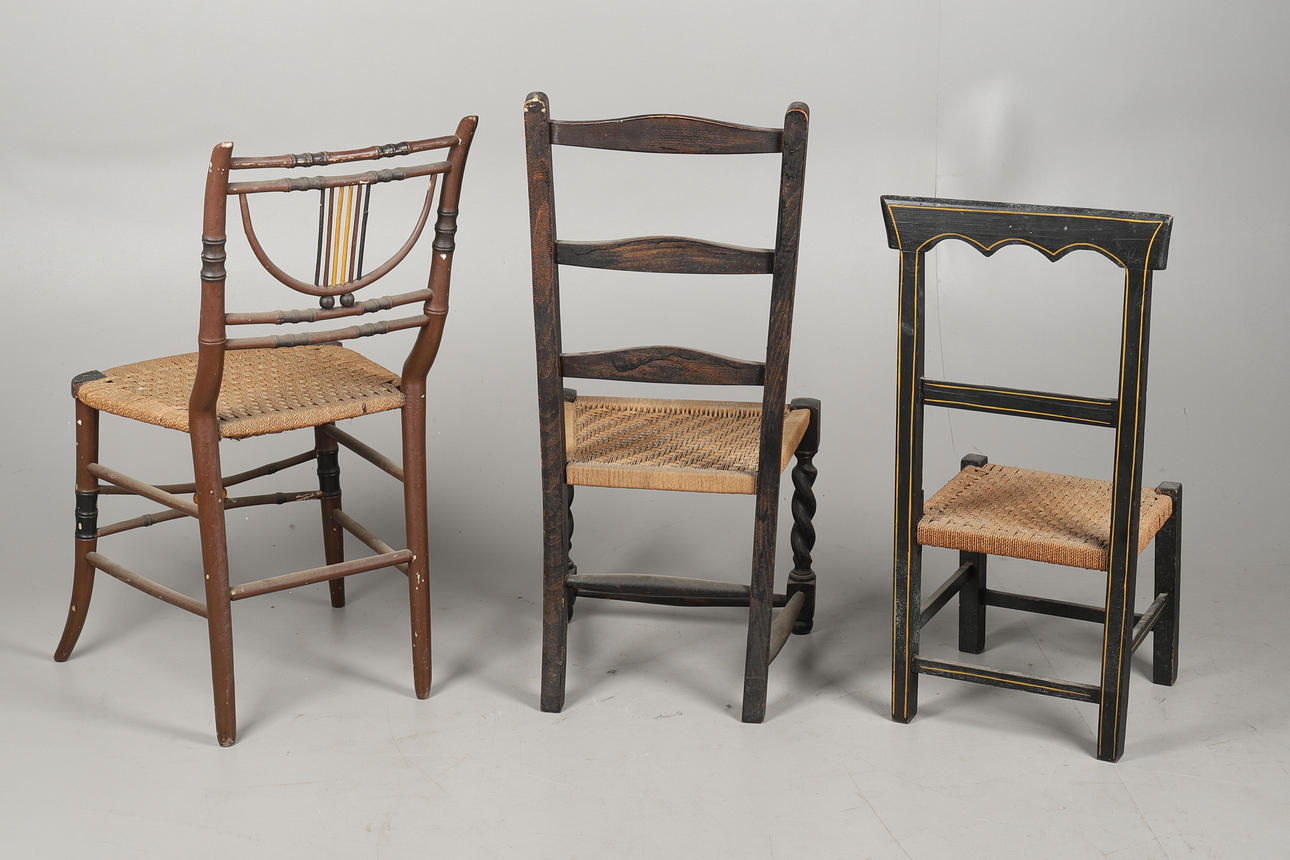 En Regency målad sidostol 72 cm höjd x 37,5 cm bredd x 31 cm djup, och stol 82 cm höjd x 41 cm bredd x 34 cm djup och tredje stol 86 cm höjd x 40 cm bredd x 32 cm djup, (3) stolar totalt.