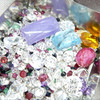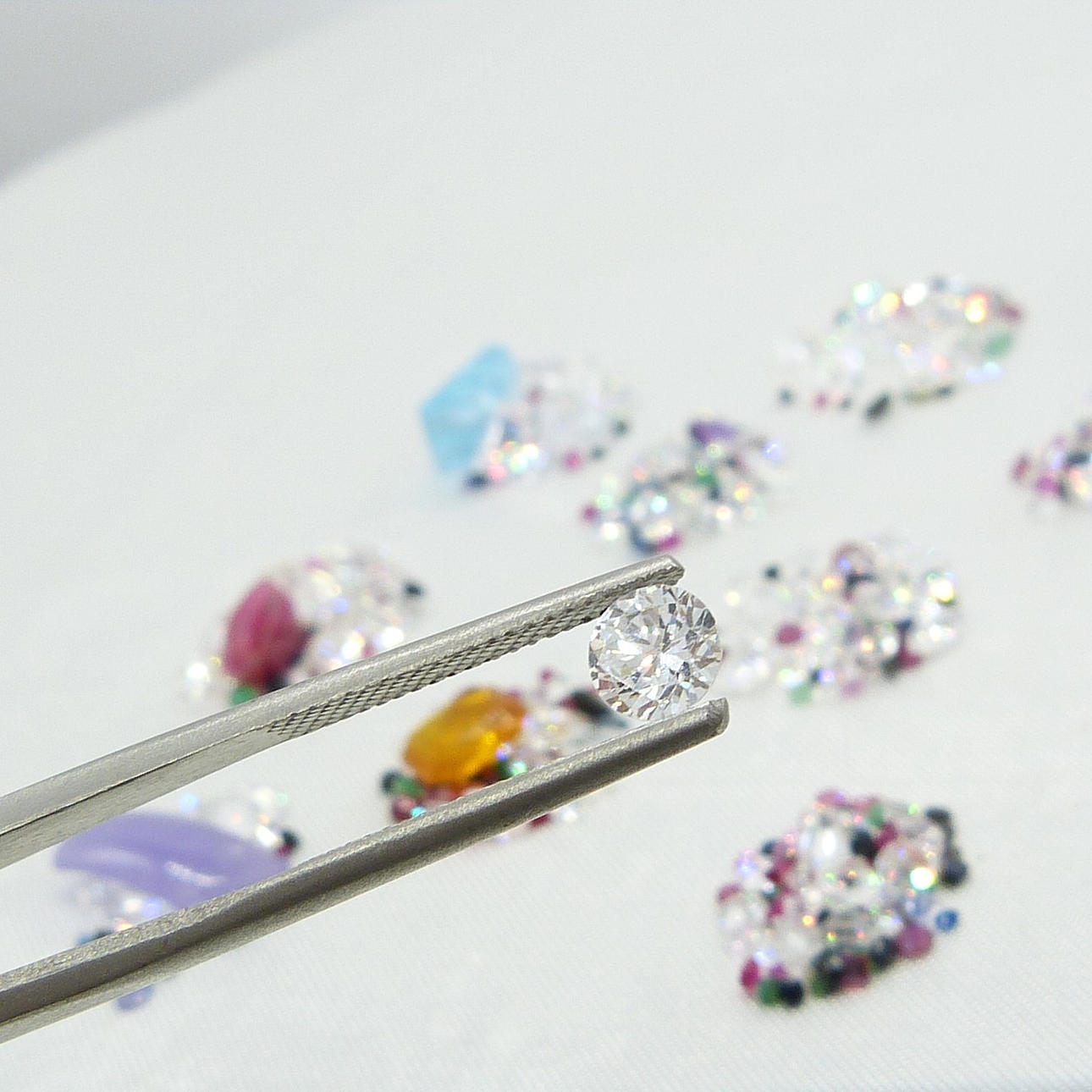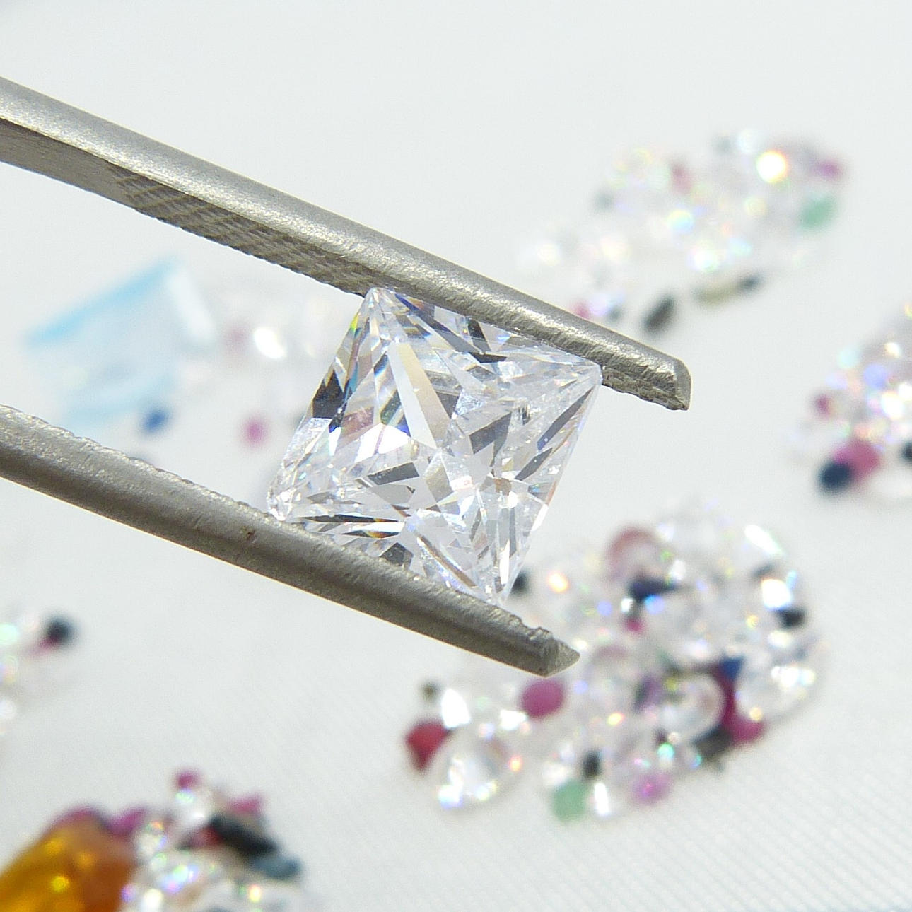 Ett urval av lösa, omonterade halvädelstenar och stenar inklusive rubin, safir, vit och färgad cubic zirconia, smaragd och blå topas.