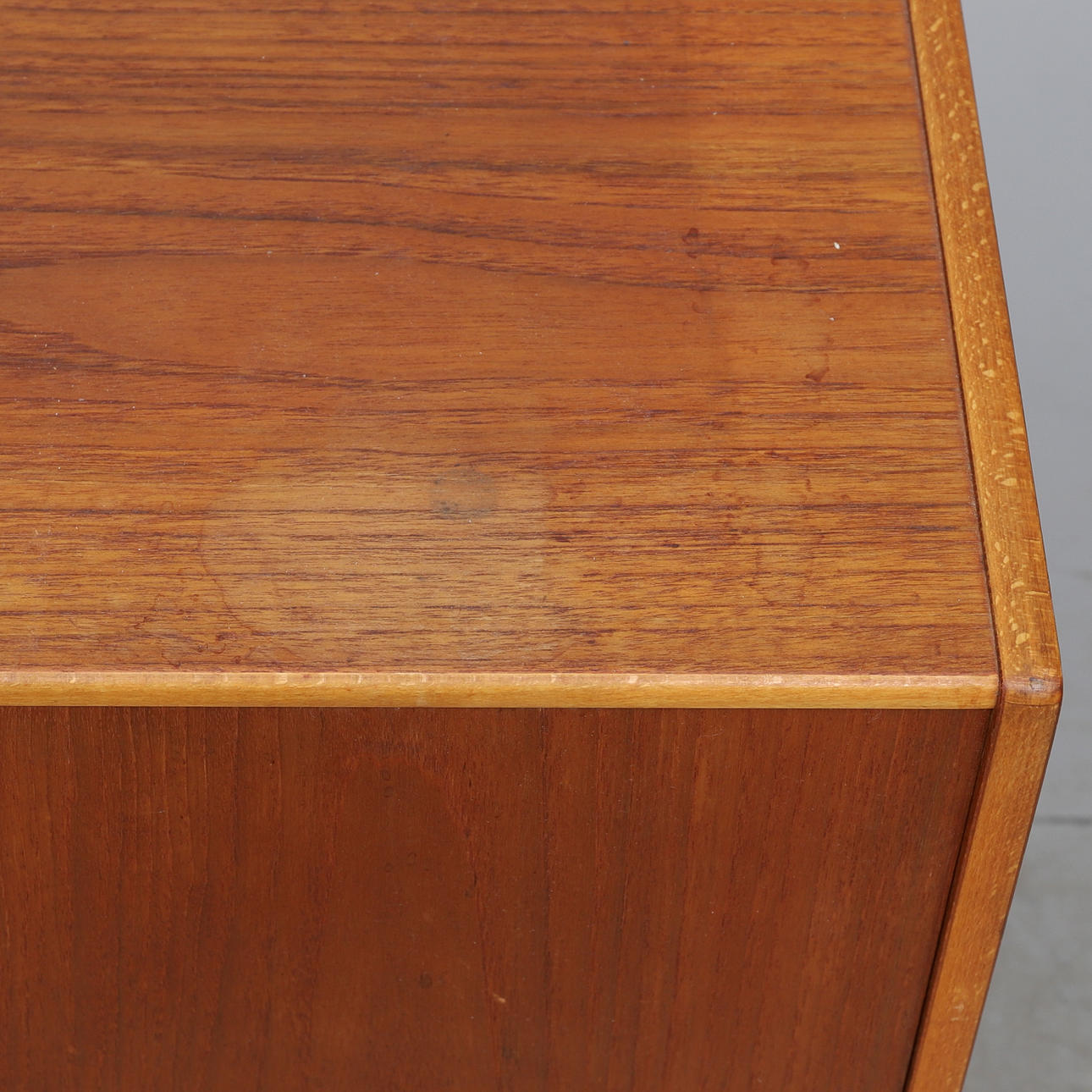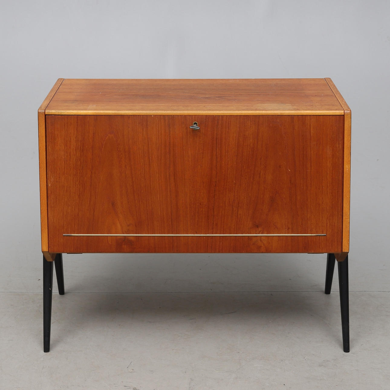 Fanerad med teak. Svärtade detaljer. Uppfällbar dörr med bakomliggande skivspelare samt förvaring. Längd ca 79, bredd 36, höjd 64 cm.