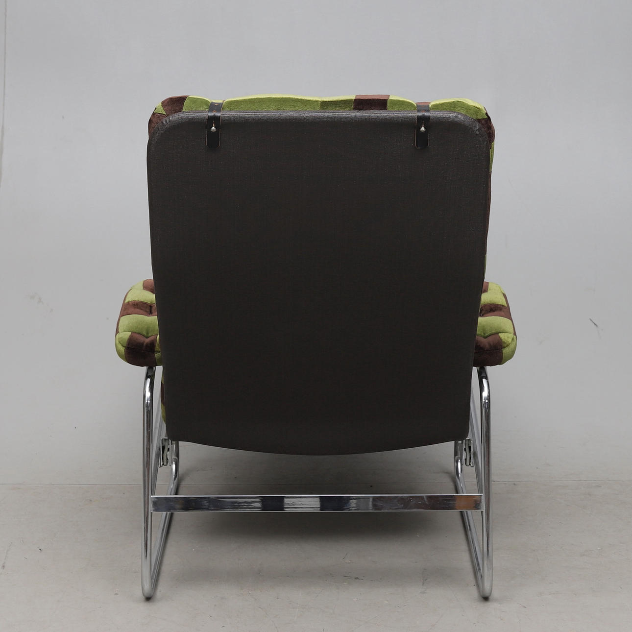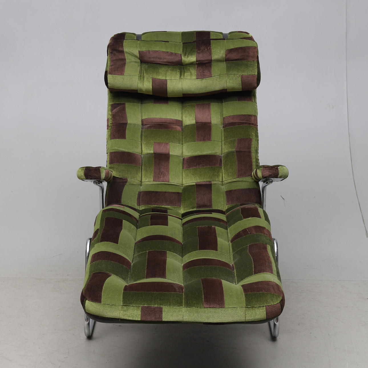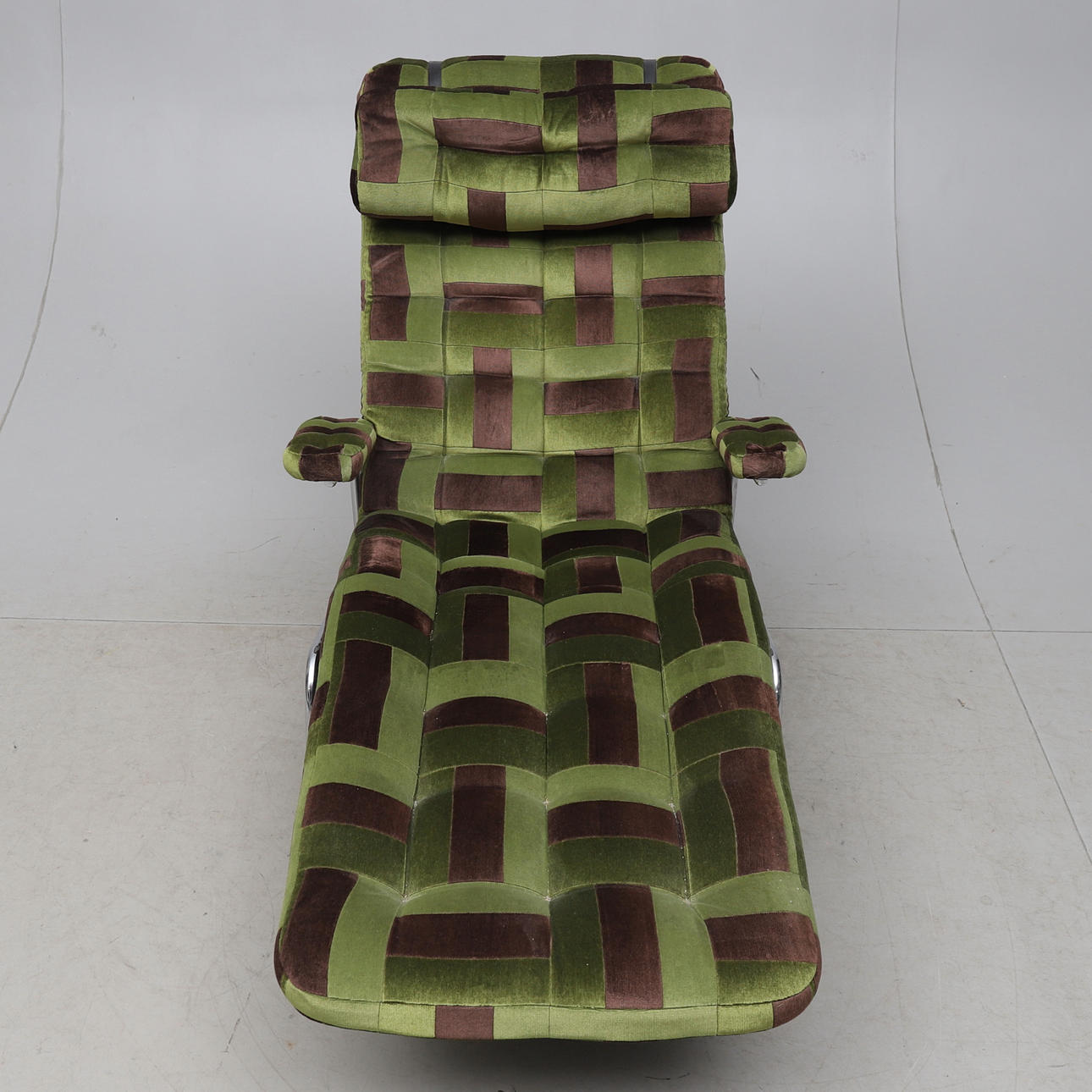 Stomme i förkromad metall. Lös plymå med textilklädsel. Ställbar rygg. Längd ca 155 cm.