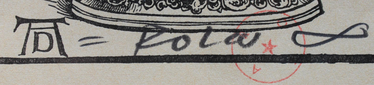 Reproduktion av träsnitt på papper, målad över med pastellkrita, u. AD = Rota ∞. Träsnitt från Dürers uppenbarelse av Johannes, skildrar Johannes vision på Patmos, delvis överdragen med symboler, svarta lackstämplar till höger och vänster. Åtgärder 45.5cm x 33cm Inramad bakom glas.