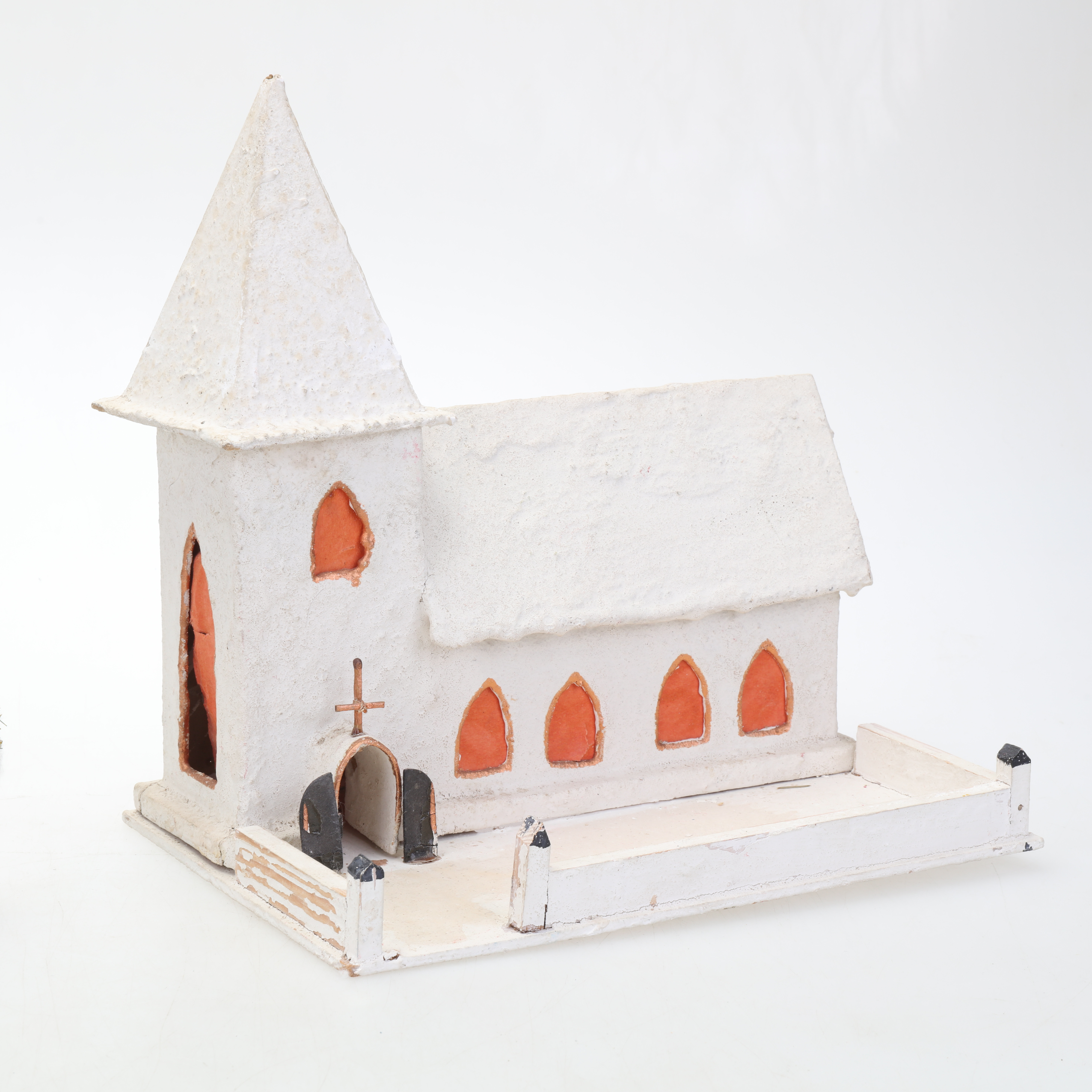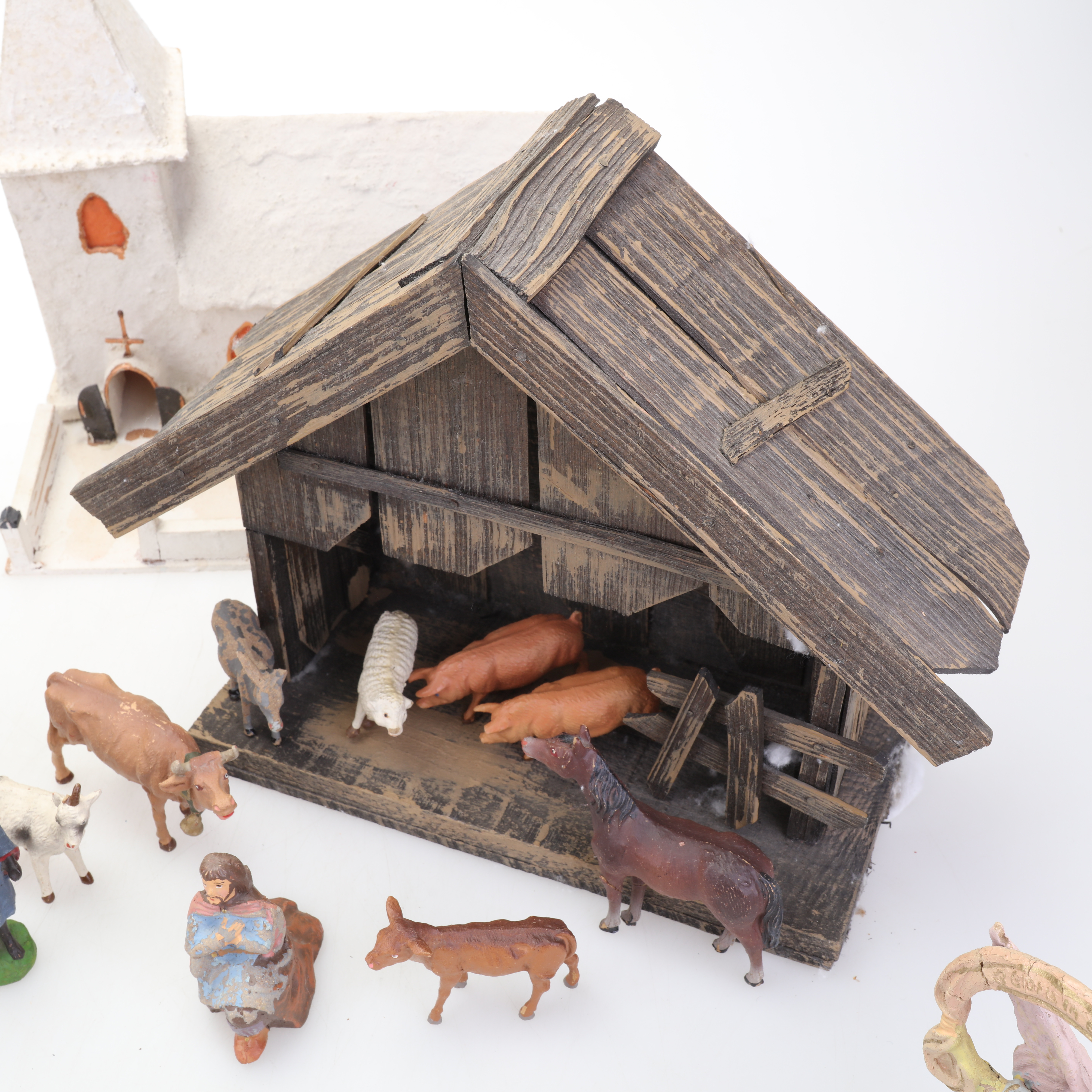 2360373. JULPRYDNADER I PARTI, kyrka papier mache, krubba, julkulor glas, 1900-talets mitt.