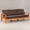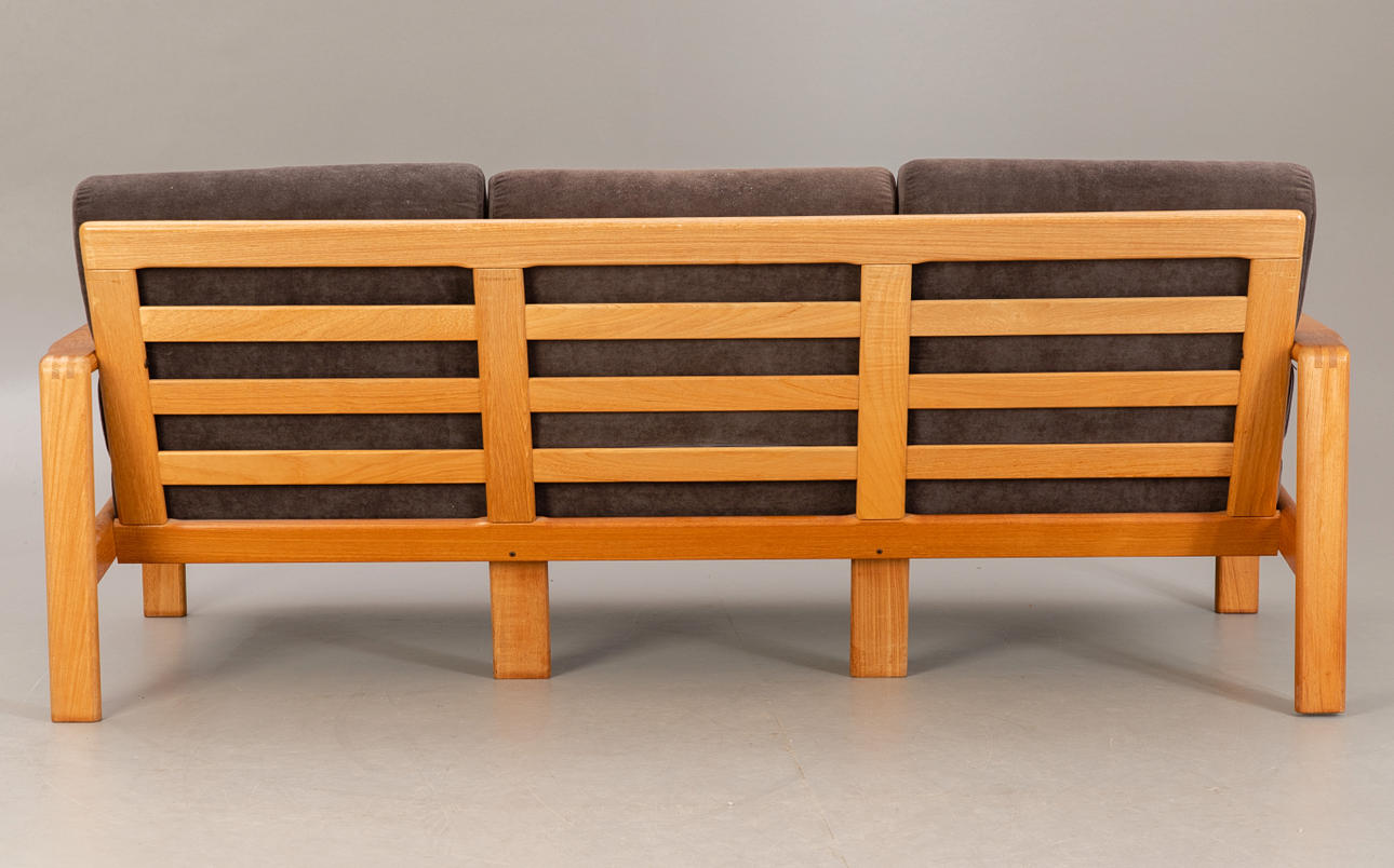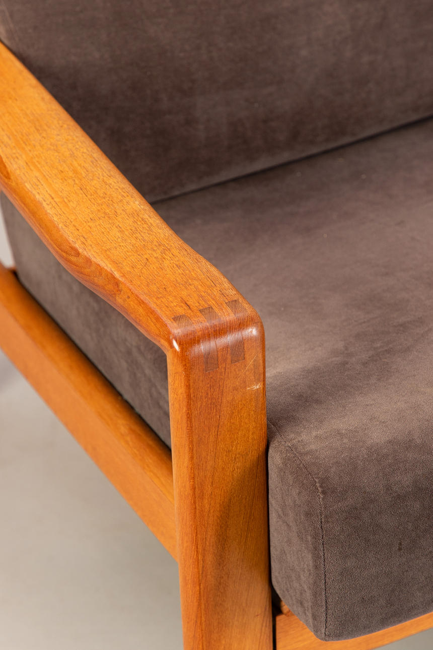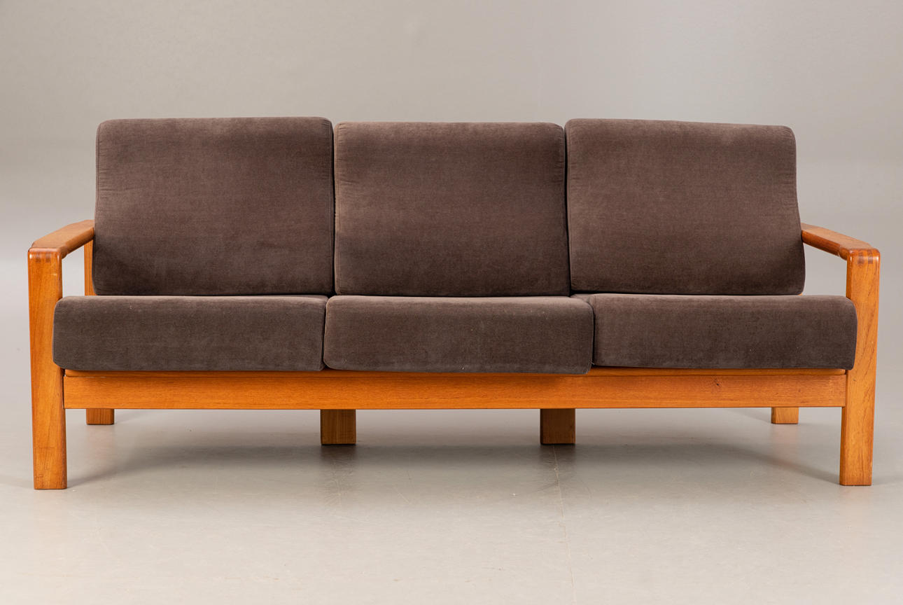 Teak 3-sits soffa, mitten av århundradet design. Ram i teak. Lösa sittdynor täckta med grått tyg.
