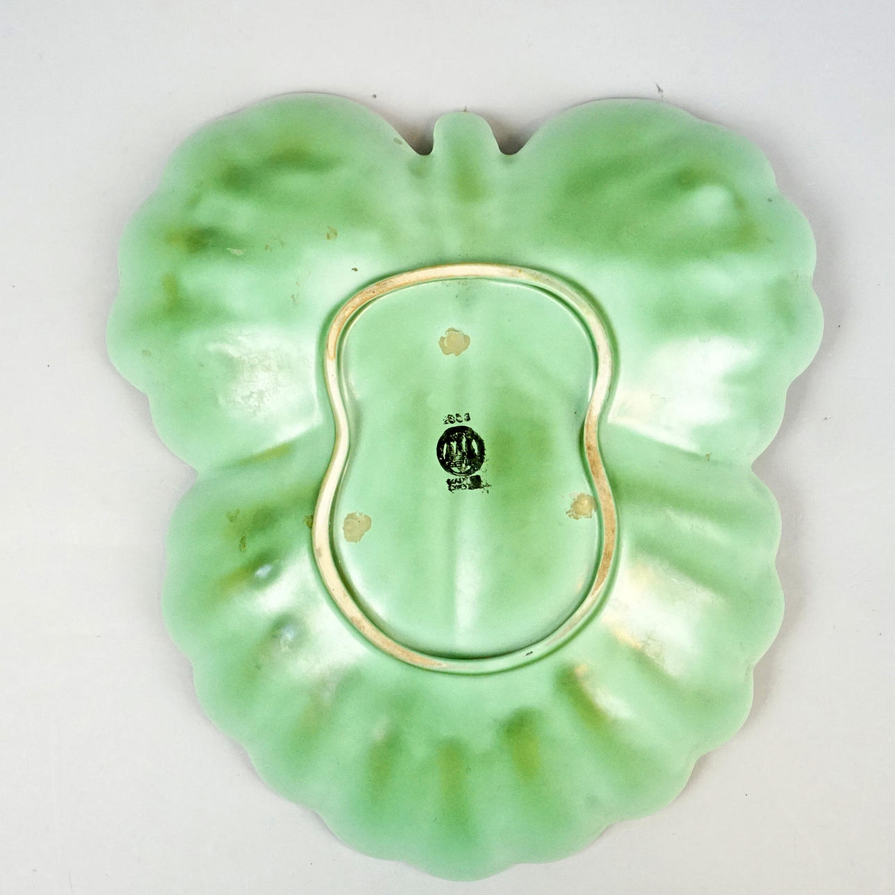 Lövformat fat Gefle, grön glasyr, höjd ca 4,5 cm, ca 26x23 cm, märkt Gefle, otydligt nr