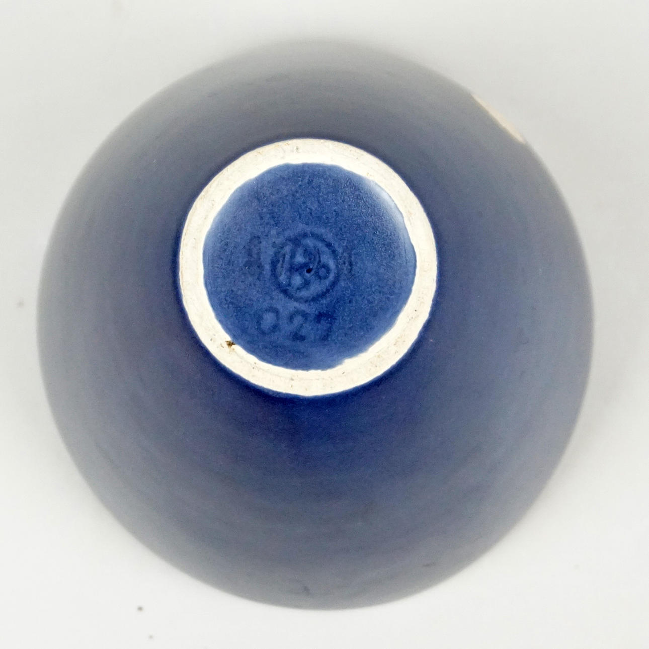 Blå skål ca 10 cm hög, diam ca 12,5 cm, märkt Bo 027.