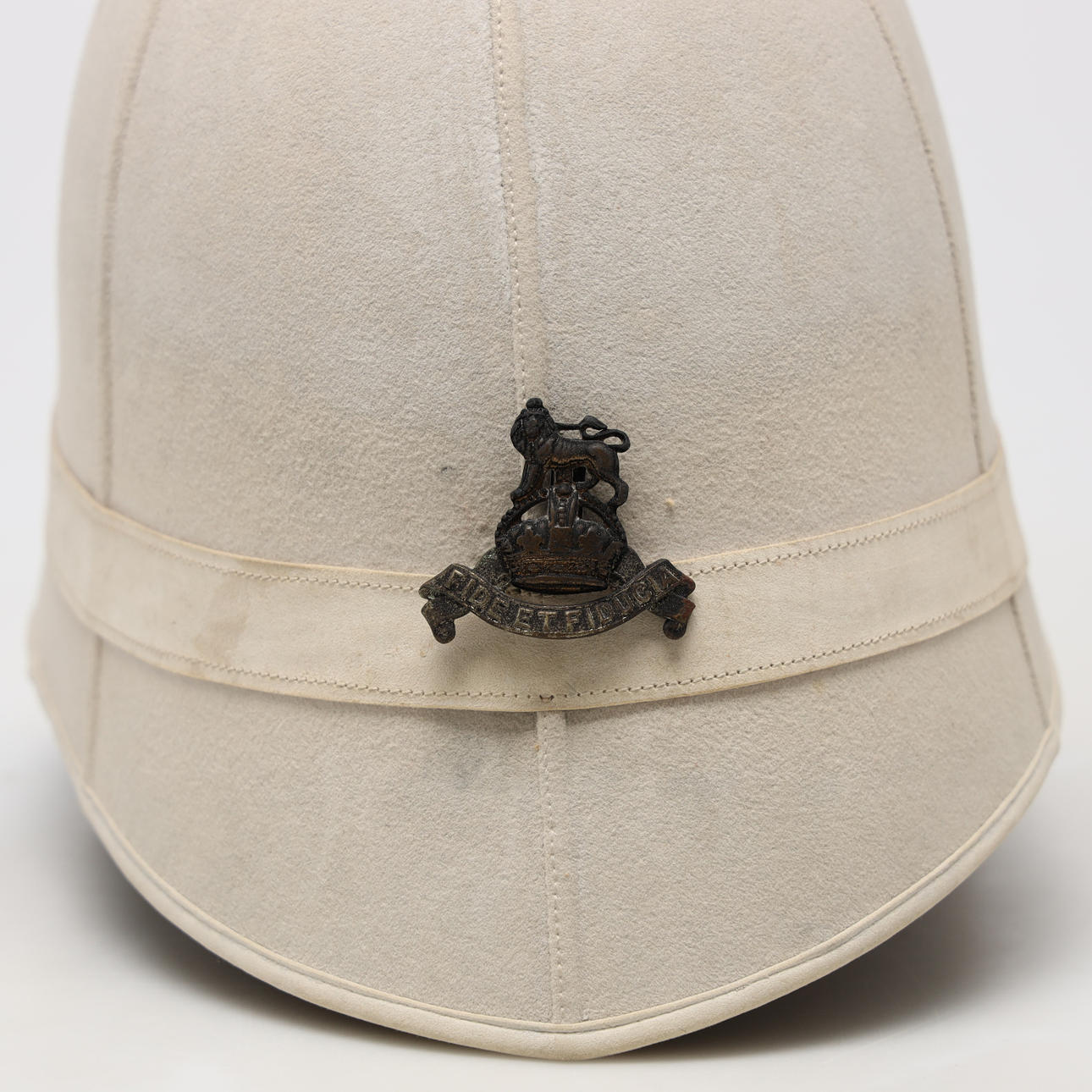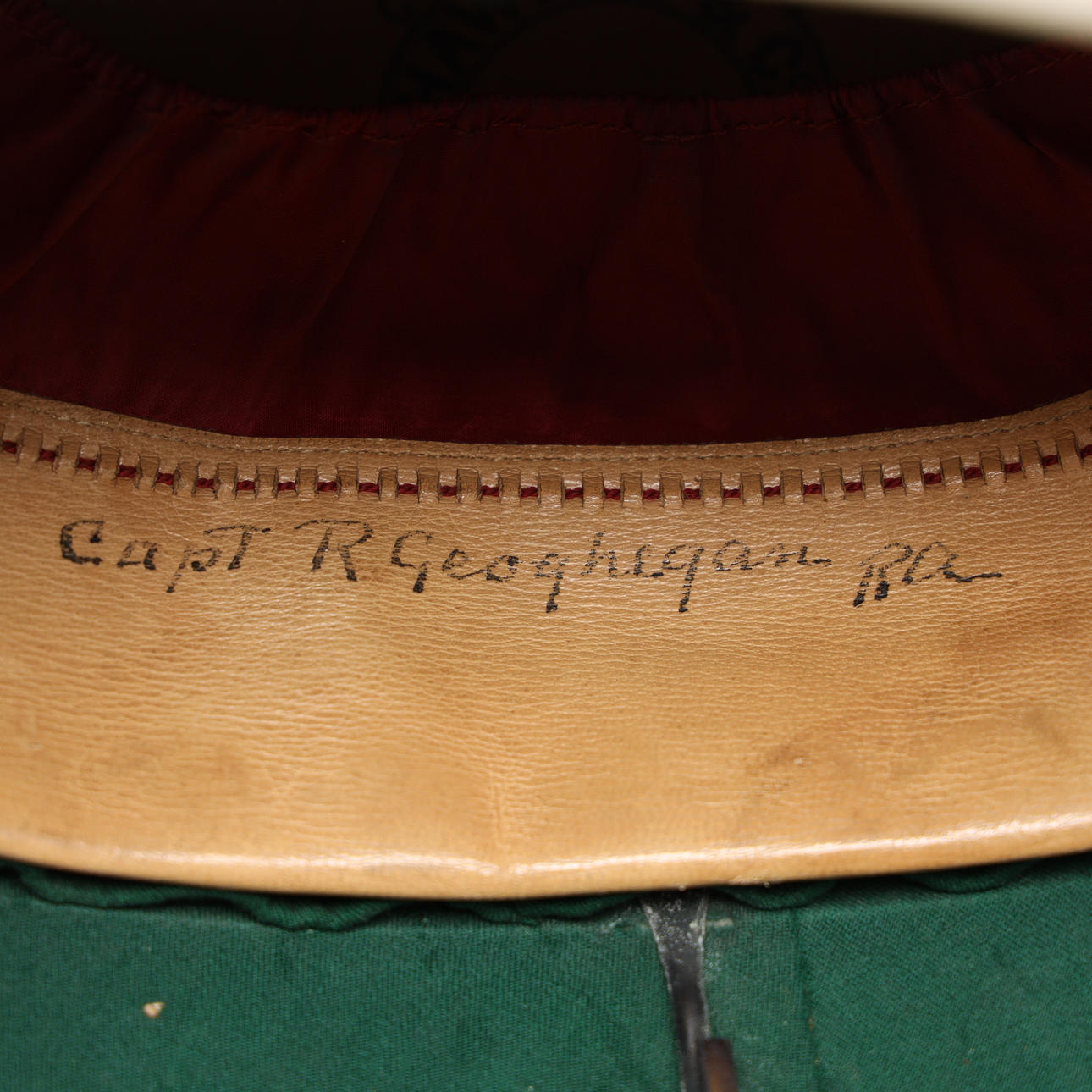 Mössmärke Royal Army 'Fide Et Fiducia'. Mässingstopp i form av granat. Invändigt skinnfoder. Bläckskrift 'Capt R Geoqhegan RA'.