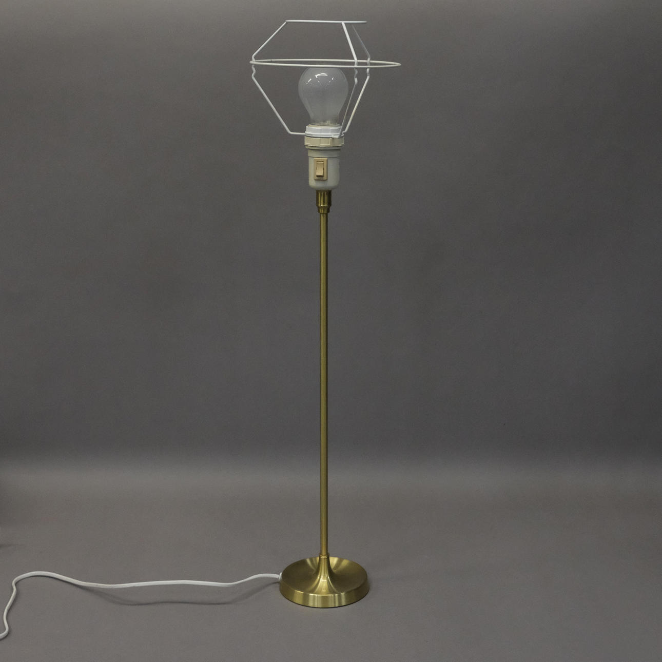 Lampstomme i mässing. SKärmen i vit papp. Total höjd: 78 cm.