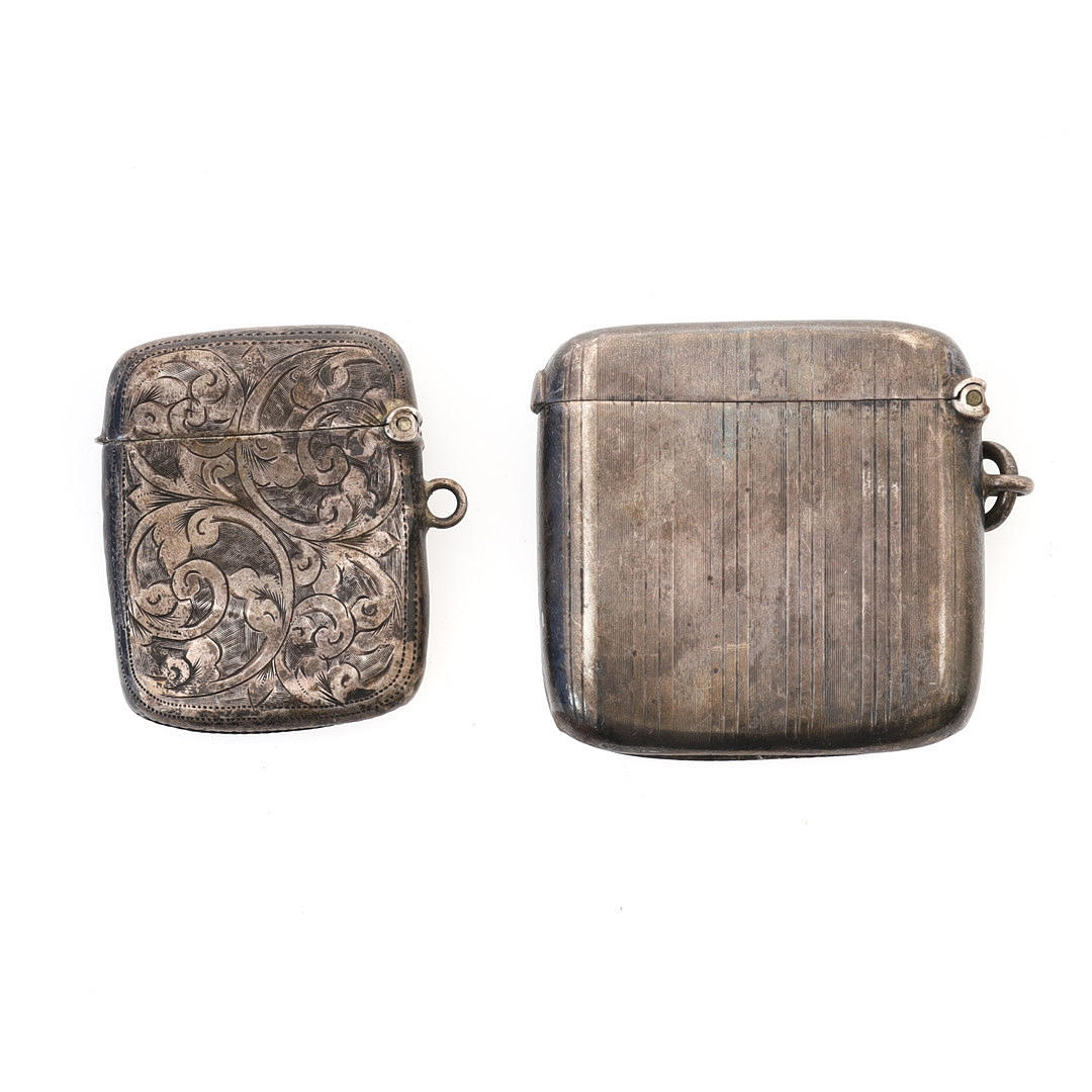William Neale, Chester 1907, med ledig cirkulär kartusch, 4,5 cm kvadrat, och en annan mindre liknande, H. Williamson, Birmingham 1905, lummig scroll graverad runt en ledig hjärtform cartouche, 4cm x 3cm, 42g, 1,35 ozs (2).