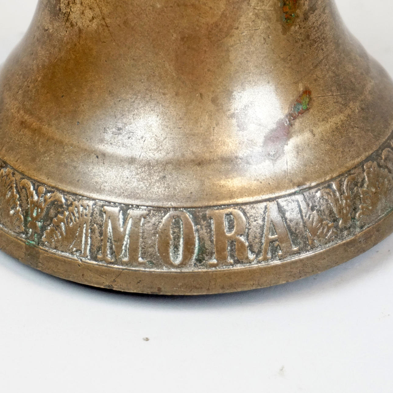 Klocka, 1 kläpp, märkt "Mora F.M.M" Höjd ca 12 cm, diam 12 cm.