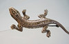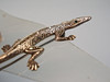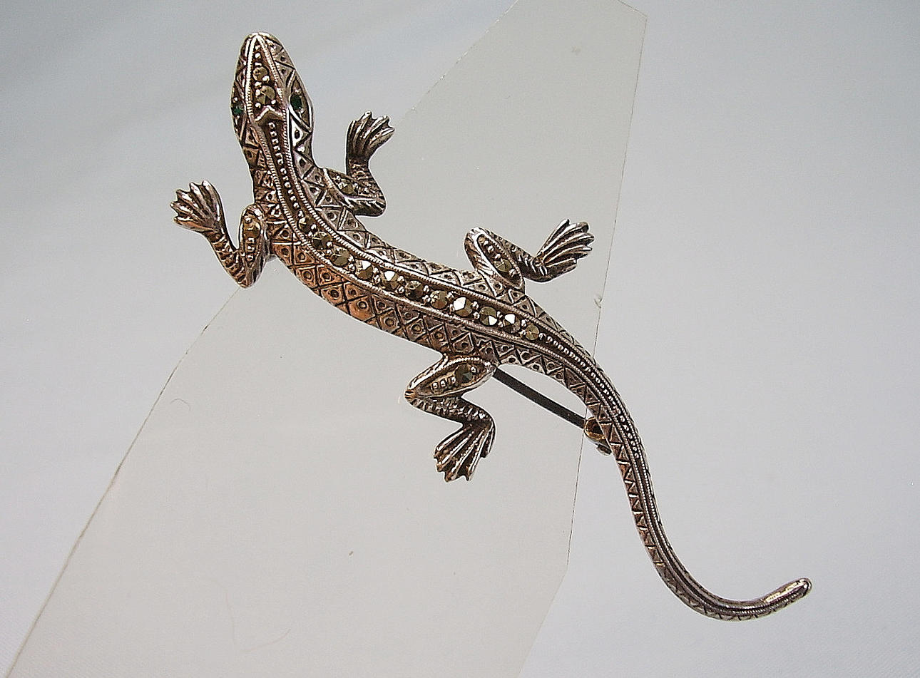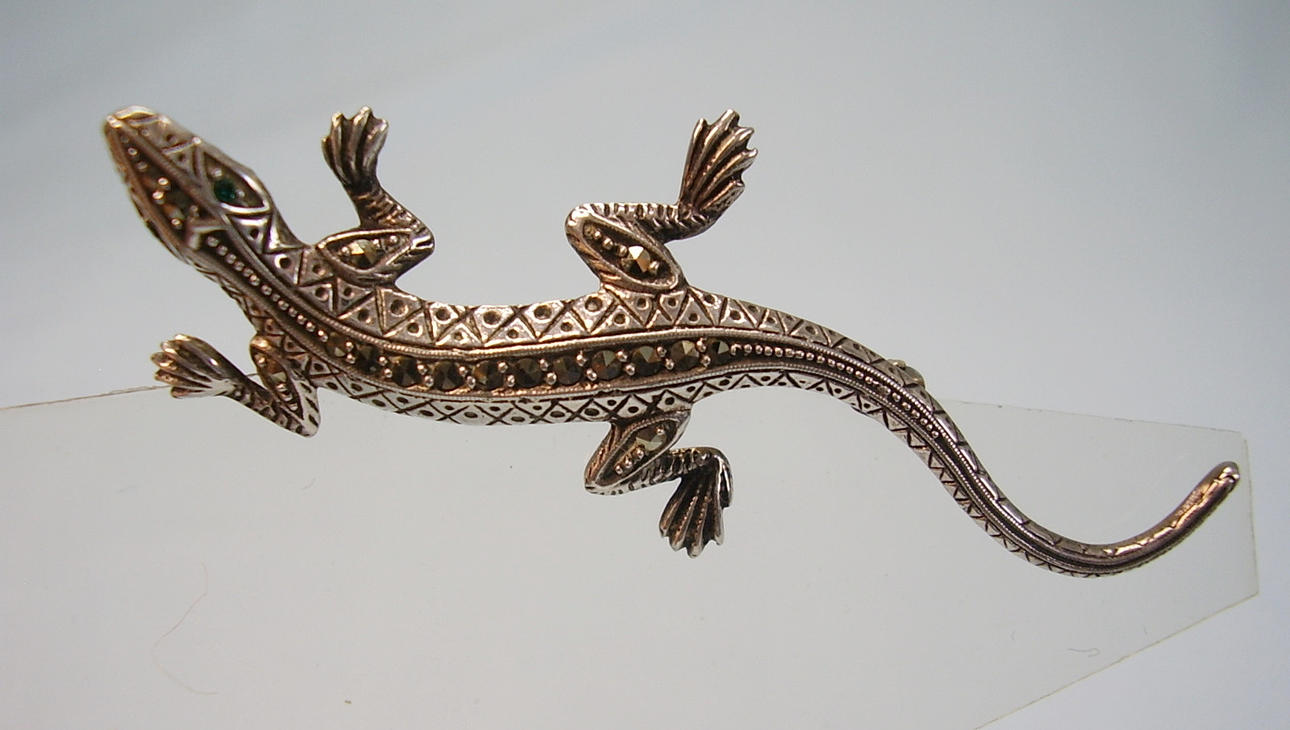 Den är utformad i form av en salamander/ödla och set med fasetterade markasiter. Gröna spineller gränsar som ögon.