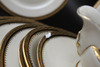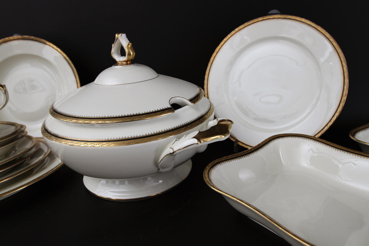 Benfärgat porslin med förgylld dekor. 12 mattallrikar, 12 djupa tallrikar, 11 halvtallrikar, 11 assietter, 4 fat, 4 skålar, såssnipa samt terrin.