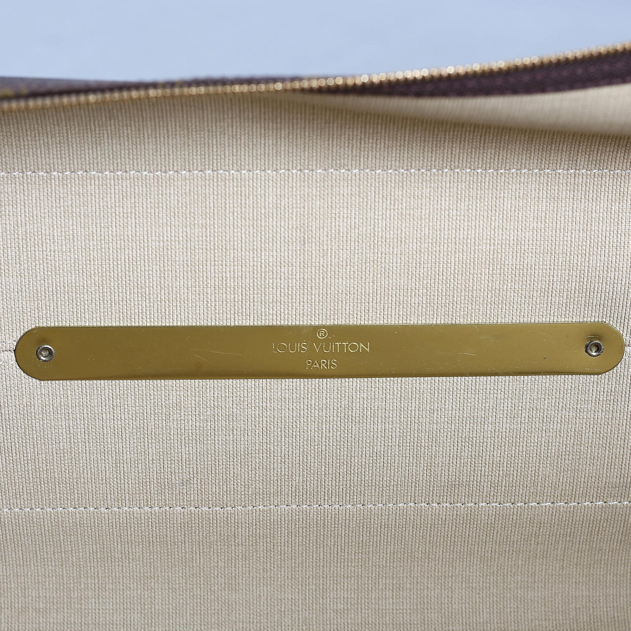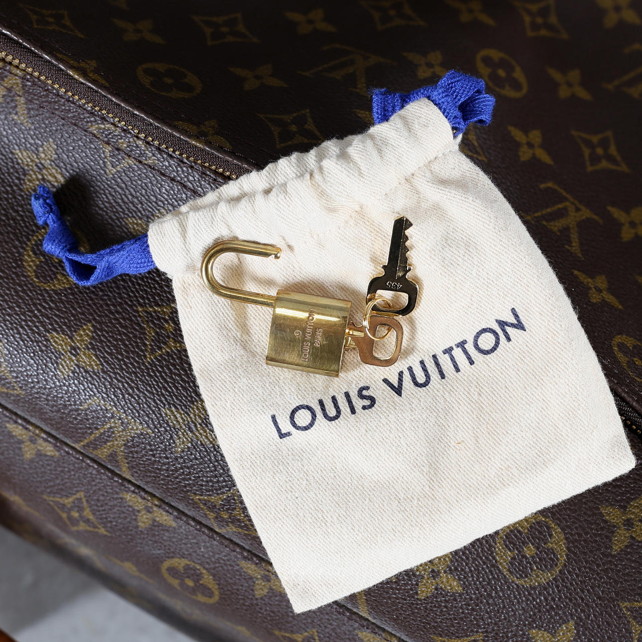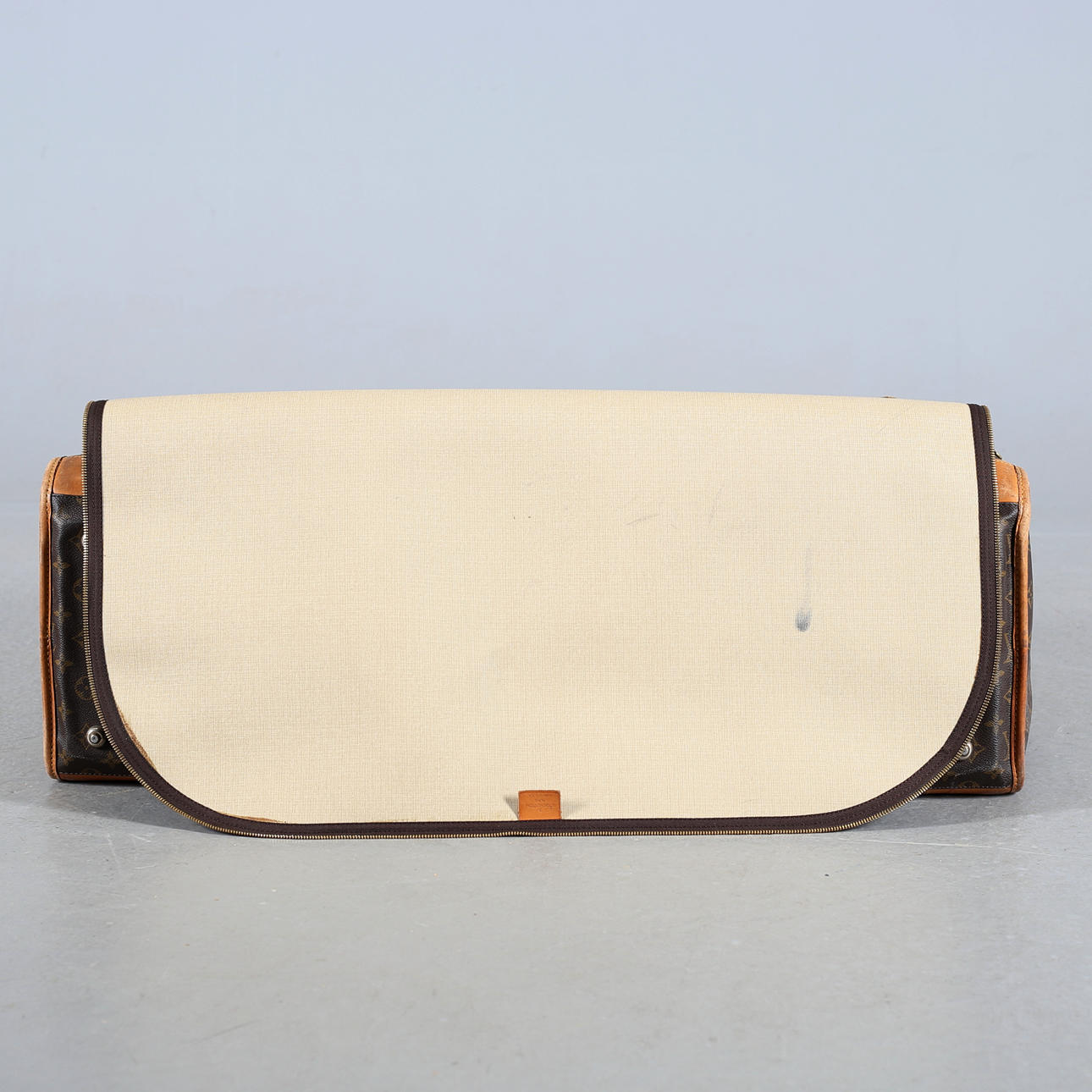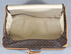 Monogramcanvas med detaljer i skinn och mässing. Försluts med dragkedja. Två mindre fack inuti med knappförslutning samt två resårband. Medföljande lås samt nycklar.