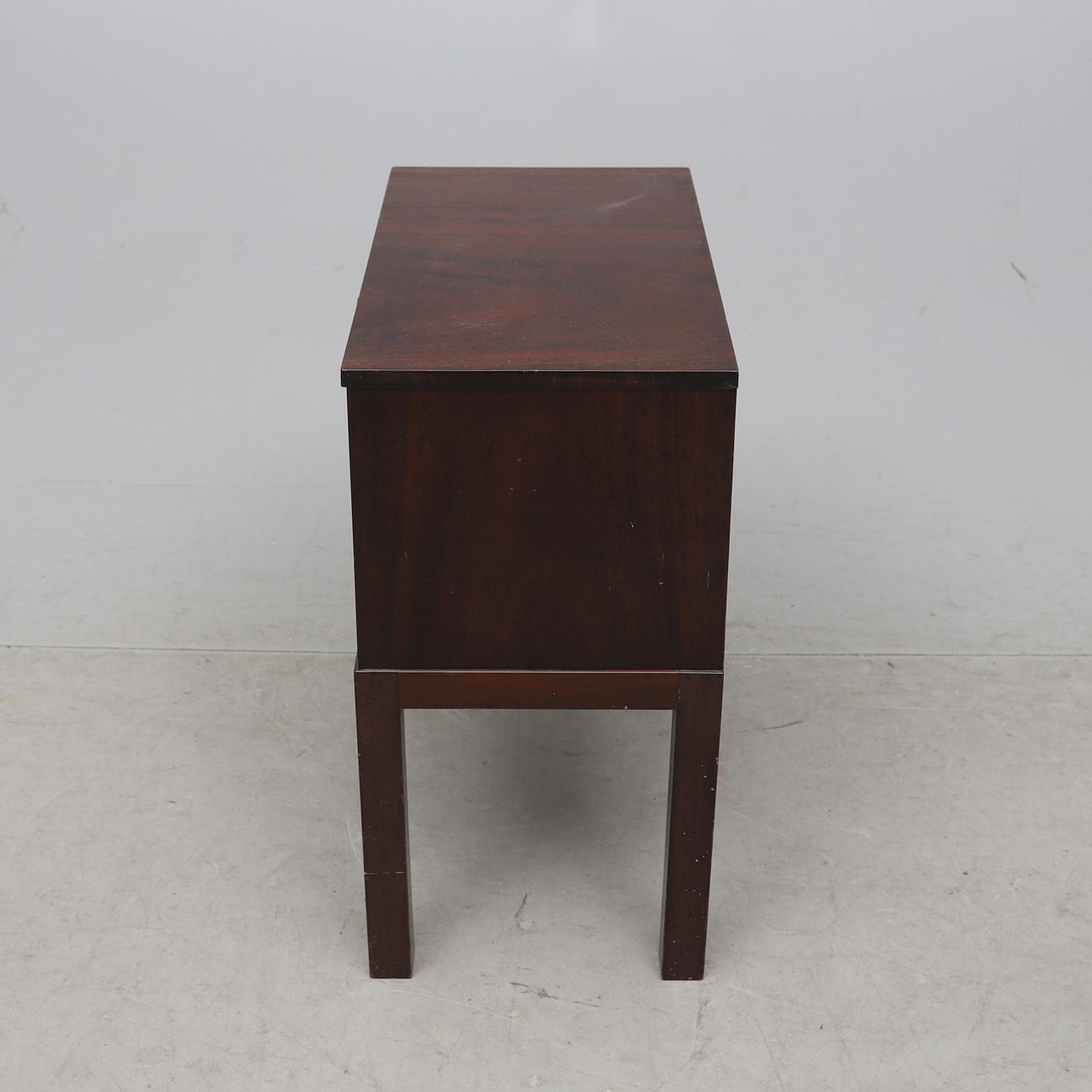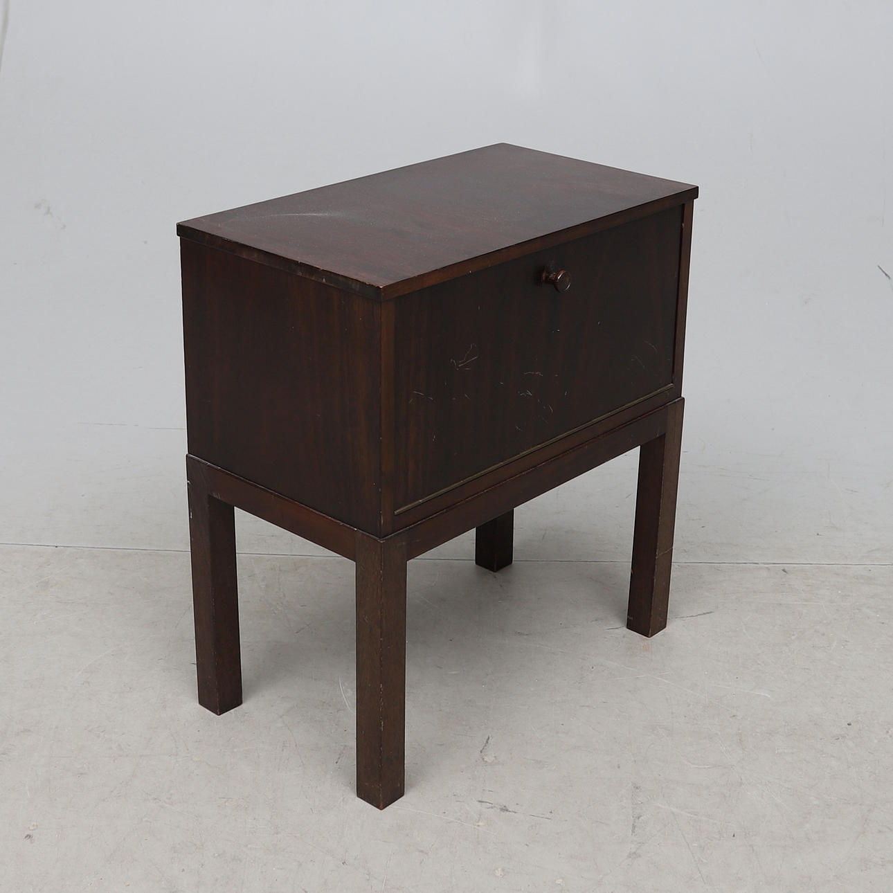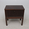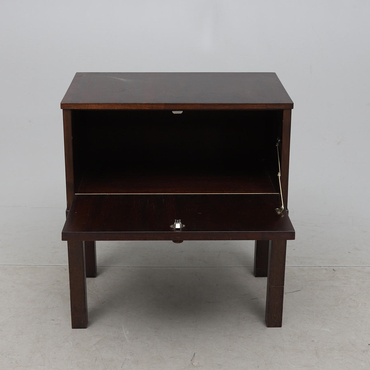 Fanerad med mahogny. Nedfällbar lucka med bakomliggande hyllplan. Längd ca 50, bredd 28, höjd 56 cm.