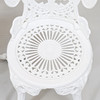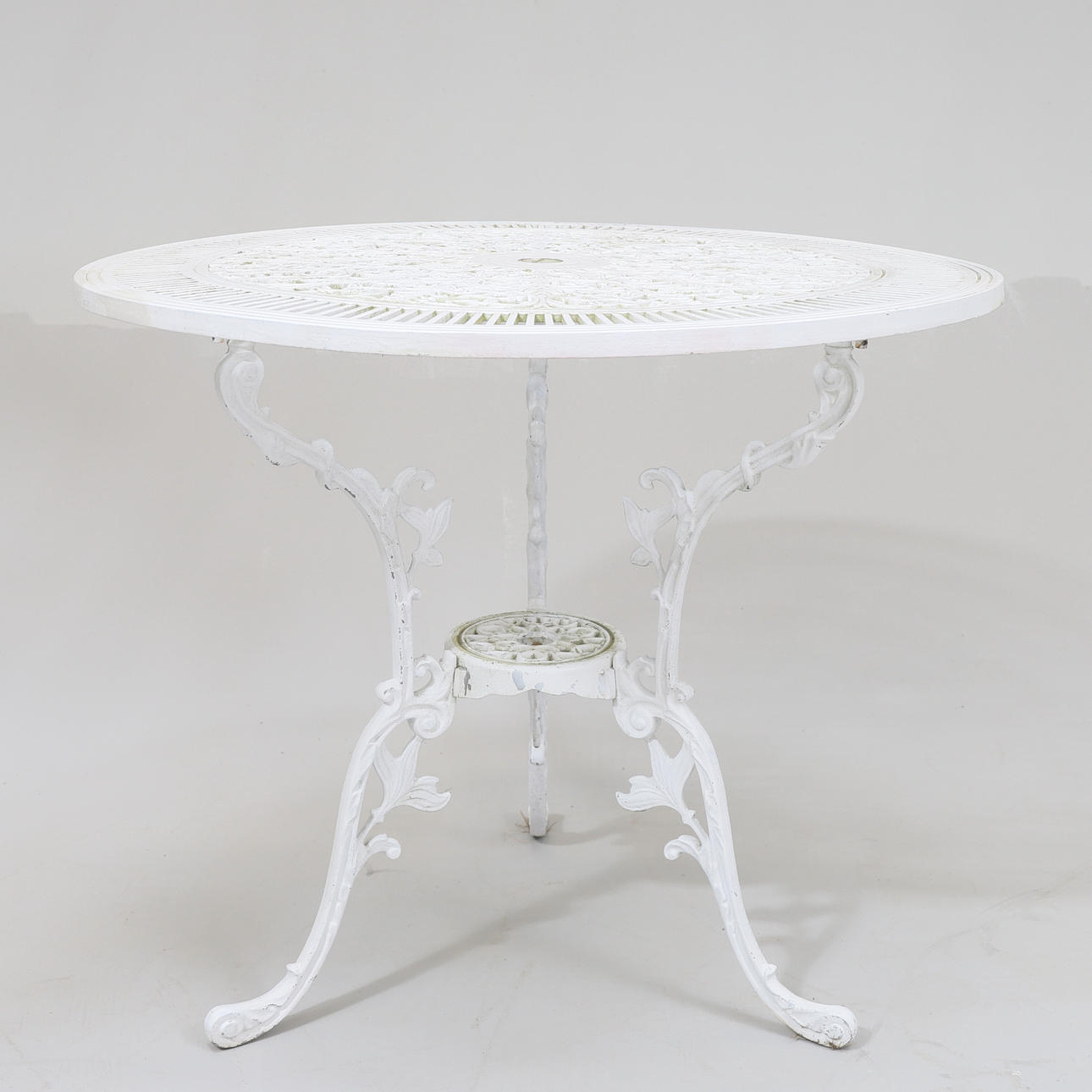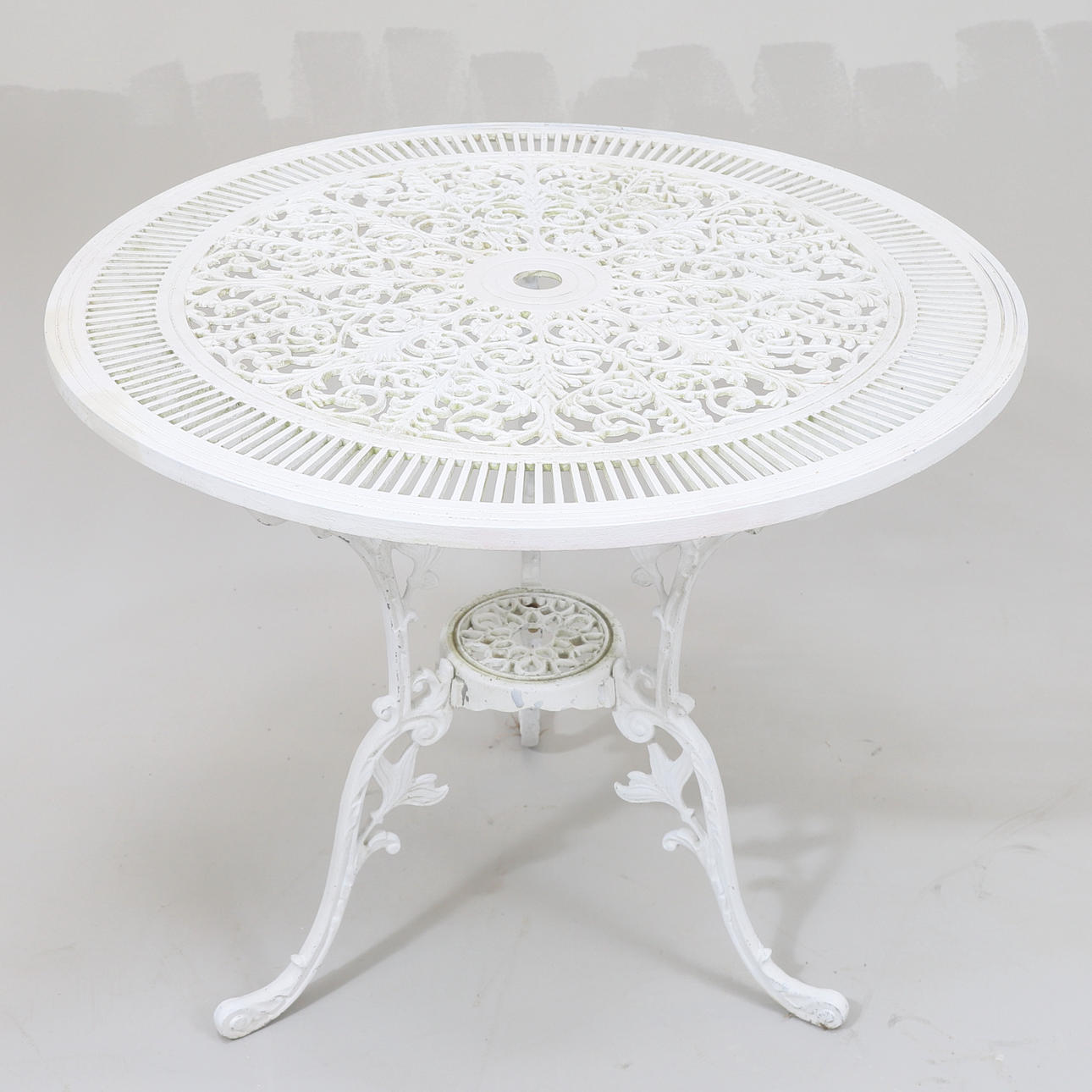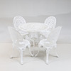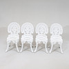 Bord och 4 stolar. Målad metall. Bordets diameter 80. Höjd 69. Stolarnas höjd 86 cm.
