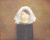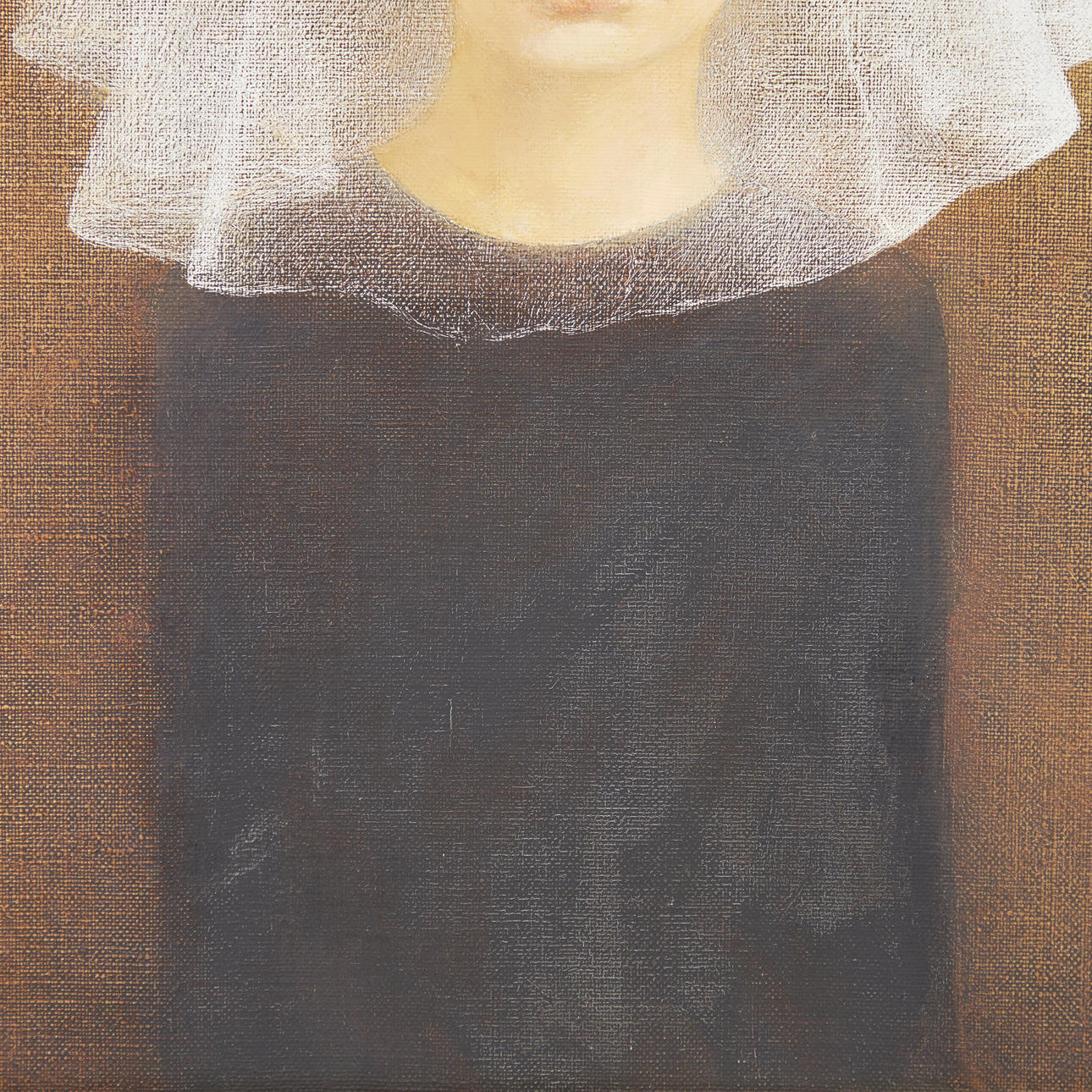 Igor Melnikov (f. 1956), målning, 'Blivande kvinna', olja på duk. Porträtt i axelutskärning föreställande en ung flicka i ansiktet med en vit transparent kort slöja mot en ljusbrun obestämd bakgrund, signerad längst ner till höger och märkt med en självhäftande etikett på baksidan, 42.5x54cm (52.5x63cm).