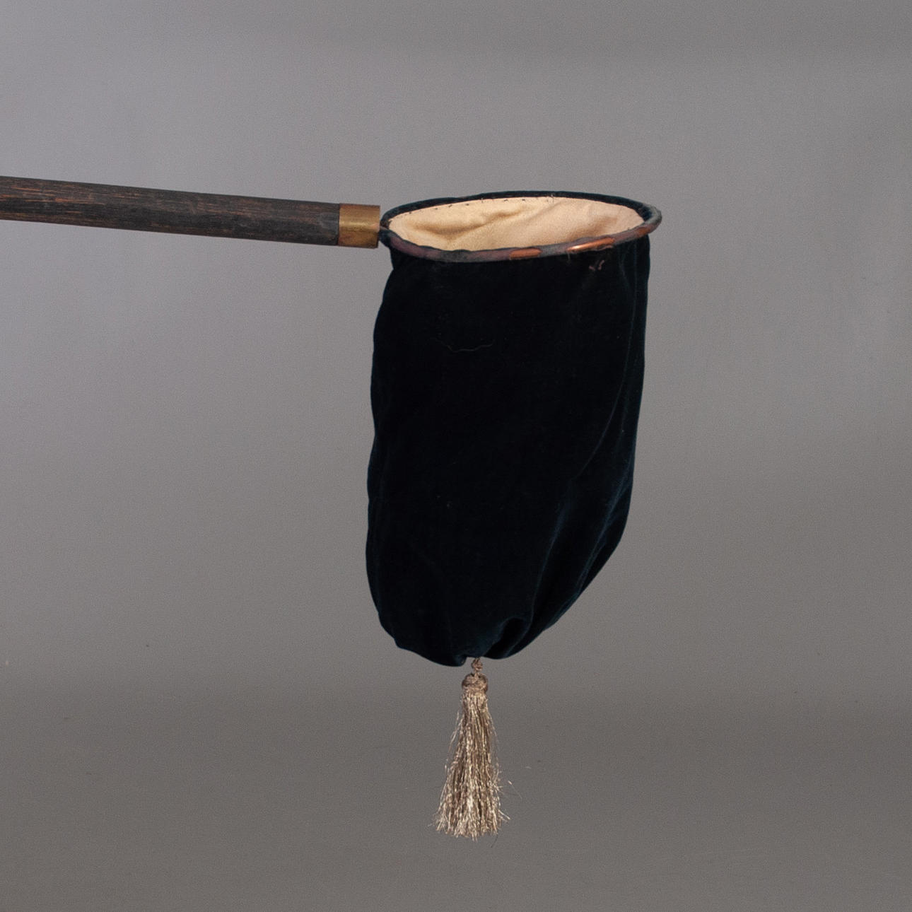 KOLLEKTHÅV, omkring 1900, religiöst bruk, svart sammet med förgylld hängande frans, sydd mot metallring (förefaller vara i koppar), invändigt klädd med kraftig beigefärgad textil, originalskaft i svärtat trä med dekor i mässing närmast håven, längd 115 cm, håv diameter upptill kant 13 cm, håv längd exkl. frans 22 cm.