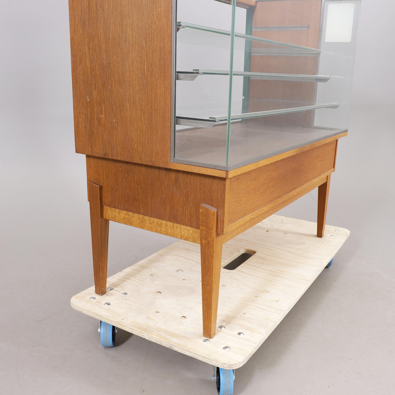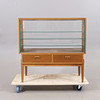 Glas till ställyta, samt en glashylla saknas.