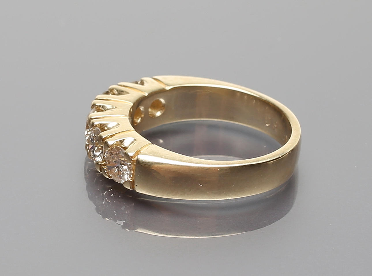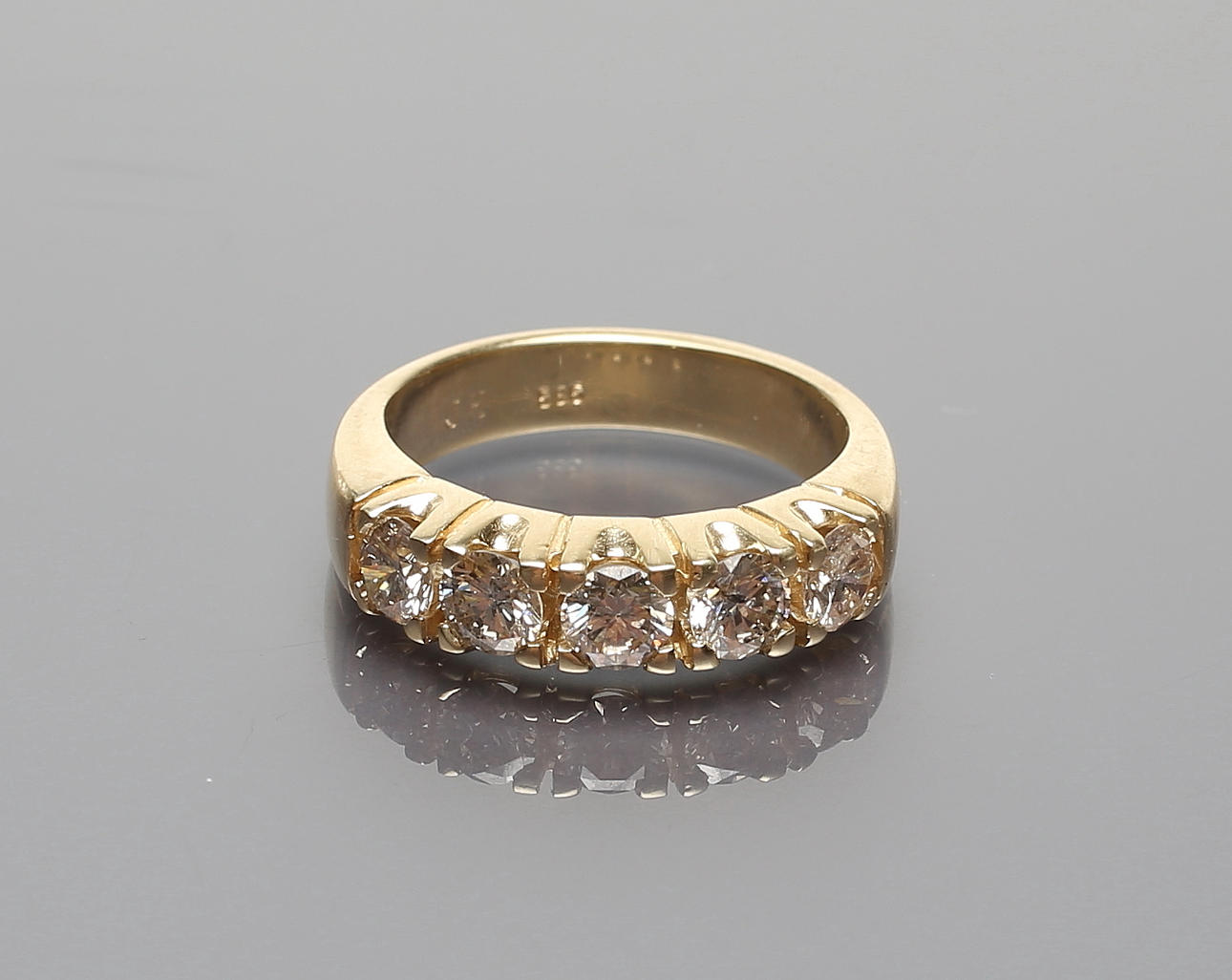 585/000 GG, 6,8 g brutto Set med 5 briljantslipade diamanter, tillsammans 1.26 ct., cr/pi. RW 53.