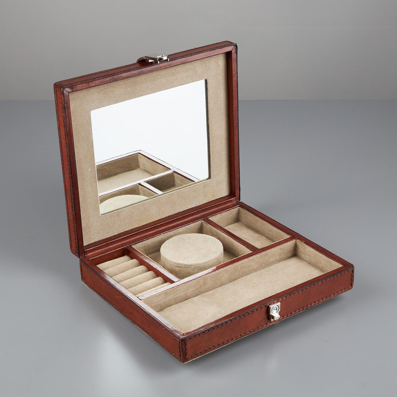 21 x 18 cm, höjd 4,5 cm, med spegel och inredning.