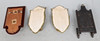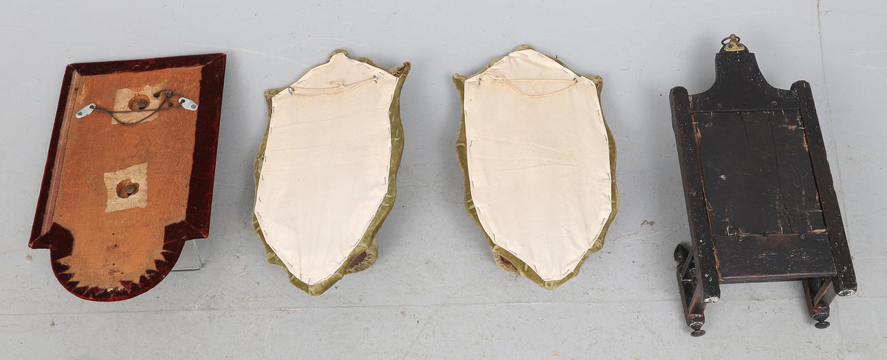 täckt av vinröd plysch velour och appliceras med en rektangulär viktoriansk marginalspegel med upprepad roundelram, en plattglashylla nedan, 40 cm hög x 23,5 cm bred, ett par liknande väggfästen, täckt med grön sammet och infälld med en oval spegel, 40 cm hög x 21,5 cm bred och en Edwardian mörkfärgad färgad trä väggfäste, med fasad spegel och hylla under, 37 cm hög x 18 cm bred (4)