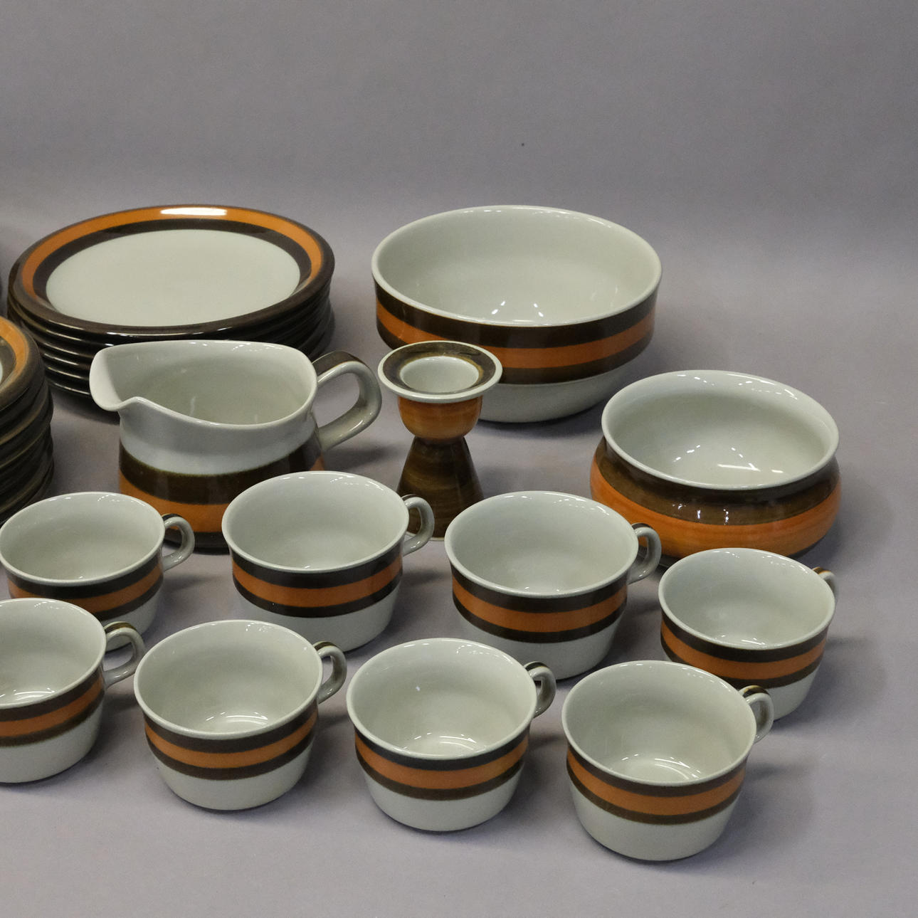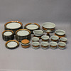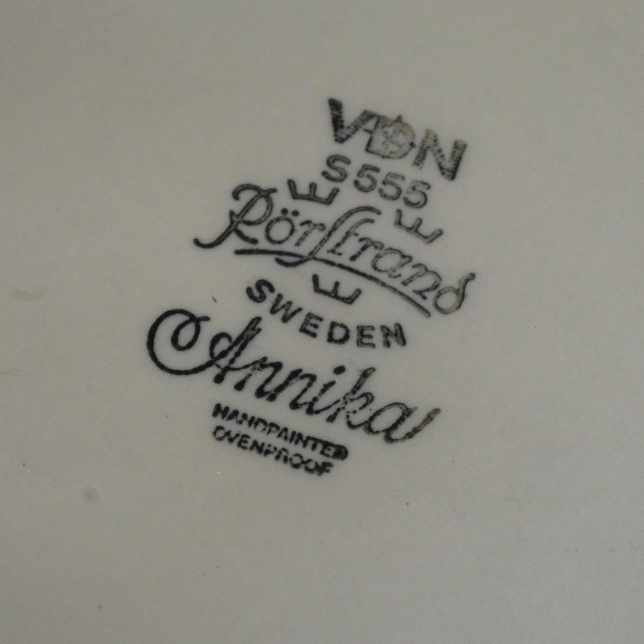 Sex koppar, höjd: ca 5,5 cm, 10 fat, diameter: 14 cm, sju mattallrikar, diameter: ca 24,5 cm, sex assietter, diameter: 21 cm, assietter tio, diameter: 18,5 cm. Äggkopp, höjd: ca 10 cm, Skål, höjd: ca 8,5 cm, diameter ca 18 cm, burk utan lock, höjd: ca 7 cm, diameter: 13 cm. Kanna, höjd: ca 10 cm, burk med lock, höjd: ca 7 cm, Koppar med fat, ett par, kopphöjd: 6,5 cm. Fatens diameter: 16 cm.