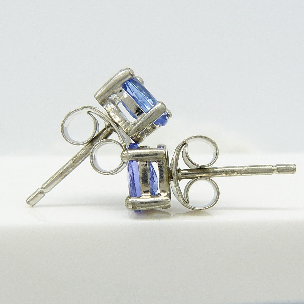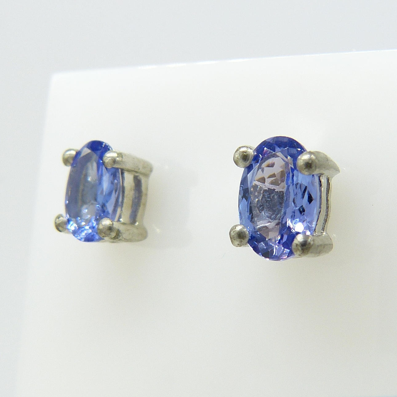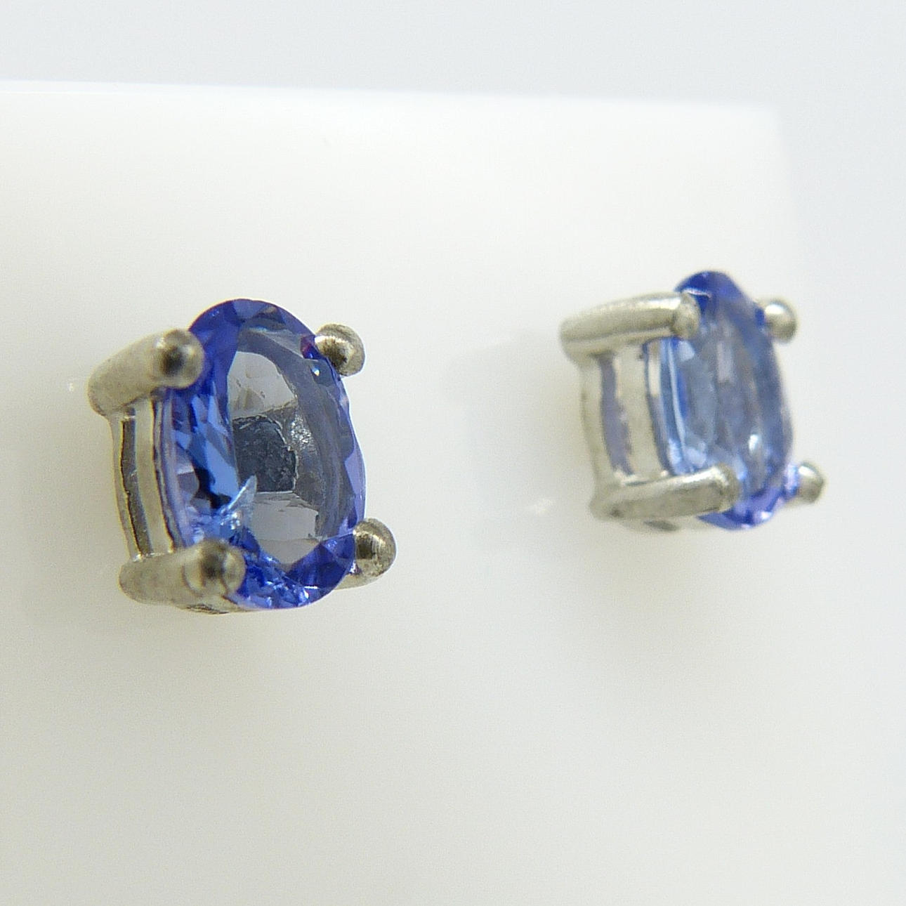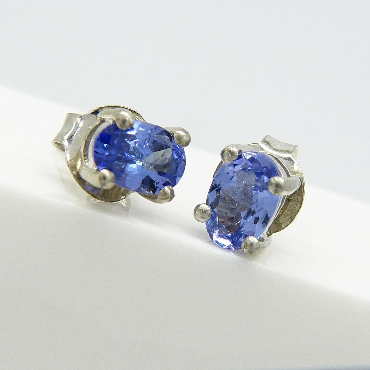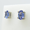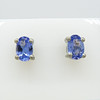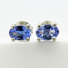 Varje tanzanit ädelsten i detta par har en bra färgmättnad och mäter 6 x 4 mm.