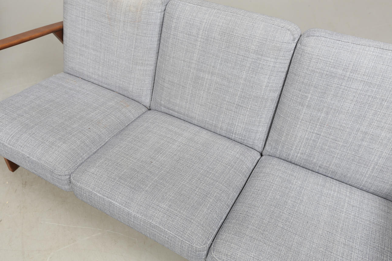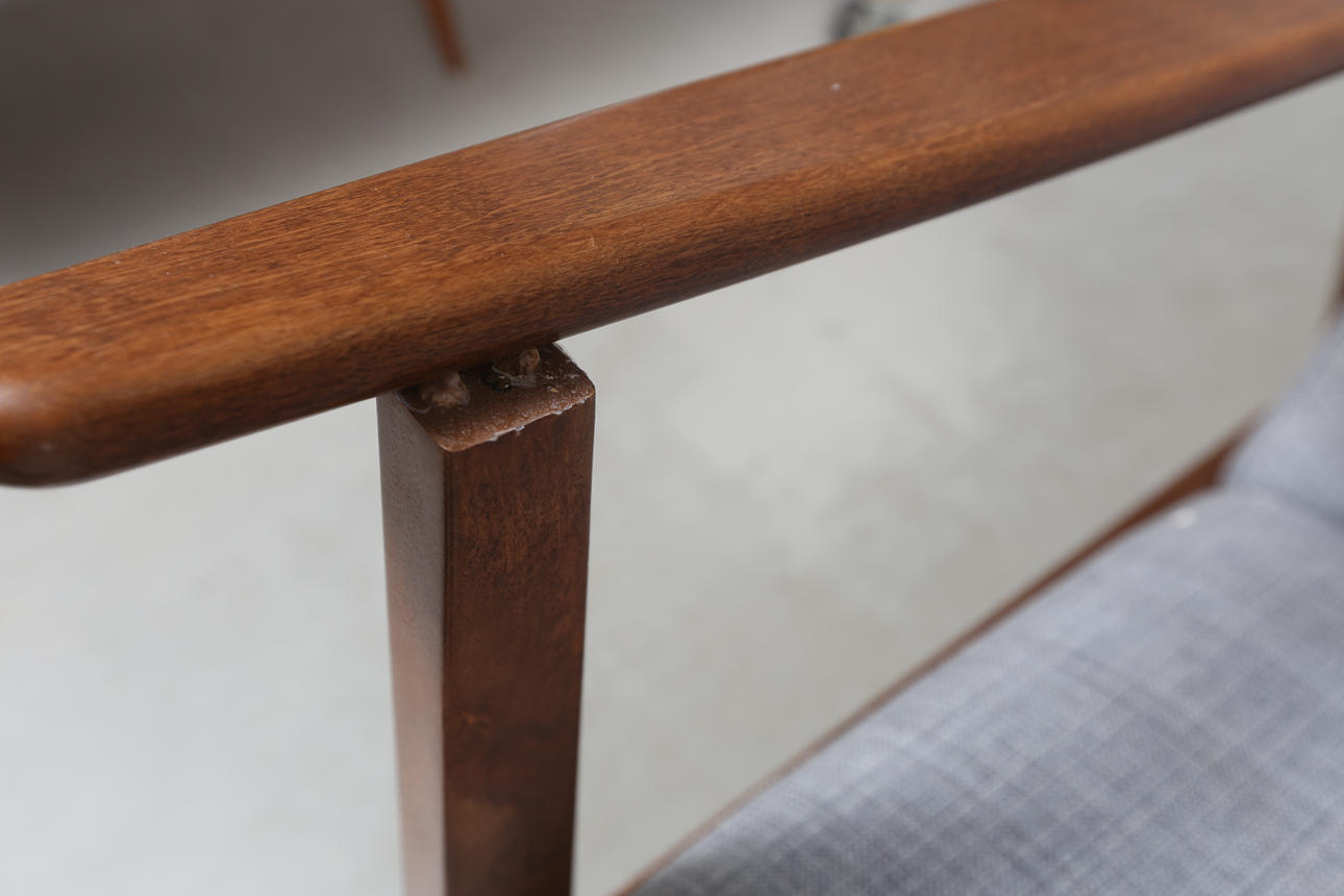 Bruksslitage. Armstöd med limförstärkta fogar. Ett armstöd löst. Klädsel med fläckar.